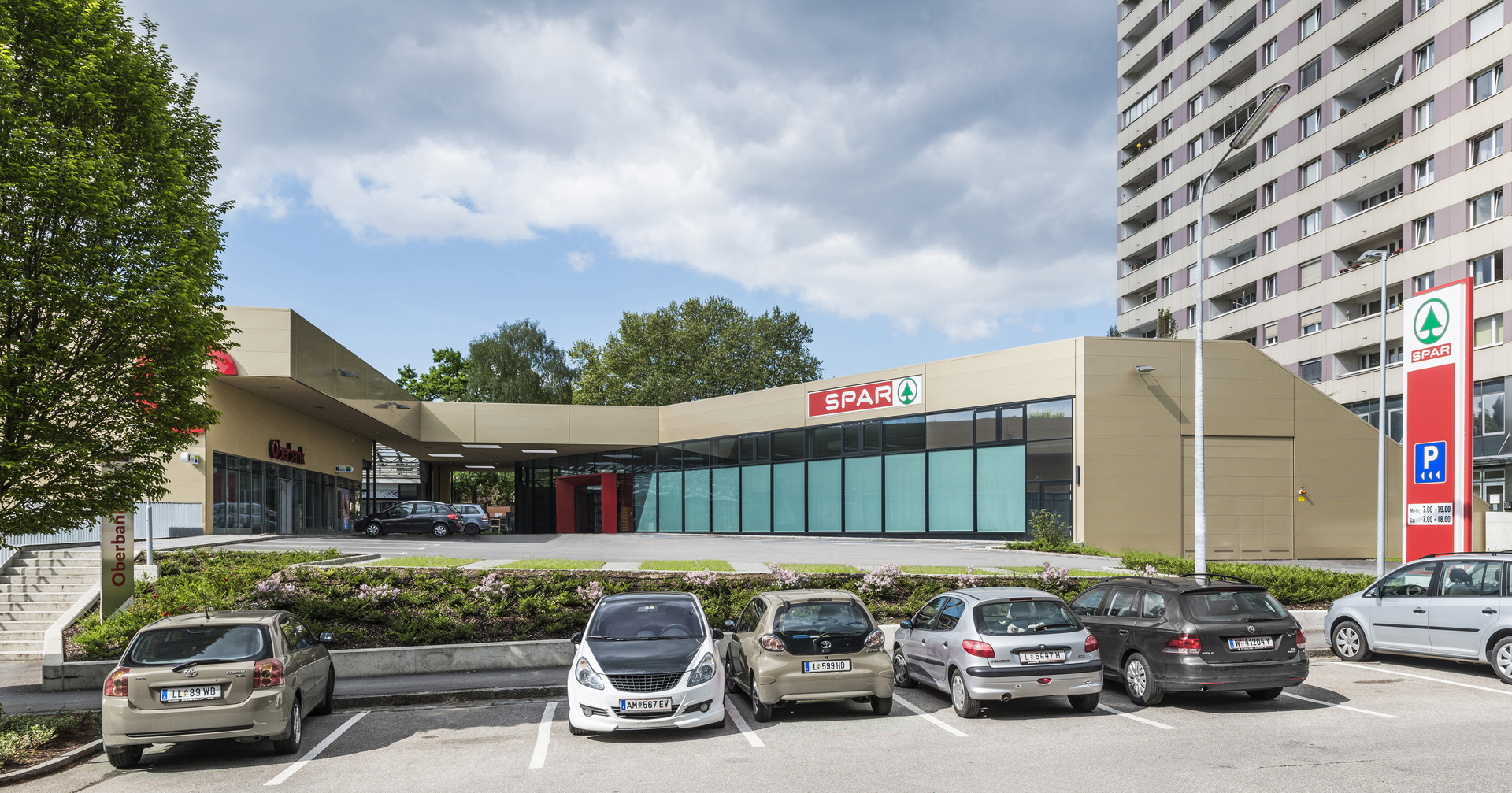 Die Neuordnung des nordwestlichen Teils des Komplexes ermöglicht es, das Dach des neuen SPAR- Marktes intensiv zu begrünen und den Bewohnern als Parklandschaft mit Sitzgelegenheiten und Kleinkinderspielplatz zur Verfügung zu stellen. Die Begrünung der Dächer attraktiviert die Dachlandschaft als 5. Fassade vor dem Hochhaus mit seinen zahlreichen Loggien und wirkt sich positv auf das Kleinklima des Areals aus.