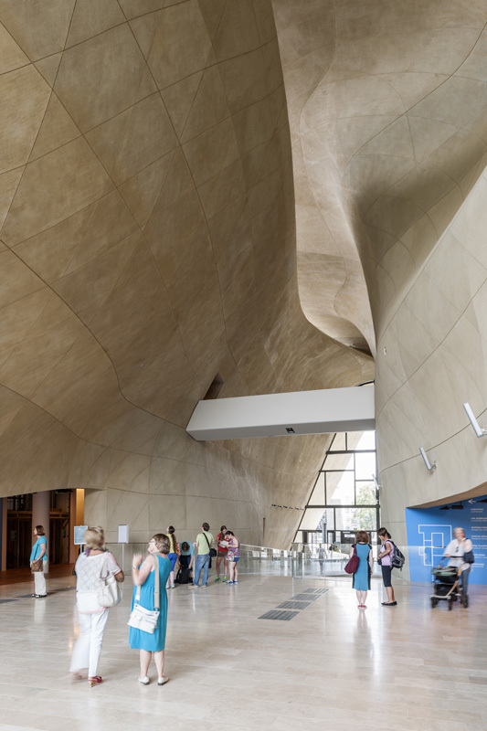 Drinnen erst, in diesem Canyon, der von den wenigsten nur als amorphe Gesteinsformation verstanden werden will, weil das 2. Buch Mose schwerer wiegt als jeder architektonische Grundgedanke, werden die Worte der beiden Hausverantwortlichen manifest. Dramatische Blicke, dramatische Räume tun sich hier auf. Es ist dies die angeblich größte zweiachsig gekrümmte, monolithisch zusammenhängende Wandoberfläche, die je gebaut wurde: 63 Meter lang, fast 25 Meter hoch, wenn man die bauchige Fundamentbasis im Untergeschoß, wo sich die 4000 Quadratmeter große Hauptausstellung befindet, miteinbezieht.