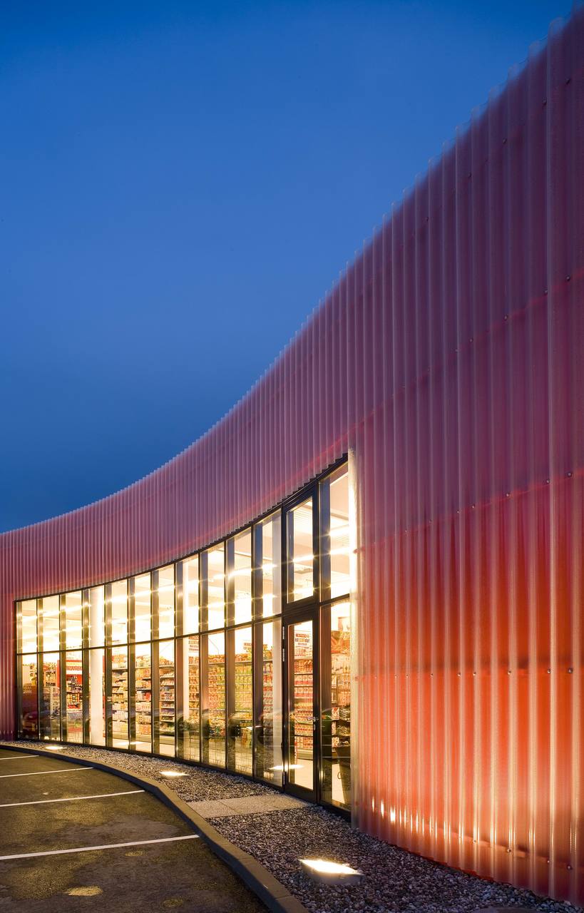 Der Baukörper spielt von seiner Erscheinung mit den Themen Bewegung, Leichtigkeit und Verpackung. Die nierenartige Form bewirkt eine spürbare Bewegung im Innen- und Außenraum. Die Verpackung bilden - normalerweise nur bei untergeordnete Bauteile verwendeten - Wellacrylplatten, welche - an der Rückseite mit einer Wabenstruktur ausgestattet - oben und unten offen, mit Distanz zu den raumabschließenden roten Blechpaneelen montiert wurden. Daraus ergibt sich Weichheit und Tiefenwirkung, Leichtigkeit und Transparenz und schafft den geforderten Mehrwert eines Marktplatzes. (Text: Architekt)