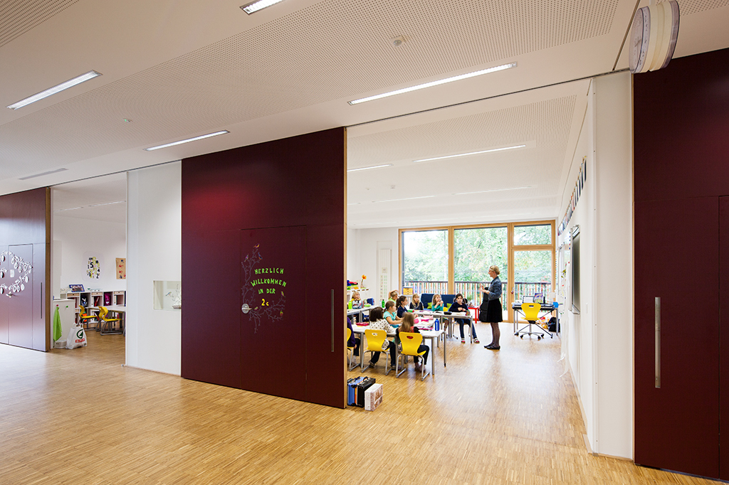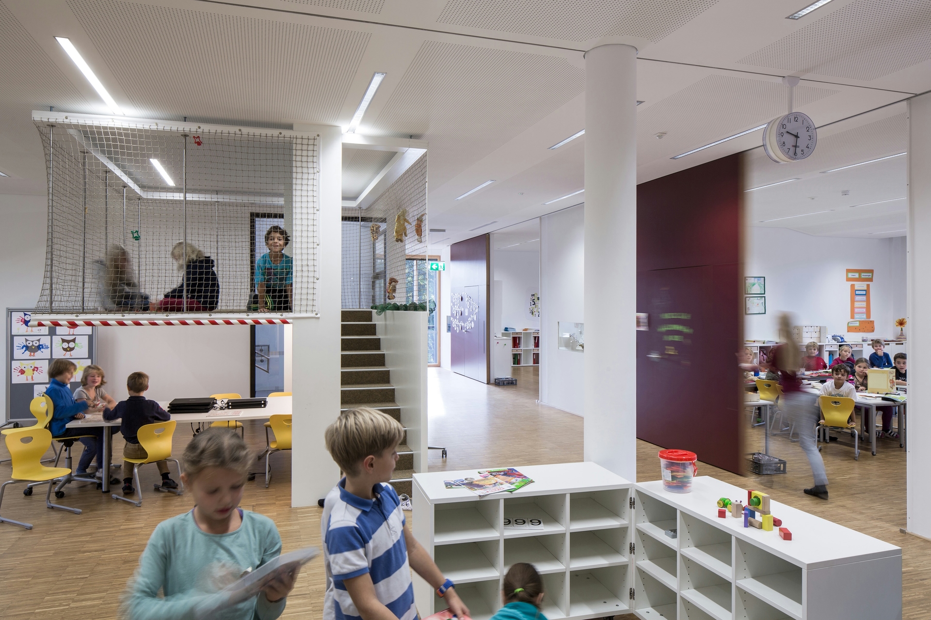Vom überdachten Eingangsbereich gelangt man in die Eingangshalle, an die Räume für die Direktion sowie Empfangs-, Medien- und Musikraum anschließen. Diese sind den Anlässen entsprechend durch mobile Trennwände miteinander kombinier- und erweiterbar, weshalb sie auch für externe Veranstaltungen verwendet werden können. Der 'interne Schulweg` führt von der Halle über die Zentralgarderobe auf der mittleren Ebene in die Cluster auf der selben bzw. der oberen Ebene. Die Cluster sind als „Lernlanschaften“ ausgebildet, in denen es auch „Klassenzimmer“ geben kann, die aber vor allem als flexibel nutzbare offene Räume verstanden werden. Durch raumhohe Schiebewände zwischen Klassenzimmern und zentralem Gemeinschaftsraum mit jeweils zwei Lern- und Leseinseln enstehen differenziert gestaltbare offene Räume, die mehr einen großen Wohnzimmer als einer Schule ähneln. In die unterste Ebene mit Turnsaal und Sonderunterrichtsräumen gelangen die Schüler über eine breite interne Treppenanlage, die sie bereits am Weg dorthin am Geschehen im Turnsaal partizipieren lässt.