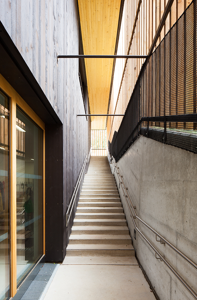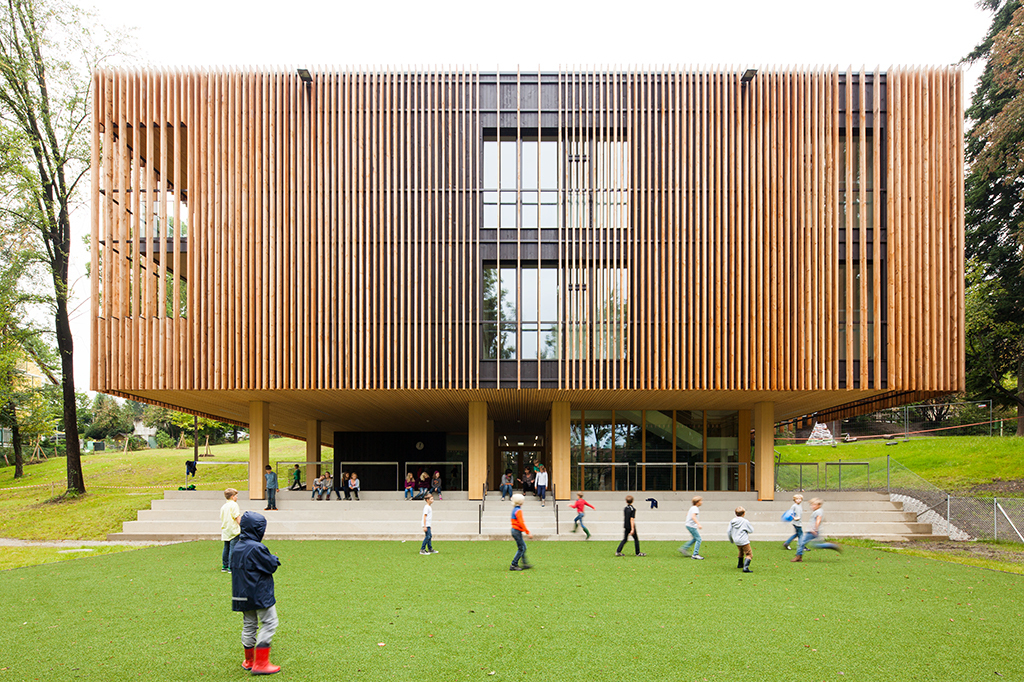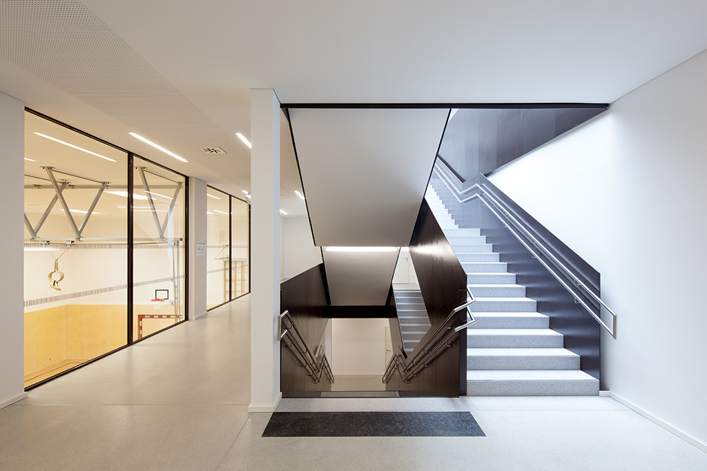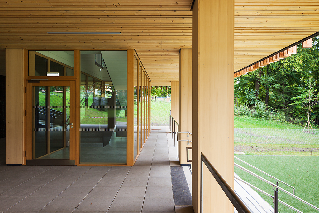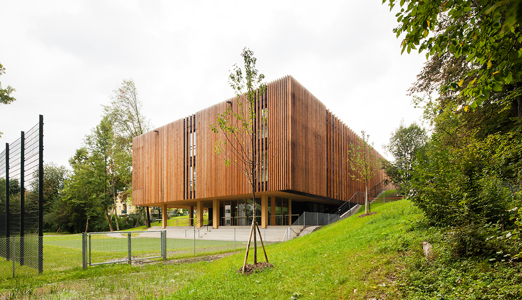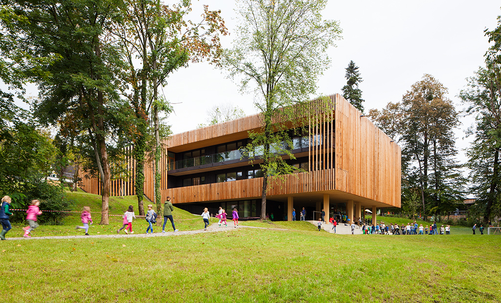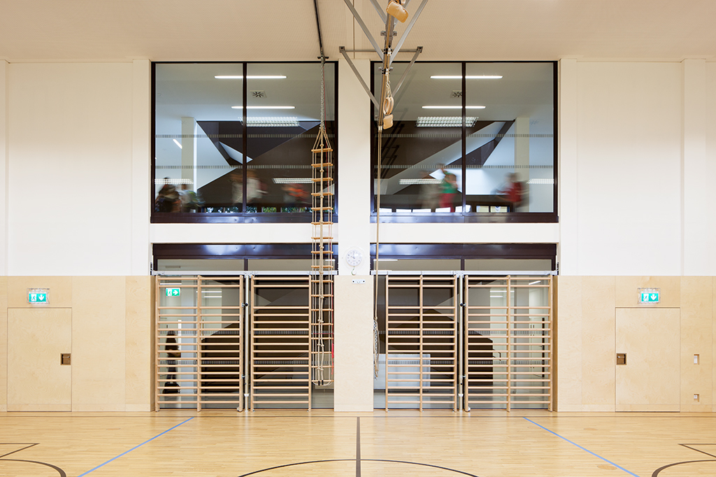 Das dreigeschoßige Volumen ist so ins Gelände eingefügt, dass es optisch zweigeschoßig wirkt. Der Eingang liegt an der Nordwestecke des Gebäudes auf dessen oberster Ebene. Vom überdeckten Eingangsbereich gelangen auch externe Nutzer witterungsgeschützt zum Turnsaal auf der untersten Ebene. Eine Hülle aus sägerauen Lärchenholzlamellen umschließt das Gebäude allseitig, wobei sie vor Aufenthaltsbereichen durch Aufweitung des Lamellenabstands transparent ausgeführt ist. Auf Eingangsniveau befinden sich Foyer, Direktion, Medien- und Musikraum sowie ein Cluster; auf der Ebene darunter wieder ein Cluster und die Zentralgarderobe. Die Sonderunterrichtsräume im untersten Niveau sind gegenüber der Hauptfassade zurückversetzt, sodass nicht nur die optische Anbindung an den Außenraum gewährleistet ist, sondern auch eine überdeckte Freiklasse und Sitzstufen zur Spielwiese hin realisiert werden konnten.