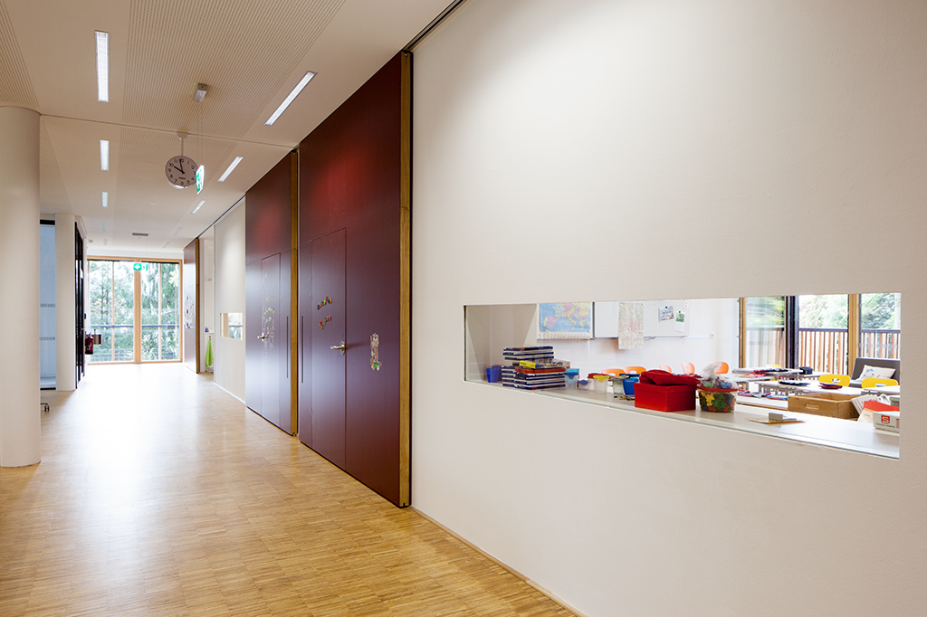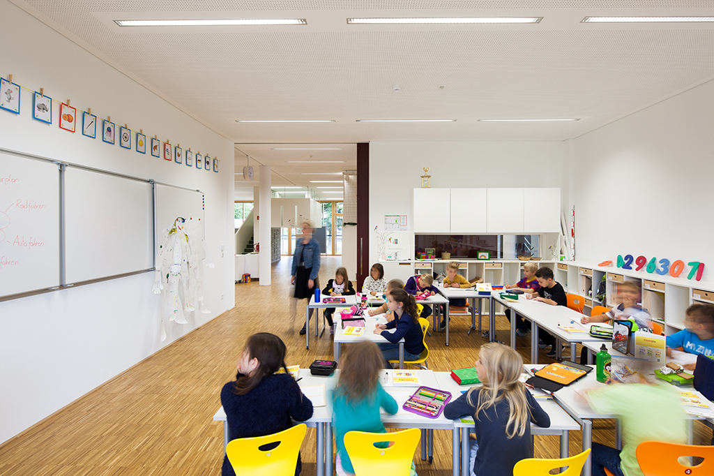 Durch die wenig gegliederte Gebäudestruktur, die Lage der warmen Räume übereinander, die kontrollierte Lüftungsanlage mit Wärmerückgewinnung und die Ausführung in Holz-Mischbauweise – Gebäudehülle aus vorgefertigten hochwärmegedämmten Holzelementen – erreicht die Volksschule den zertifizierten Passivhausstandard. Sämtliche Einbauelemente (Wände, Dachfenster, Fenster, Türen) und Wärmebrücken sind zertifiziert passivhaustauglich. Die Speichermasse der in Massivbauweise errichteten Decken dienen der Bauteilaktivierung. Nominierung zum Staatspreis für Architektur und Nachhaltigkeit 2015.
