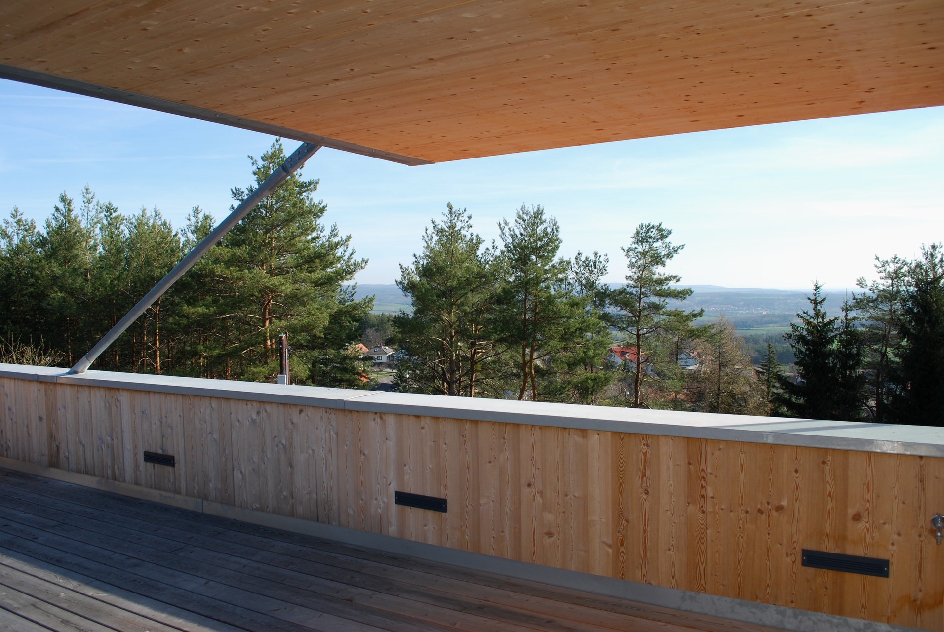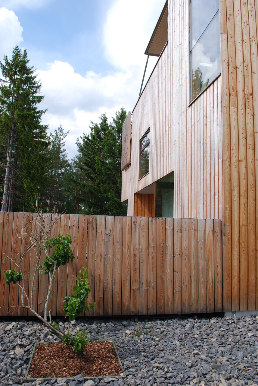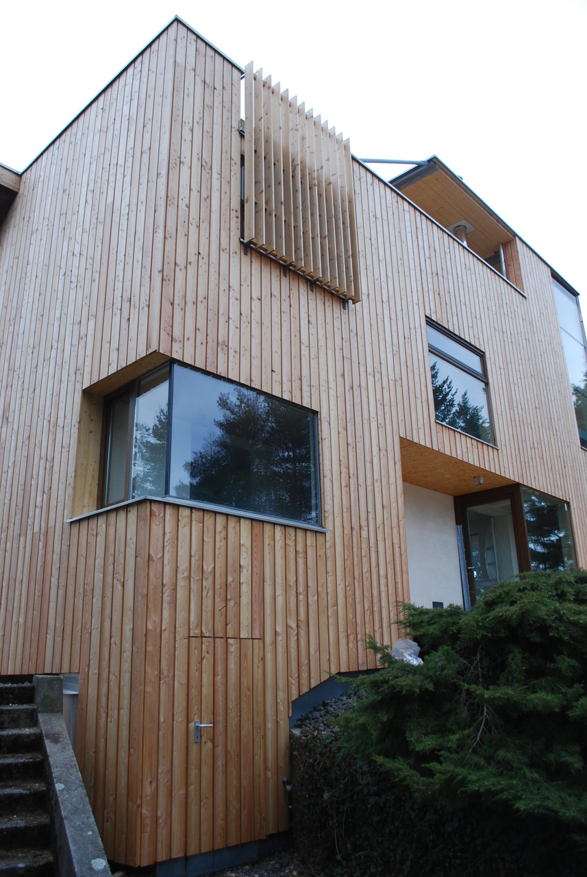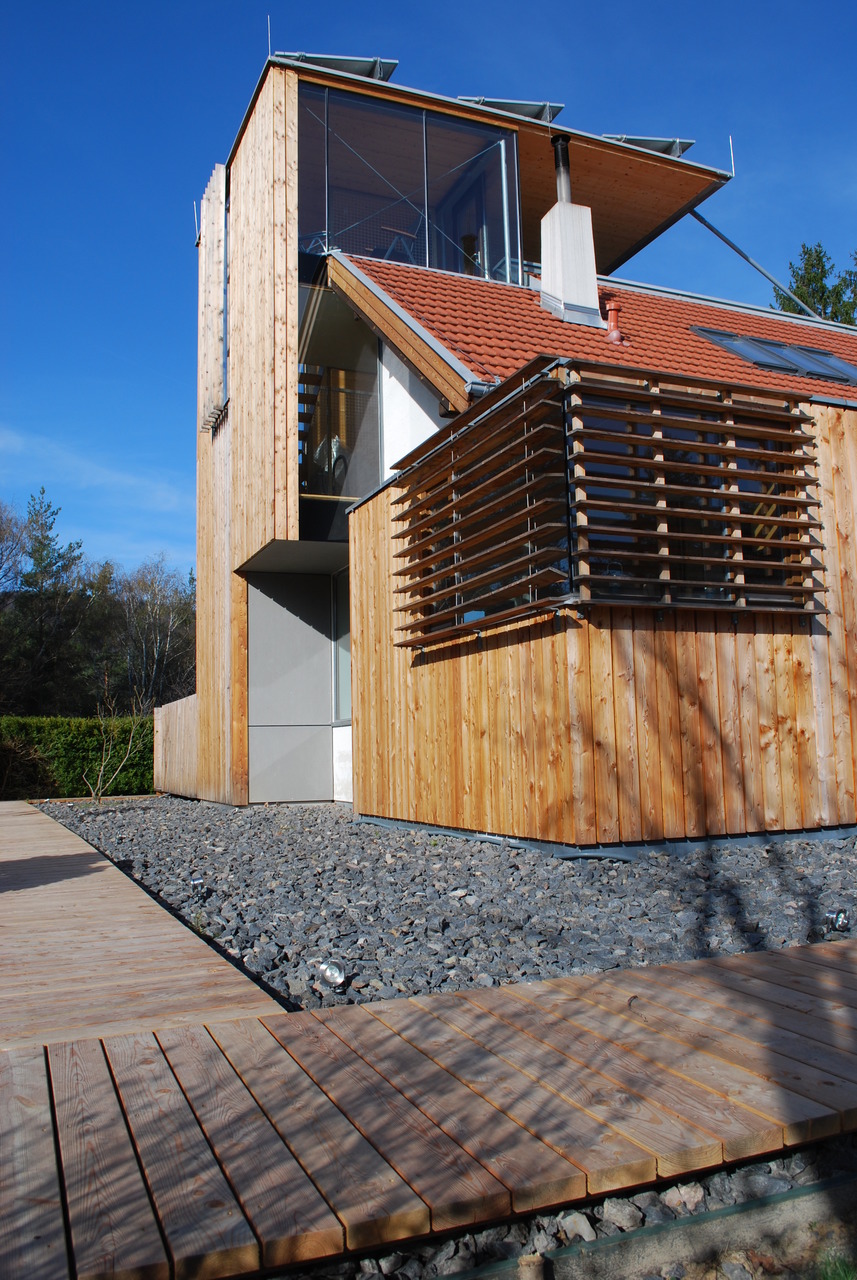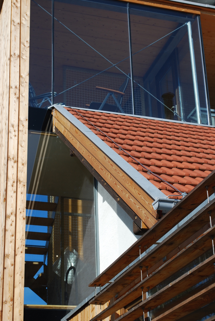 Der Zubau sowie die Aufstockung sind wärmegedämmte Holzriegelkonstruktionen, die Stiegenhausaußenwand sitzt auf Betonfundamenten, die Zwischenwände im Dachgeschoß sind als Fachwerk ausgebildet und tragen den Erker. Das schwebende Dach über dem Stiegenhaus und der Terrasse ist eine KLH Decke mit sichtbarer Metallausteifung aus Formrohren und Rodan Zugbändern.