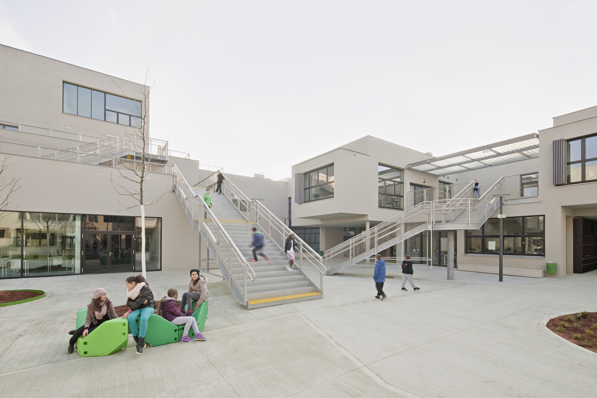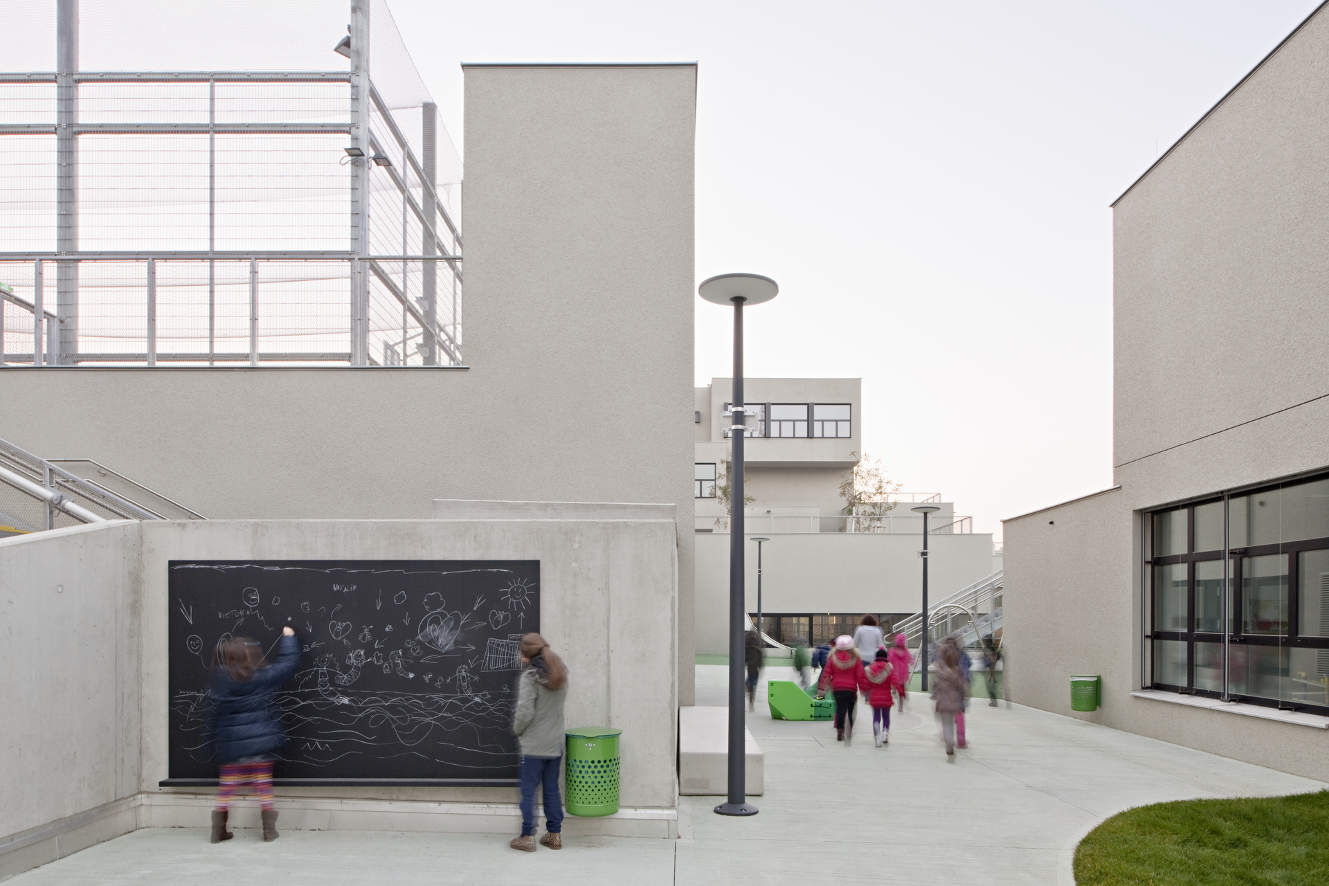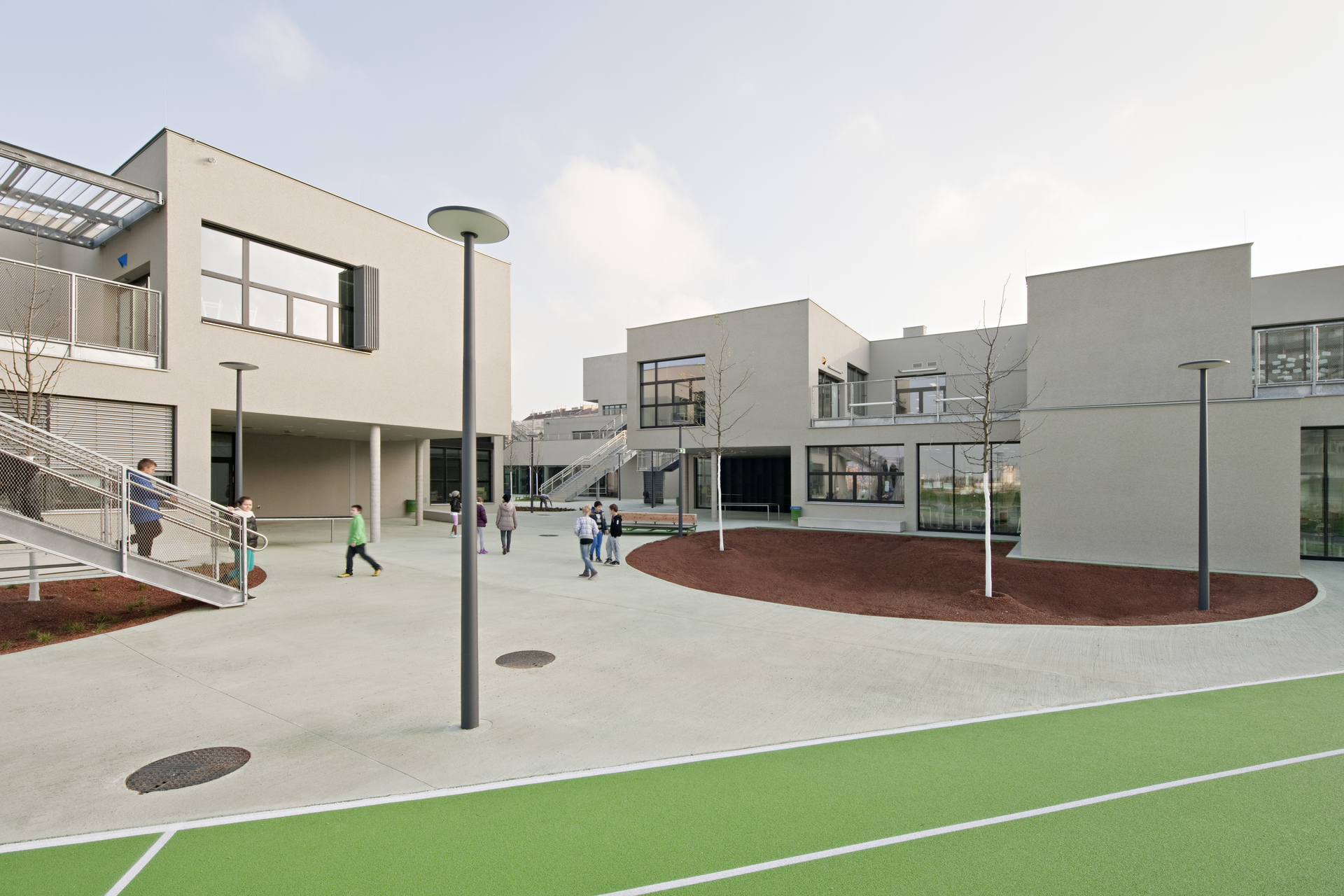 Die Anlage ist zweigeschossig angelegt, wobei die beiden Geschosse versetzt übereinander gestapelt sind, sodass im Gebäudeverband überdeckte Freiräume entstehen, die als Freiklassen genutzt werden. Der Freiraum mäandriert zwischen den verästelten Gebäudeteilen und bildet kleine Dorfplätze und Gässchen. Da Rasenflächen dem Nutzungsdruck der Kinder nicht Stand halten könnten, simulieren eingefärbte Kunststoffbeläge das natürliche Grün.