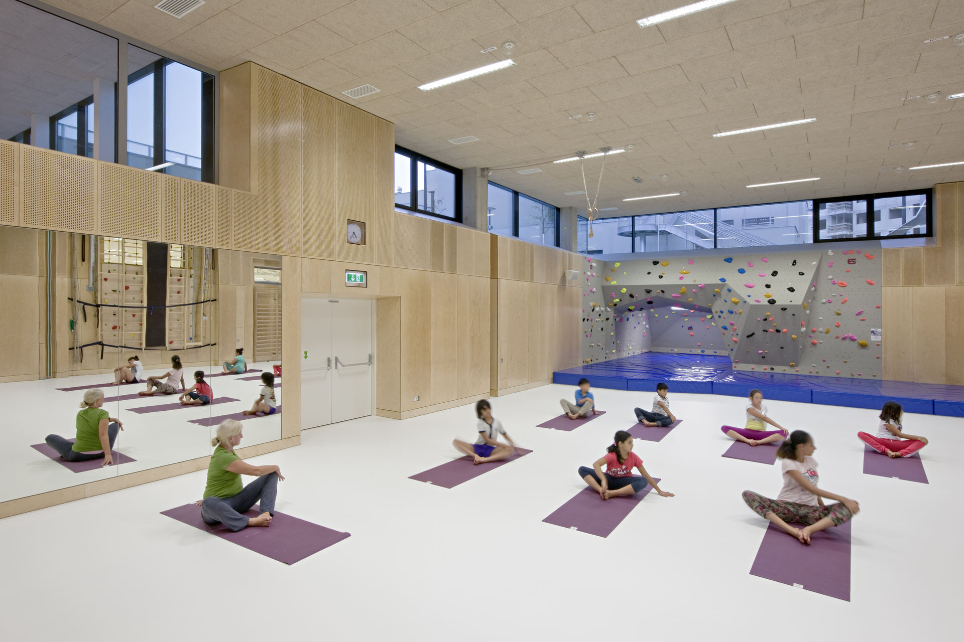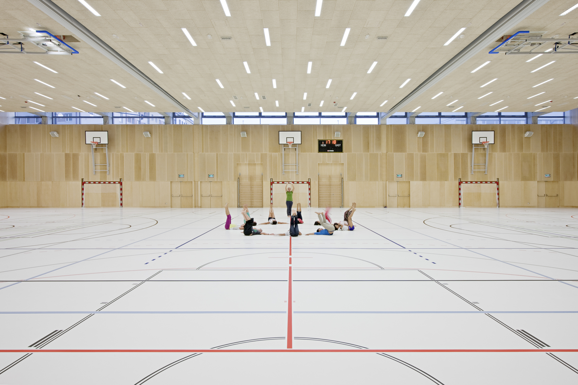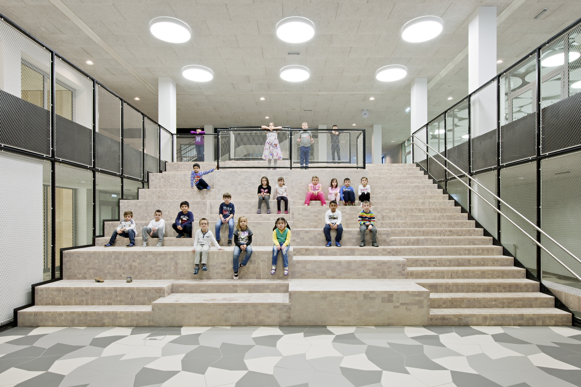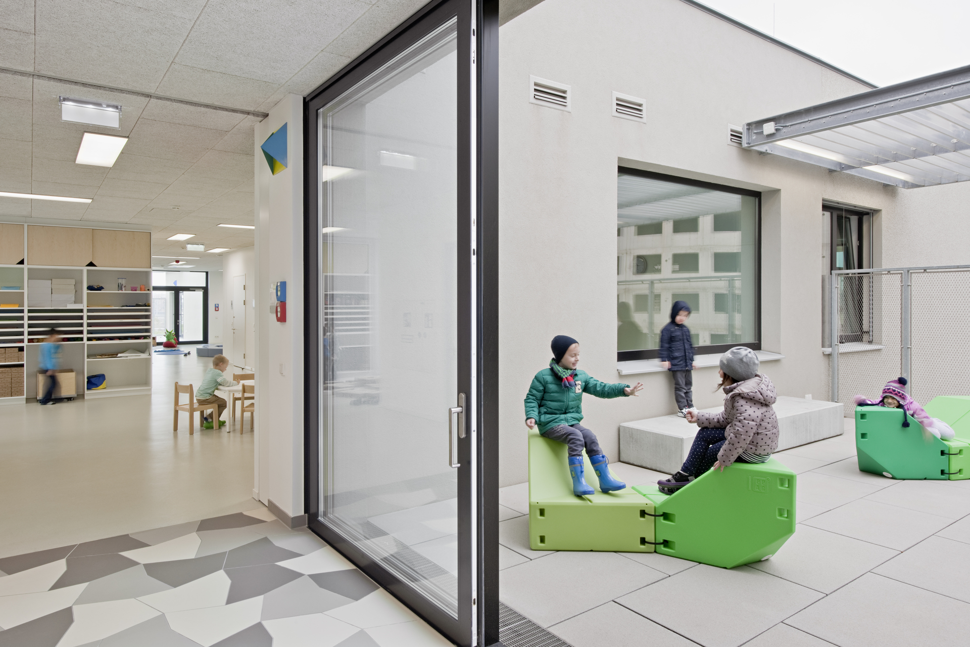 Die Anlage ist zweigeschossig angelegt, wobei die beiden Geschosse versetzt übereinander gestapelt sind, sodass im Gebäudeverband überdeckte Freiräume entstehen, die als Freiklassen genutzt werden. Der Freiraum mäandriert zwischen den verästelten Gebäudeteilen und bildet kleine Dorfplätze und Gässchen. Da Rasenflächen dem Nutzungsdruck der Kinder nicht Stand halten könnten, simulieren eingefärbte Kunststoffbeläge das natürliche Grün.
