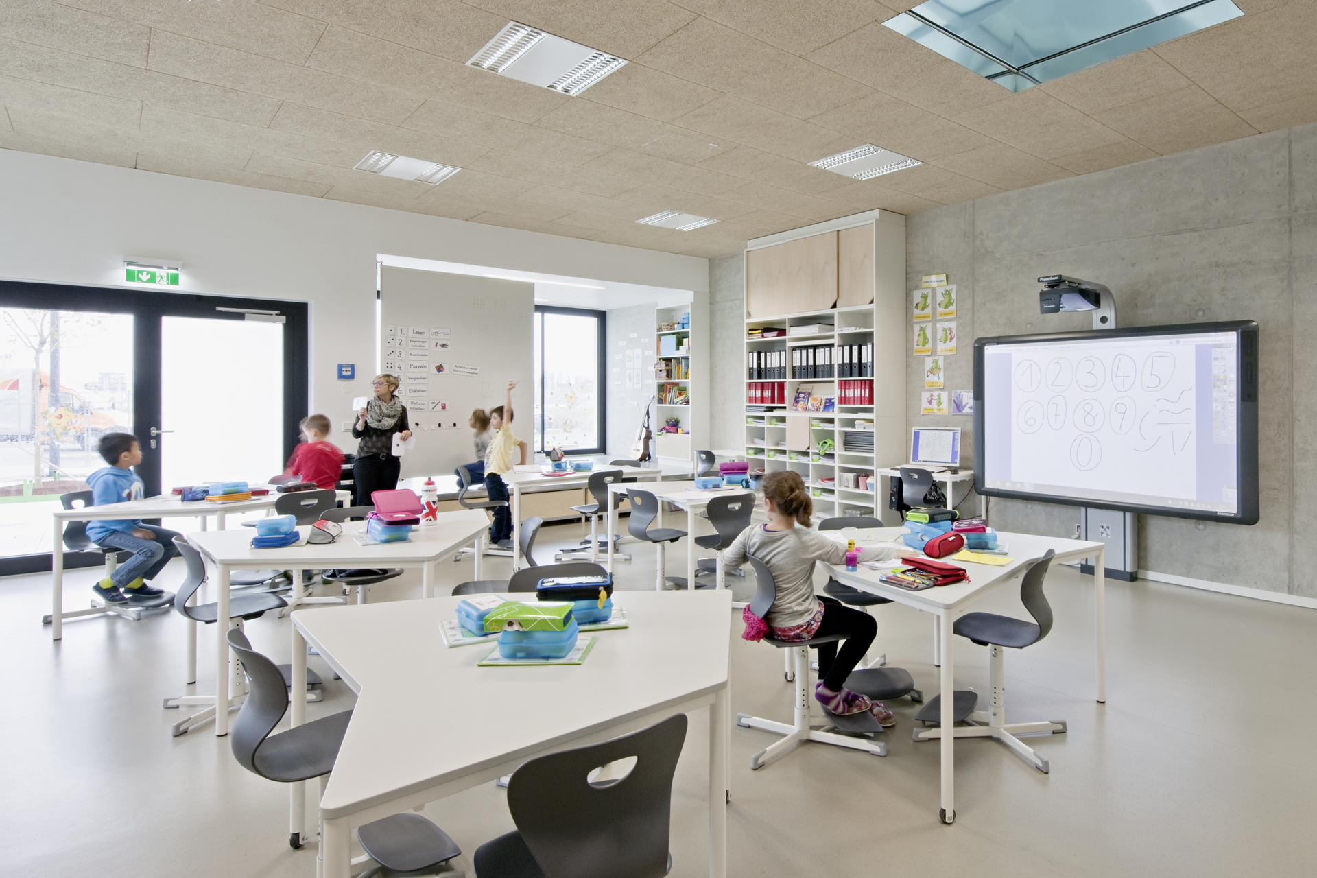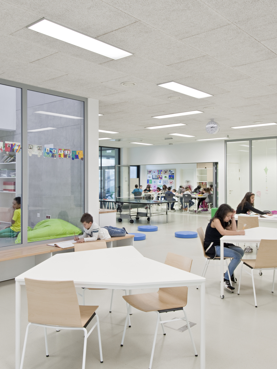 Neu ist neben der Form der Tische auch deren Höhe: die Kinder sitzen, gemessen an Volksschulstandards, deutlich erhöht. Für die Lehrer ermöglicht die erhöhte Position eine vergleichsweise entspannte Körperhaltung bei den Interaktionen am Tisch. Die Sitzhöhe fördert zudem den Bewegungsdrang der Schüler, was förderlich ist, denn im Unterschied zu früher ist das Aufstehen und Verlassen des Tisches während der Unterrichtsstunde Teil des pädagogischen Konzepts. Apropos Unterrichtsstunde: die aktuellste Debatte führt in die Richtung, dass der Unterrichtseinheit bald die letzte Stunde geschlagen hat. Dann folgt nach der räumlichen Öffnung auch eine zeitliche Öffnung des Unterrichts.