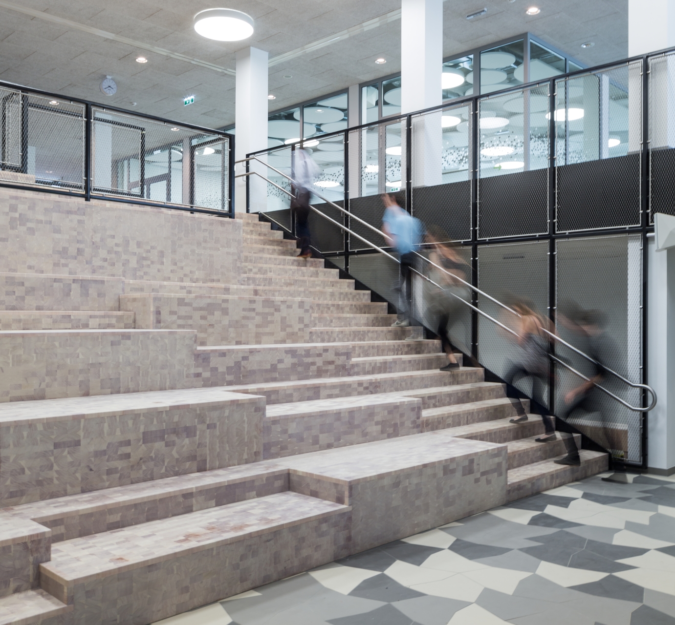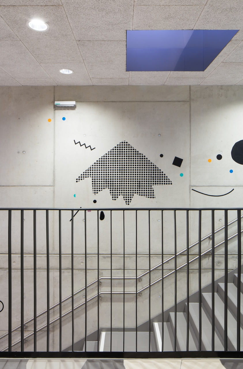 Für eine bessere Orientierung im Gebäude wurde ein grafisches Code-System entwickelt das Anleihe an jenen Codes nimmt, die schottische Clans verwenden (Schottenkaro, Wappen). Für nicht-Eingeweihte sind die Unterschiede einzelner Klassencodes kaum ablesbar. Die Clan-Mitglieder hingegen – also die Schüler – dechiffrieren ihren Klassencode. Im Schulalltag erwies sich das System leider als zu dezent, der Lehrkörper greift auf altbewährte Klassenmaskottchen zurück: Igel, Frosch & Co. (Text: Martina Frühwirth)