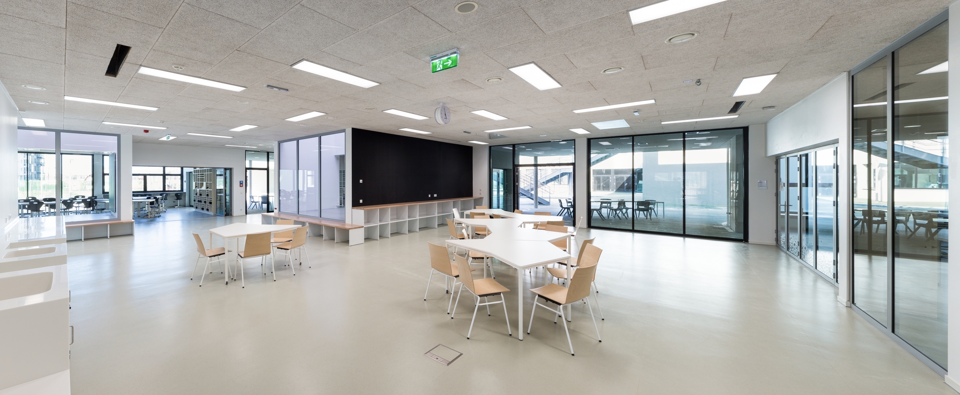 Jedes Klassenzimmer verfügt über eine dem Marktplatz zugewandte, leicht erhöhte Nische, die Raum für Sitzkreise und sonstige informelle Unterrichtseinheiten bietet. Metallspiegelnde Lichtröhren versorgen diese Nischen – die Architekten haben ihnen den Namen „Nest“ gegeben – mit Tageslicht, wobei die metallisch-violette Oberfläche der Zylinderwand eine ganz besondere, entrückte Lichtstimmung erzeugt. Die Idee des Nests ist, dass es jederzeit spontan genutzt werden kann, z.B. wenn schnell auf einen Konflikt reagiert werden soll, ohne dass alle Tische und Sessel im Raum verschoben werden müssten.
