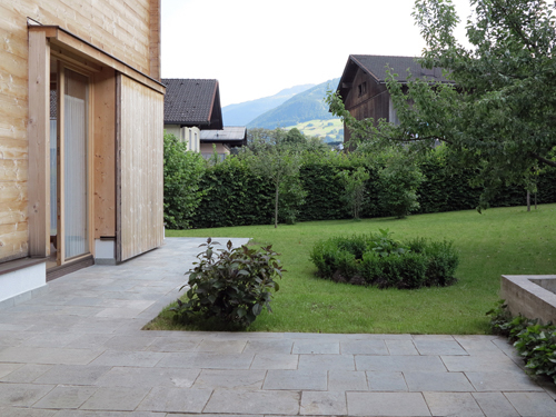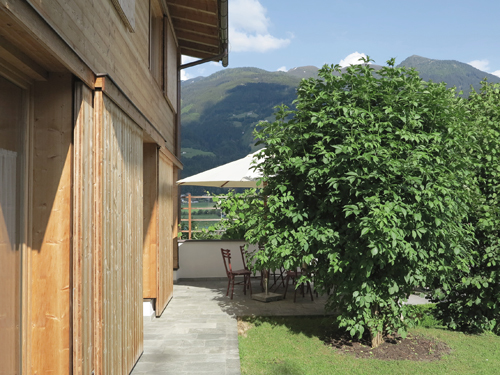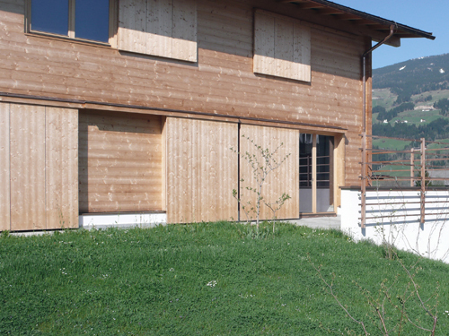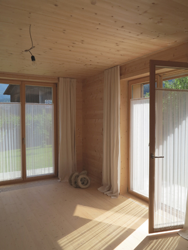 Die Grundrisskonfiguration zeigt vertraute Raumzuschnitte und Proportionen genauso wie Verschiebungen: so gibt es statt eines Mittelgangtyps mit einläufiger Stiege eine rechteckige Halle mit Galerie und einer abgewinkelten Treppe. Auch bei den Außenwänden gibt es gezielte Abwandlungen vom Grundtyp: die Fensterflächen sind zwar traditionell in die Blockwände gesetzt, allerdings mit großen Formaten und in Form von Fenstertüren im Erdgeschoß. Schiebeläden bei allen Fenstern schützen vor der sommerlichen Aufheizung.