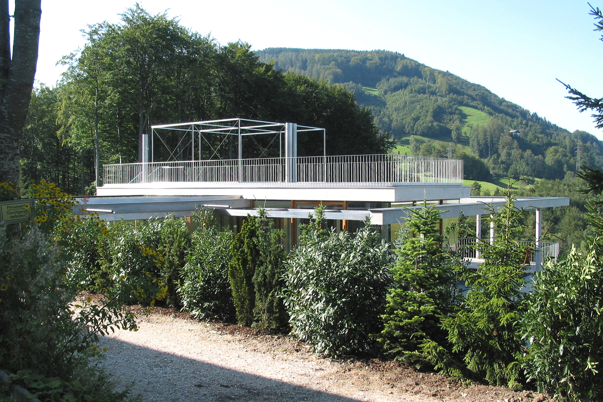 Um den Baukörper gut in die Landschaft integrieren zu können, wurde versucht, diesen möglichst niedrig zu halten. Auch aus Rücksicht der oberhalb angesiedelten Nachbarn. Aus diesem Grund wurden die untergeordneten Räume für Technik und Lagerung in den Hang „eingegraben“.