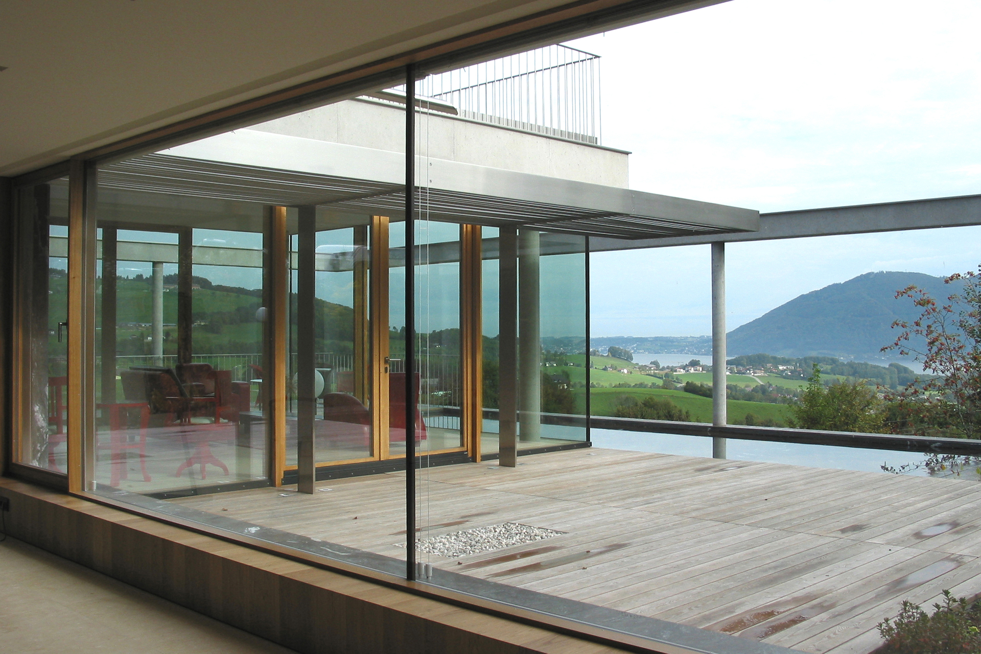 Ebenso weit öffnet sich der Hauptraum im Erdgeschoss an drei Seiten und vollflächig verglast zu Aussicht und Sonne.