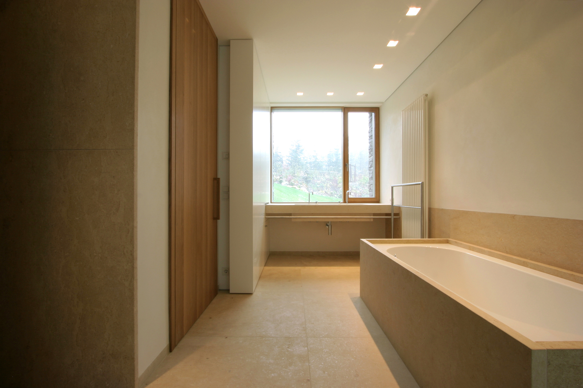 Neben Naturstein und Sichtbeton wird die Außenerscheinung geprägt von geöltem Eichenholz und Edelstahl. Den Innenraum dominieren ebenso natürliche Materialien wie heller Kalksandstein, Eichen- und Nußholz sowie weißer Lehmputz an den Wänden.