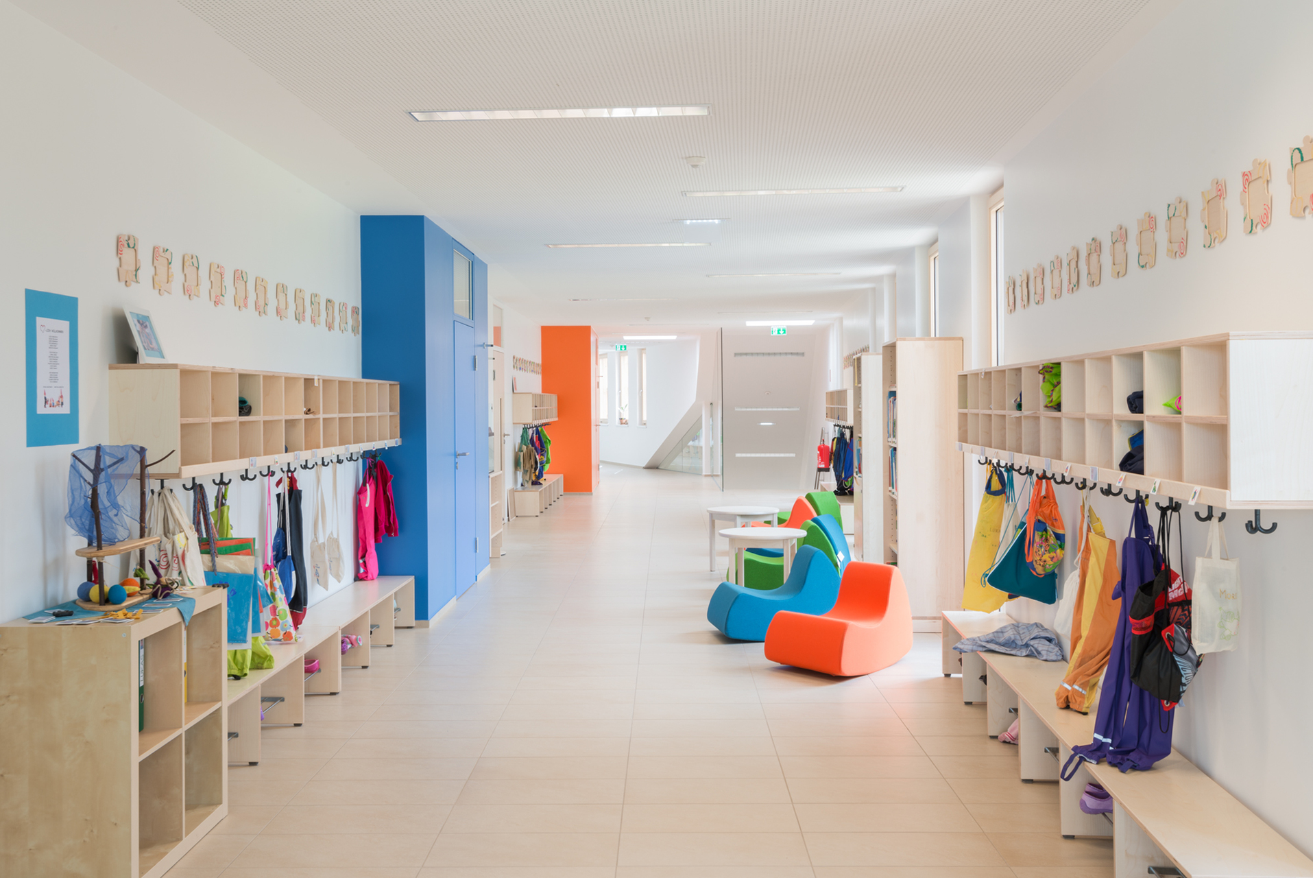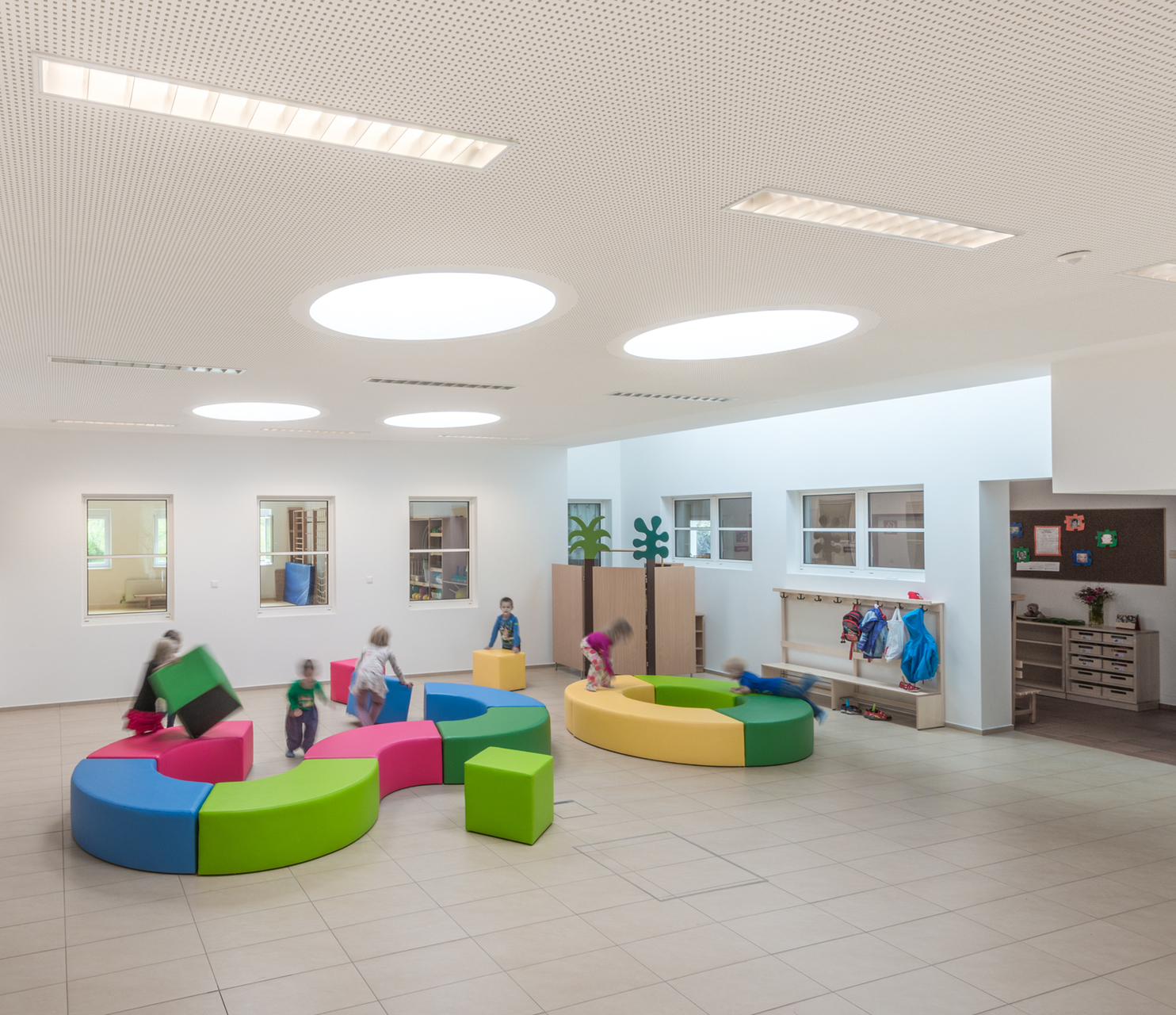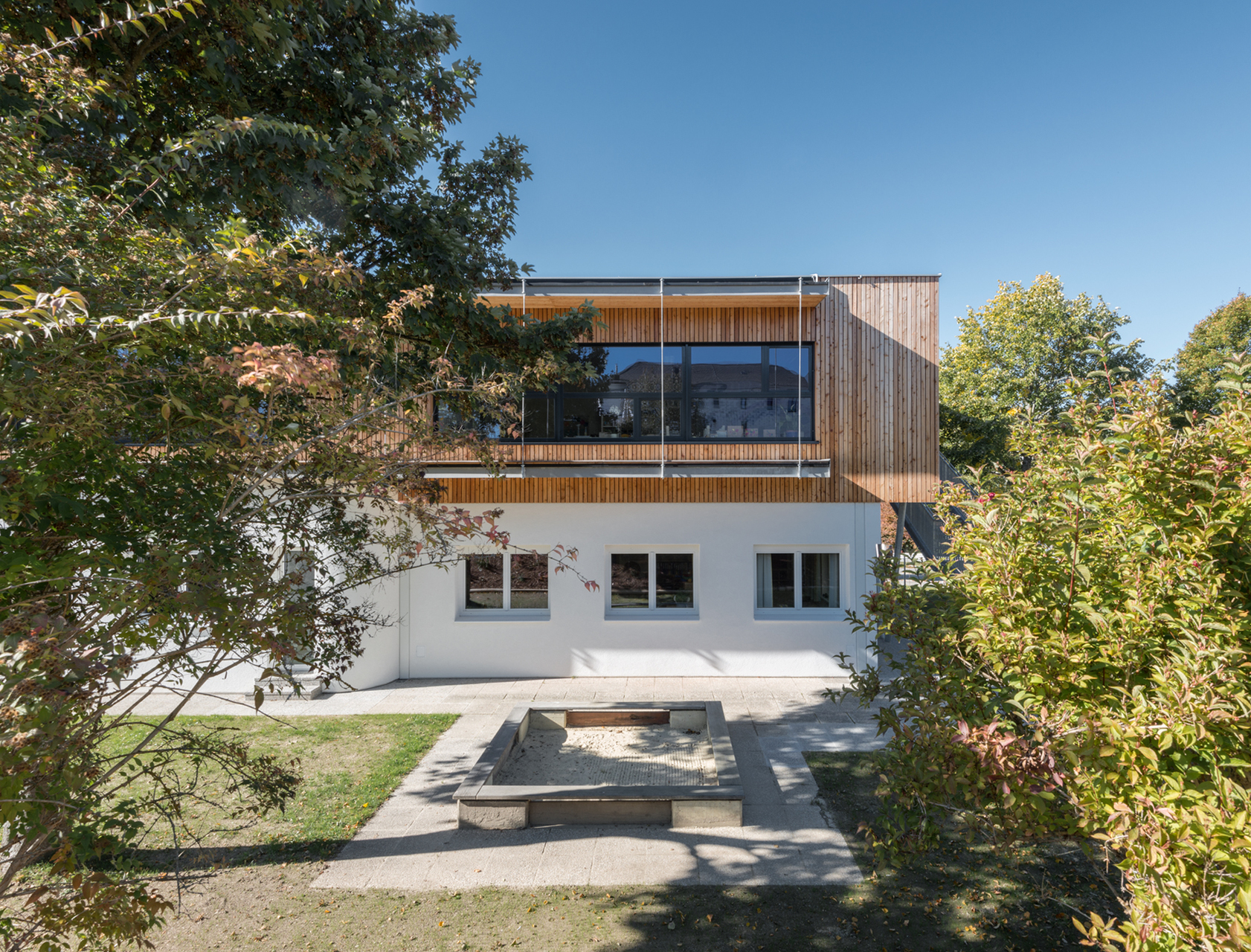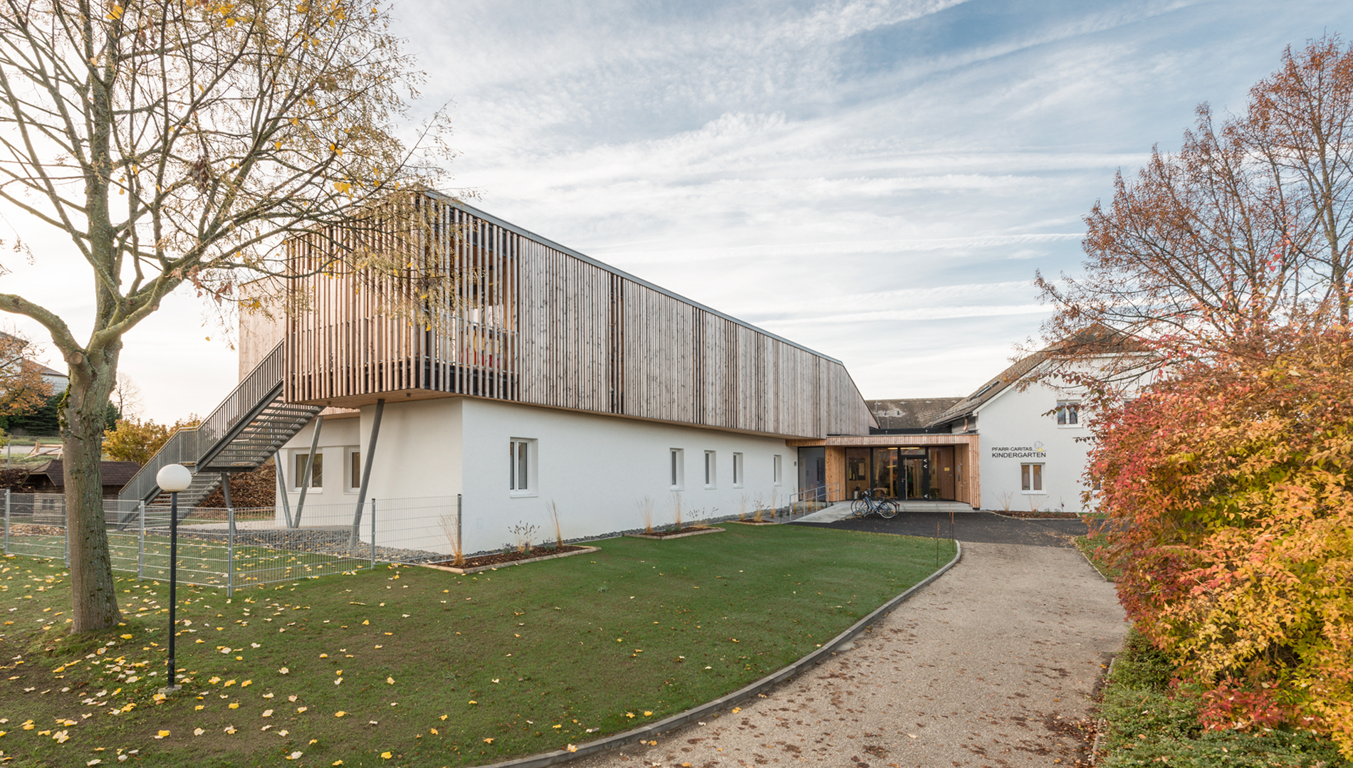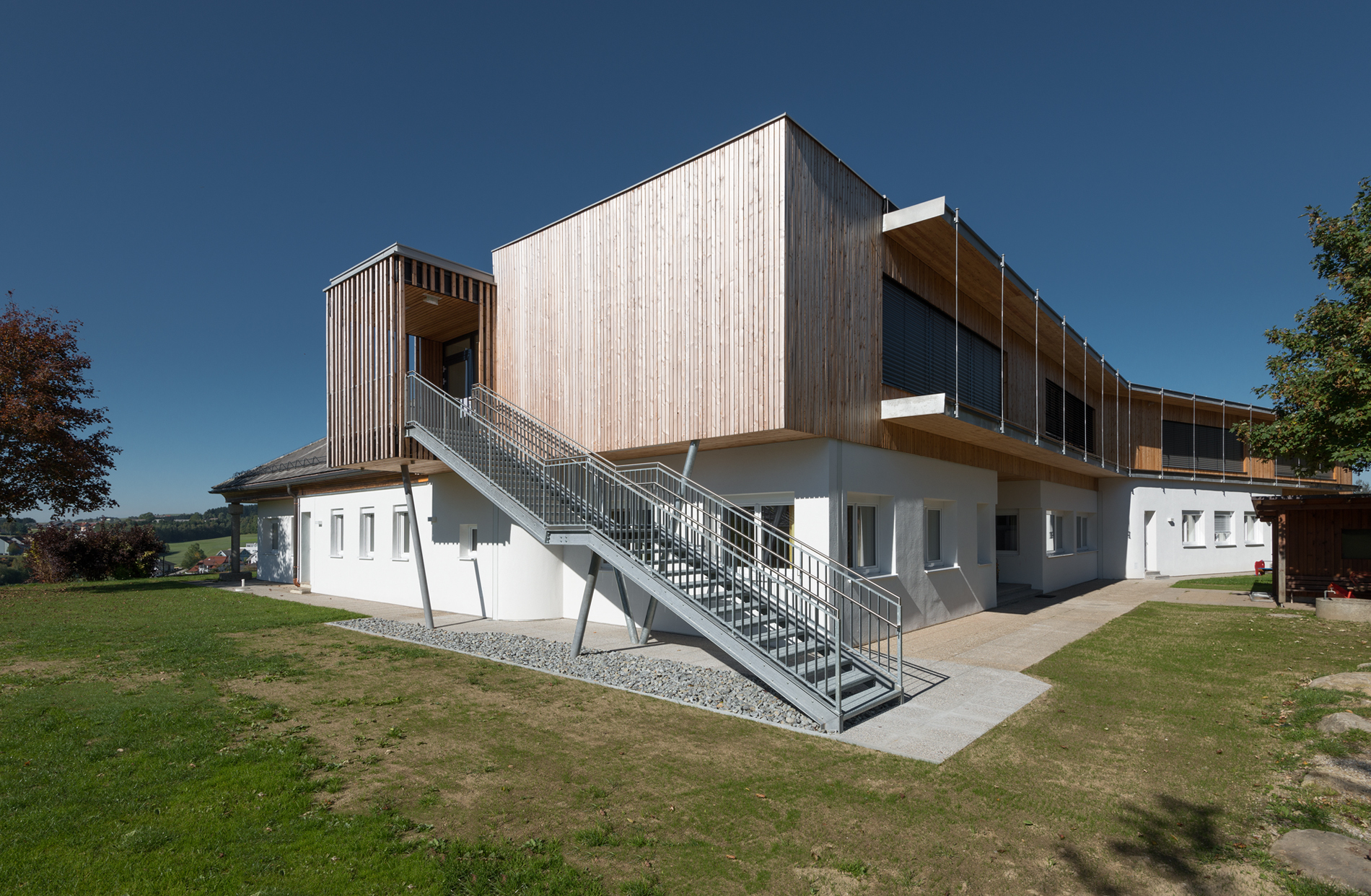 Die notwendige Erweiterung des Kiga Leonfelden um weitere drei Gruppen mit einem Bewegungsraum erfolgte in Form einer Aufstockung über dem östlichen Trakt. Aufgrund der nachhaltigen und leichten Bauweise sowie der kurzen Bauzeit wurde für die Aufstockung eine Holzkonstruktion gewählt. Der Eingangsbereich im Erdgeschoss wurde neu gestaltet und bildet als Spange die Verbindung der alten Struktur mit den neuen Räumen. Eine Aula anstelle des zuvor nicht nutzbaren Innenhofes erschließt die Erdgeschoßgruppen des Bestandes. Diese Aula ist zum eigentlichen Mittelpunkt und Treffpunkt für alle Kinder geworden. Eine breite offene Treppe verbindet diese mit den großzügigen Gangbereichen des Obergeschoßes. Diese Garderobenbereiche übernehmen wichtige Funktionen von Ersatzflächen, Mehrzweckbereichen, Bibliothek uvm.Zwei Fluchttreppen an den beiden Enden der Aufstockung dienen gleichzeitig als Gartenzugang für die Obergeschoßgruppen und verleihen dem Holzbau eine gewisse Luftigkeit.