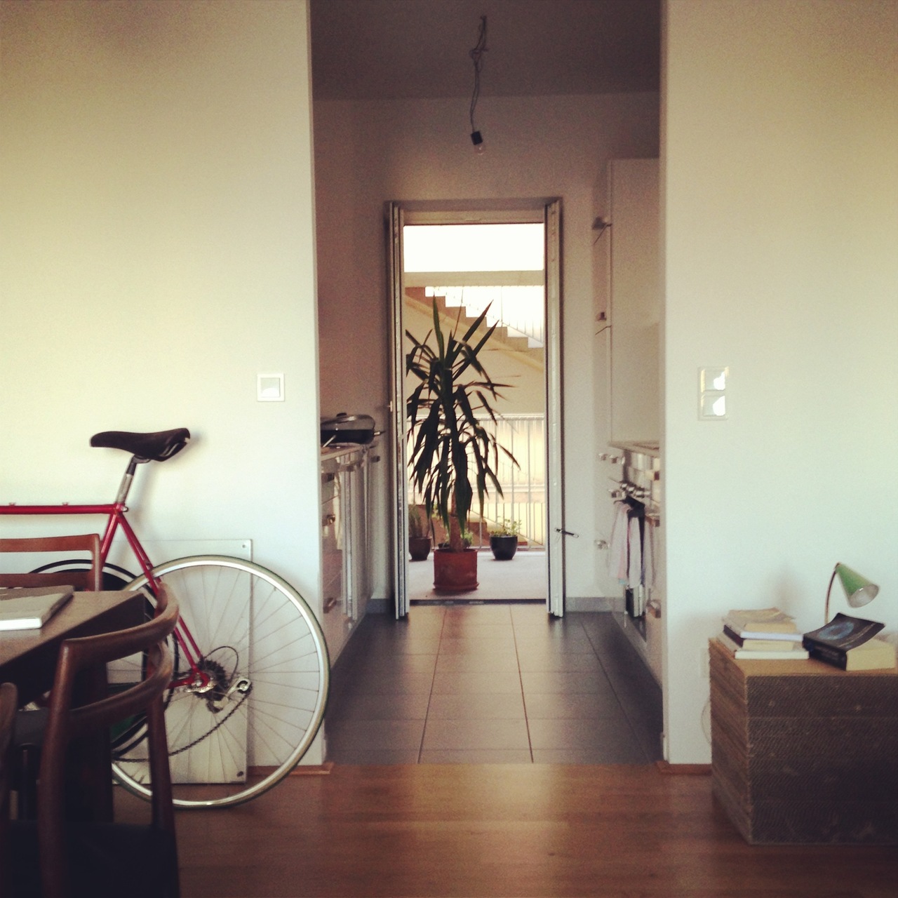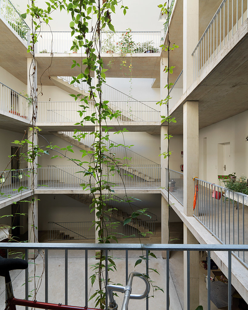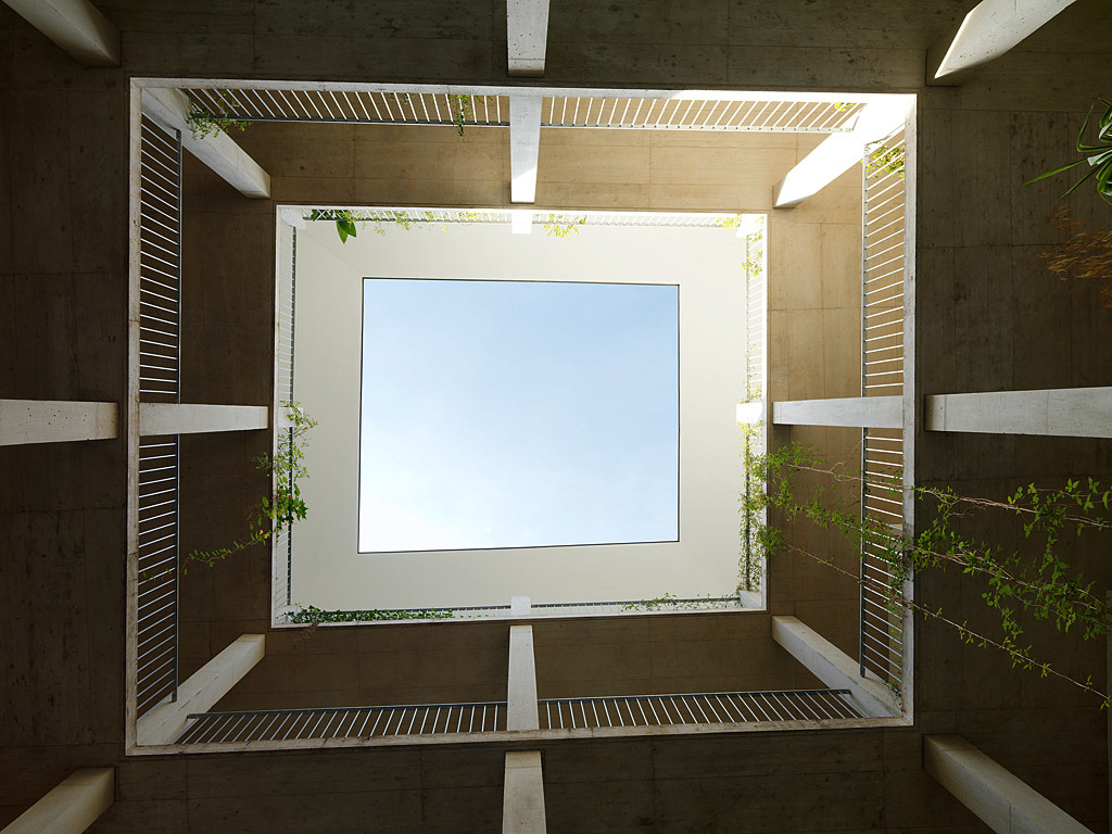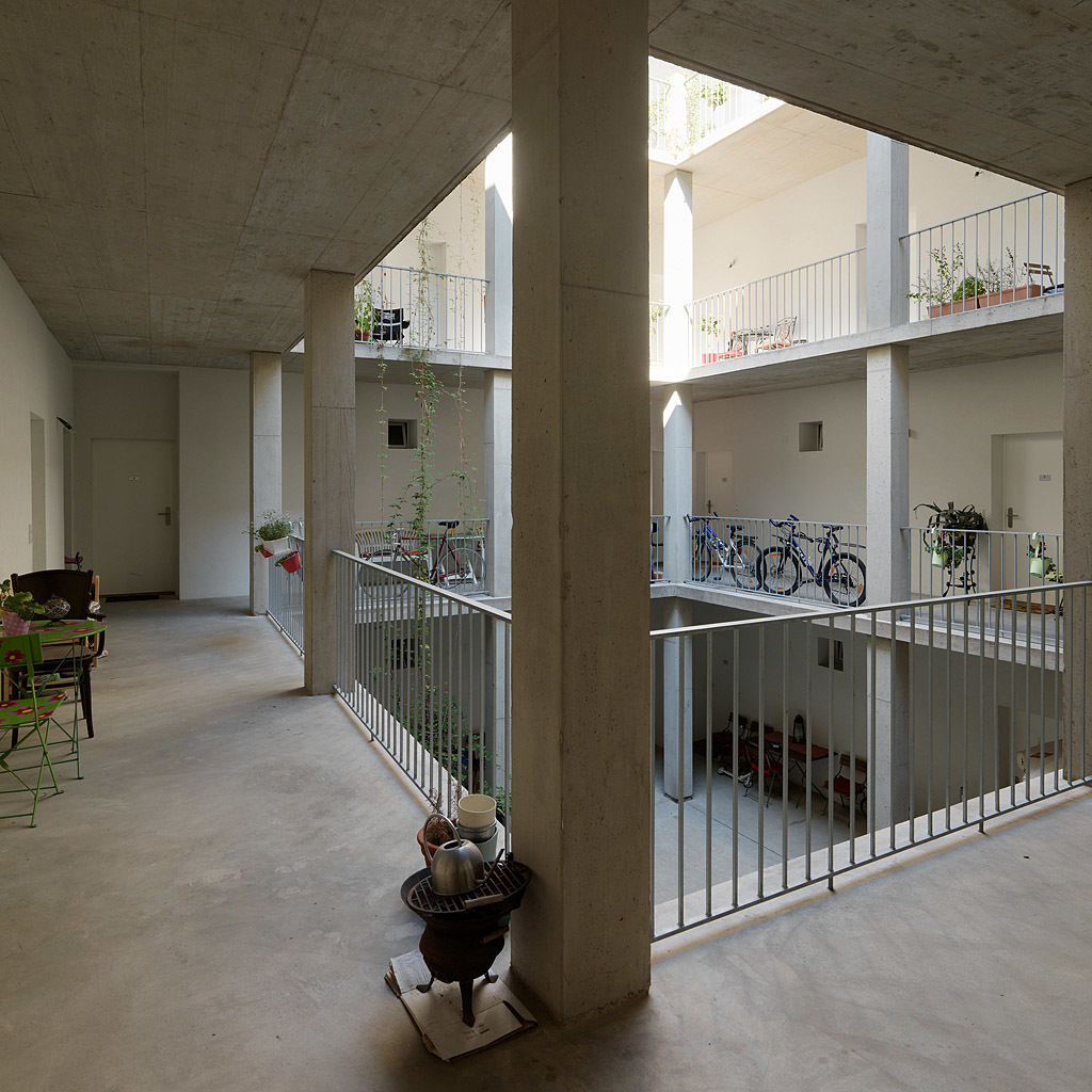 Pawlatschenartige Umgänge gab es auch im früheren Hofraum, jetzt sind sie aber mehr als Erschließung. Ihre Tiefe erlaubt es, sie als erweiterten Wohnraum und als Balkon zu nützen – ein Ort der Begegnung und Kommunikation unter einem offenen „Skyframe“, ausgeführt als etwas raue Stahlbetonkonstruktion mit einfachen verzinkten Geländern. Fensteröffnungen in diesen allgemeinen Aufenthaltsbereich hinein erlauben Querbelüftung und eine zusätzliche Belichtung der Wohnungen.