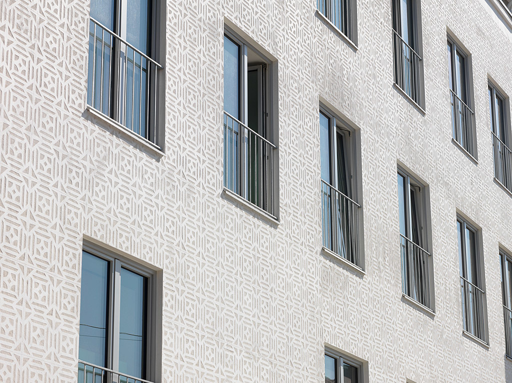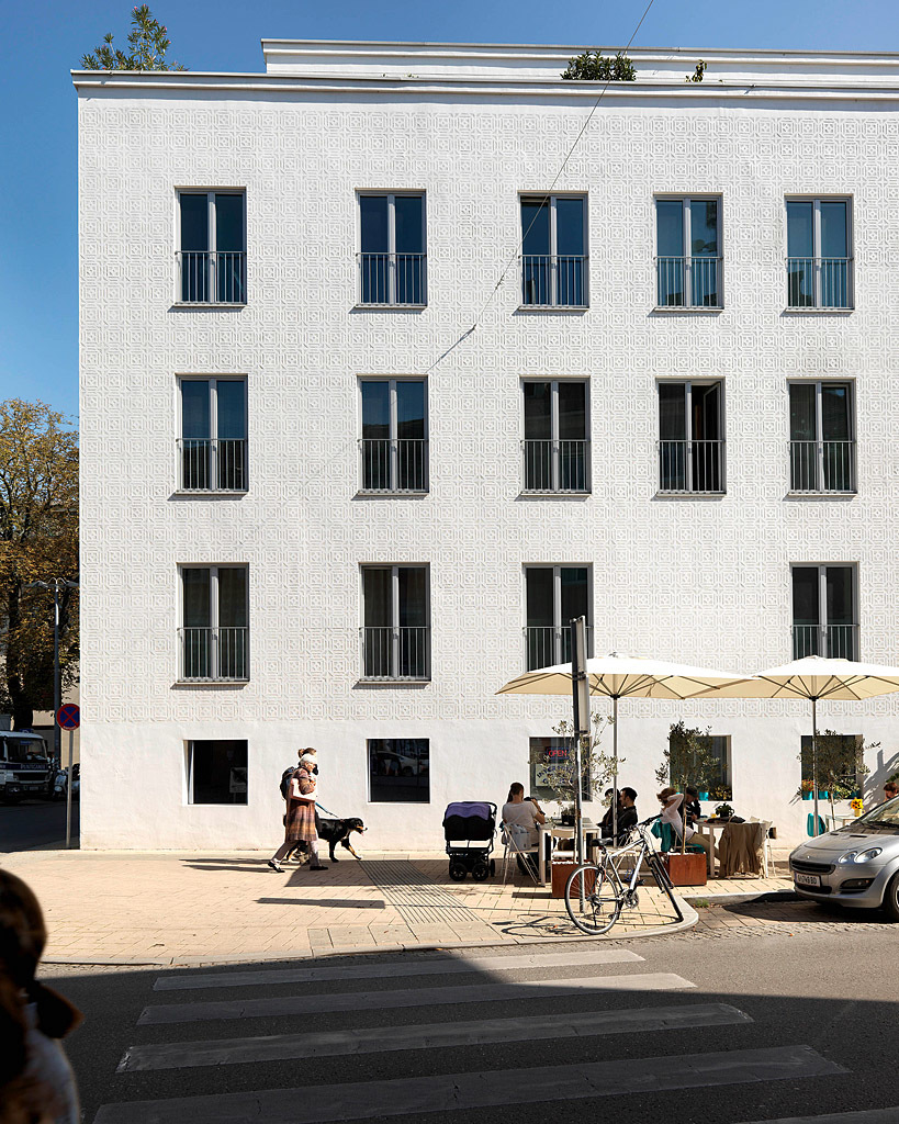 Nach außen, zur Stockergasse und zum Marktplatz hin, zeigt der nun höhere, mit wenig Gliederung ungeschmückt wirkende Baukörper angemessene urbane Dichte. Die Fensterachsen des ehemaligen Vorstadthauses wurden weitgehend beibehalten, aber einheitlich mit bodentiefen französischen Fenstern versehen. Nähert man sich der Fassade, so weicht ihre schroffe Fernwirkung der zarten Anmutung einer ornamentalen Feinstruktur in Weißtönen, die sie zur außergewöhnlichen, Aufmerksamkeit heischenden Außenhaut machen.