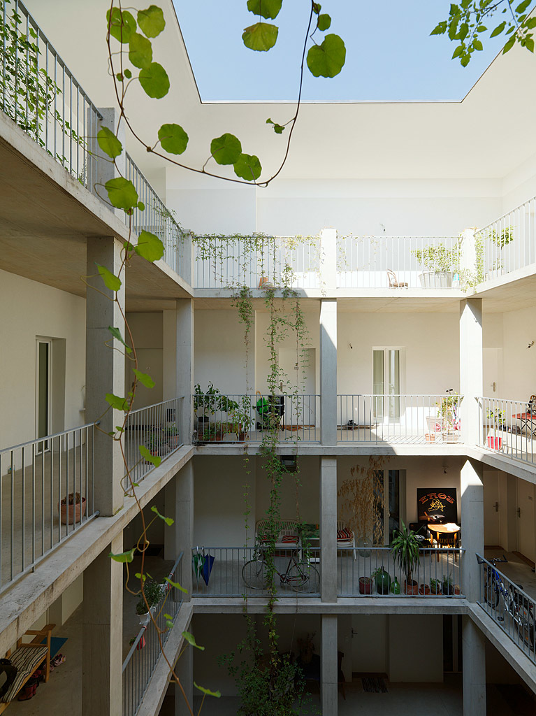 Alle Wohnungen (in der Größe von 38 bis 92 qm) gruppieren sich um einen intimen, nach außen hin abgeschotteten Patio mit umlaufenden Laubengängen, von denen aus sie geschoßweise erschlossen werden. In diesen Hof und zum Lift gelangt man über einen unauffälligen, kaum zu findenden Eingang und einen schmalen Gang mit Treppe. Man steigt ein Geschoß in den Innenhof hoch, unter dem sich Küche und Nebenräume eines Restaurants im Erdgeschoß befinden.