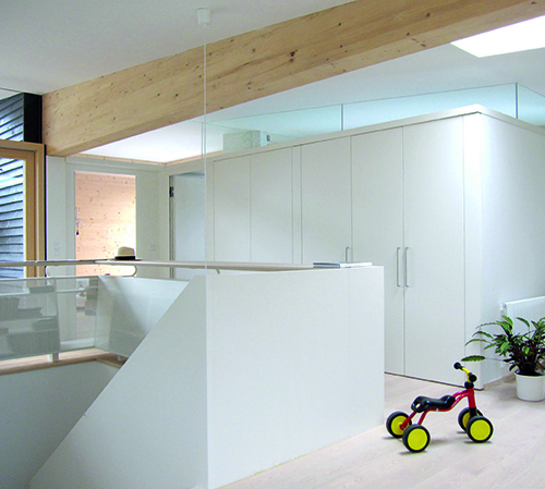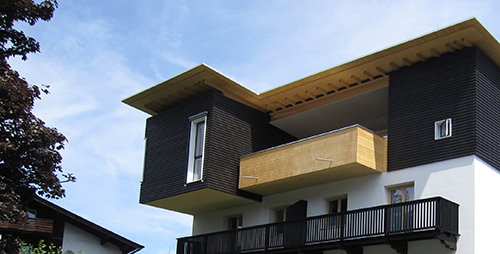 Die Bauzeit – in einem touristischen Ort ein wesentliche Faktor – konnte durch den in Zusammenarbeit zwischen Zimmerer und Architekt entwickelten hohen Vorfertigungsgrad auf drei Monate beschränkt werden. Die Materialien wurden nach ökologischen Gesichtspunkten ausgewählt, für Konstruktion, Sichtflächen Innen und außen sowie zur Dämmung wurden in erster Linie Holz bzw. Holzwerkstoffe verwendet. Zum Einsatz kamen Fichte für den Holzbau, weißgeölte Esche für die Böden, Thermokiefer für die Terrassenbeläge sowie Holzfaserdämmstoffe für die Dämmung der Wände und Fußböden bzw. Zellulose für die Deckenelemente. Nicht aus Holzwerkstoffen oder Holz sind lediglich die Außendachdeckung, die Verblechung und die Konstruktion der Terrassengeländer bzw. Gipskarton und Fliesen im Inneren. (Text: Architekt, red. bearbeitet)