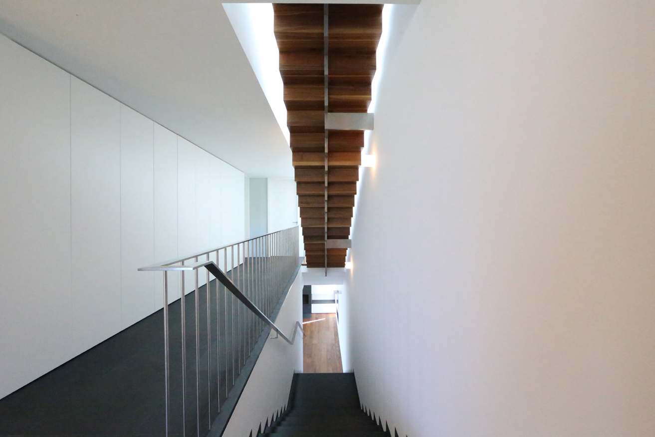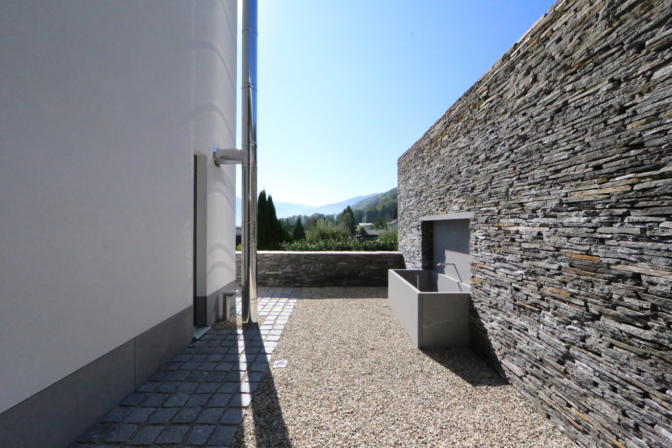 Innenräumlich organisiert sich das Haus somit über drei Geschosse. Das Eingangsgeschoß mit den Schlaf- und Sanitärräumen, das Dachgeschoß mit Terrasse und schließlich das Gartengeschoß mit Wohn-, Arbeits- und Fitnessräumen. Dem Fitnessraum direkt vorgelagert und gedacht als Weiterführung des Innenraumes, wurde ein südseitiger, kontemplativer Hof mit hoch aufragender Natursteinschlichtung und Wasserbecken angelegt.