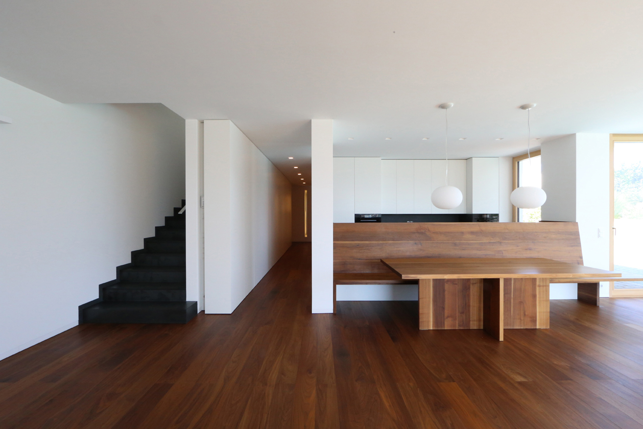 Authentisches Bauen mit Sichtbeton, Naturstein, kräftigen Ziegelwänden mit innen- und außenseitigem Verputz, also Materialien, die zu Alterung fähig sind, waren ein weiteres wichtiges Thema, das zum Entstehen des Haus entscheidend beigetragen hat. (Text: FISCHILL Architekt)
