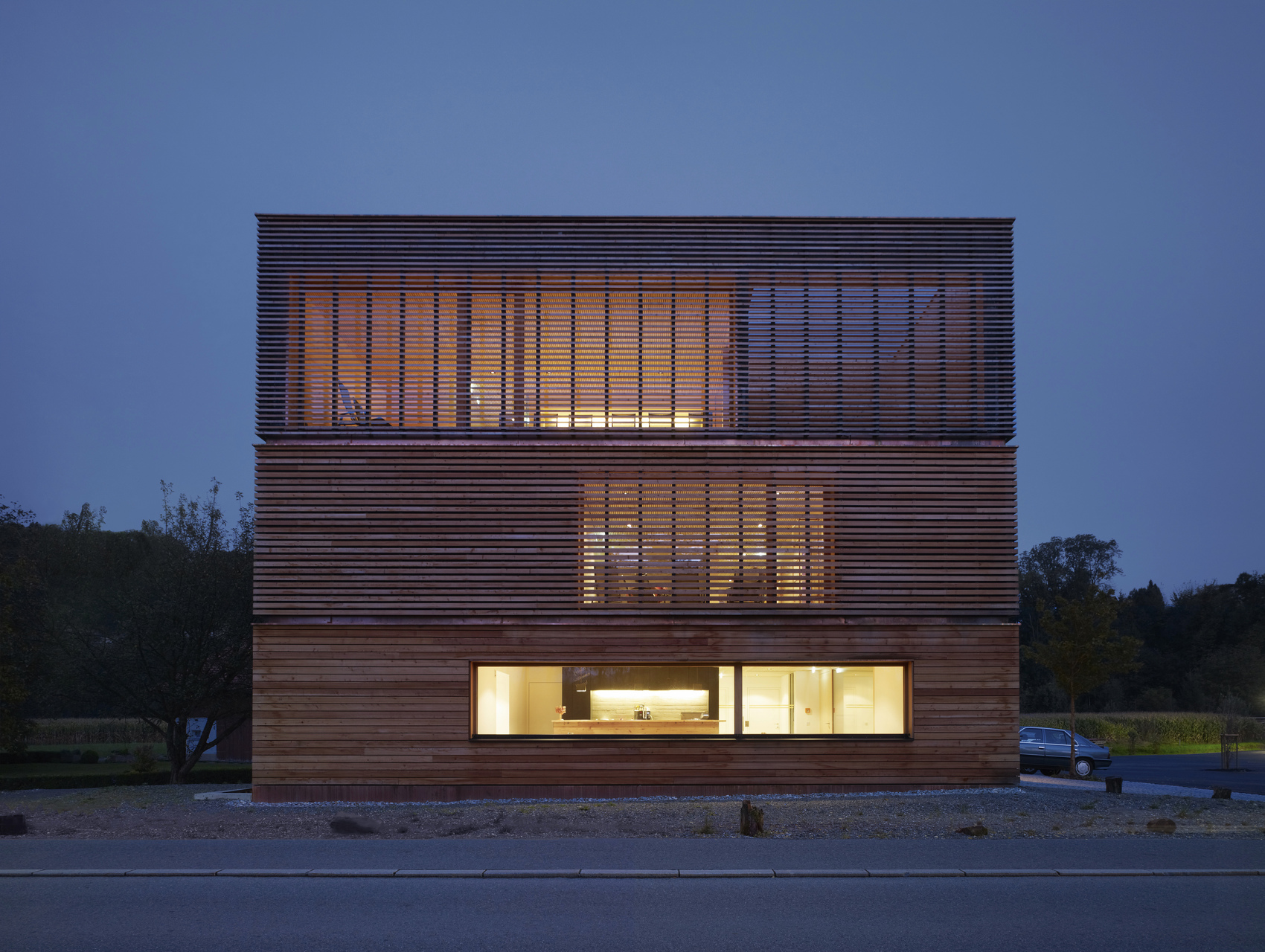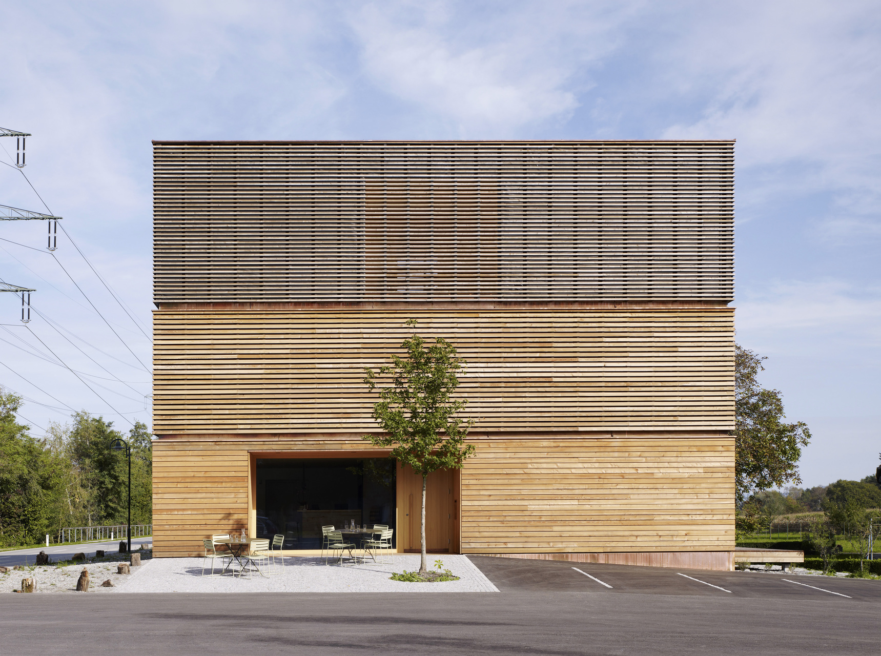 Der kompakte Baukörper auf annähernd quadratischem Grundriss besitzt eine horizontal verlaufende Lärchenholzfassade, die sich nach oben hin lichtet und die drei Geschoße außen ablesbar macht. Ebenerdig ist die Schalung dicht angeordnet und wird vereinzelt von großen Fenstern durchbrochen. Im ersten Obergeschoß öffnet sich die Fassade bereits in einem Verhältnis von 1:2 – die Fugen sind halb so hoch wie die Bretter. Im zweiten Obergeschoß wechseln sich dann gleichbreite Fugen und Bretter ab.