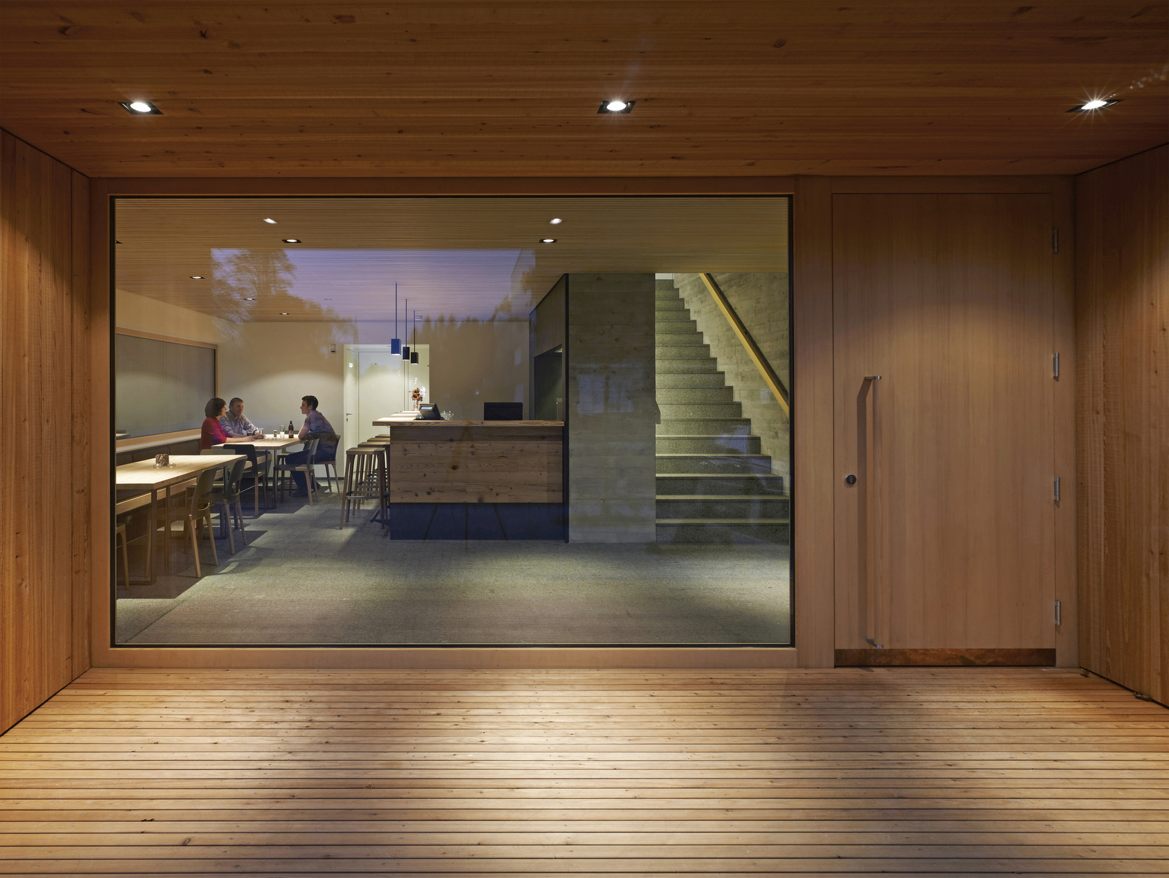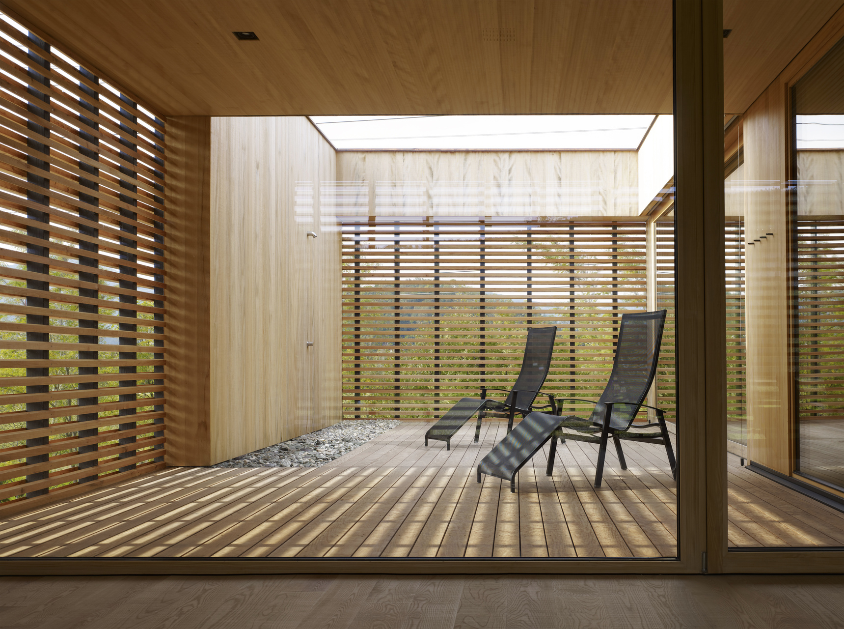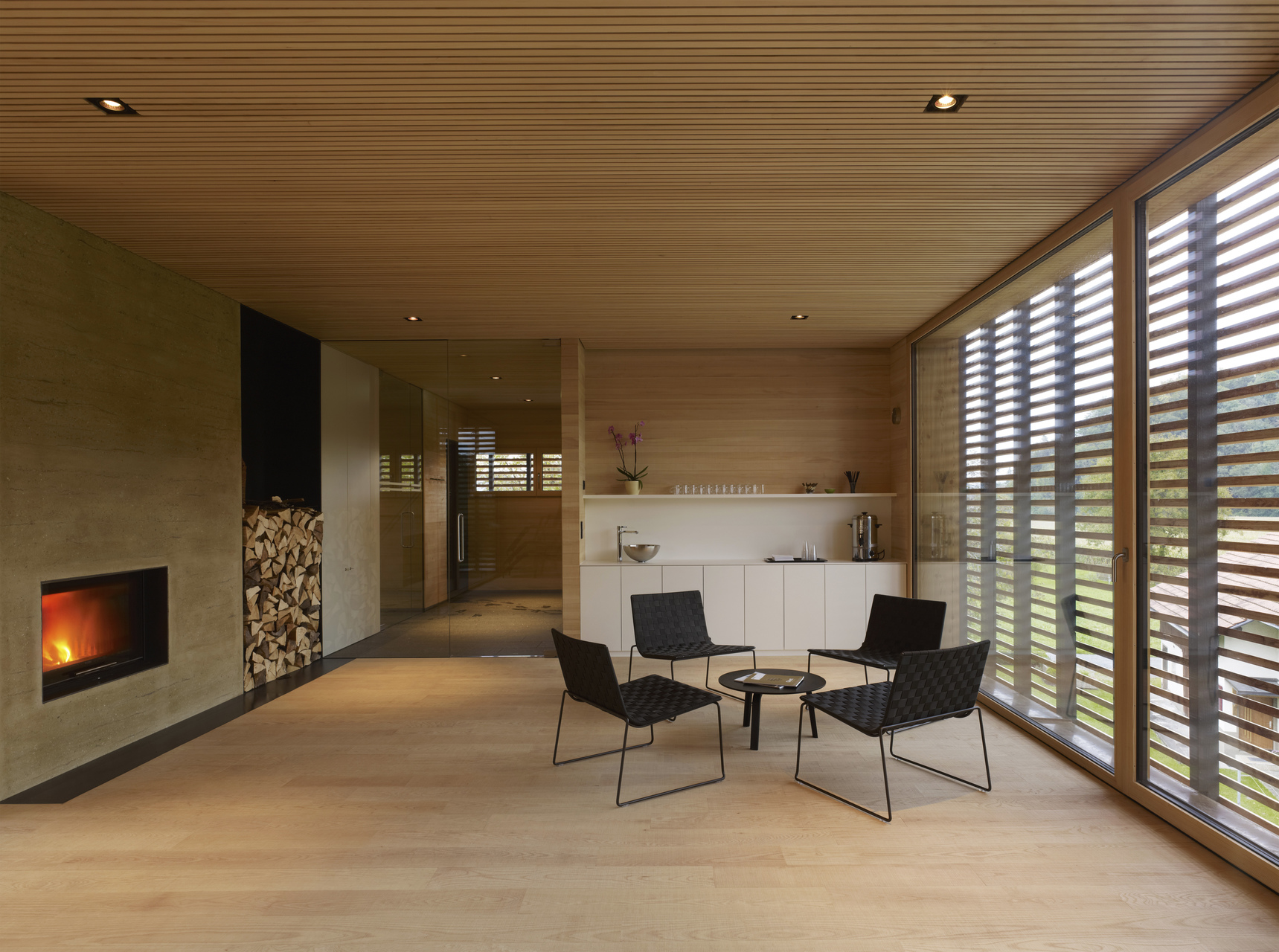 Die Entwicklung der Fassade korrespondiert mit den unterschiedlichen Funktionen im Inneren des Gebäudes. Das Erdgeschoß nimmt eine kleine Bar und Therapieräumlichkeiten auf. Darüber befinden sich Umkleiden und Saunabereich. Auf oberster Ebene kann in der finnischen Sauna geschwitzt sowie in den Ruheräumen und auf der Dachterrasse blickgeschützt, aber mit Blick auf die Schweizer Berge, entspannt werden.