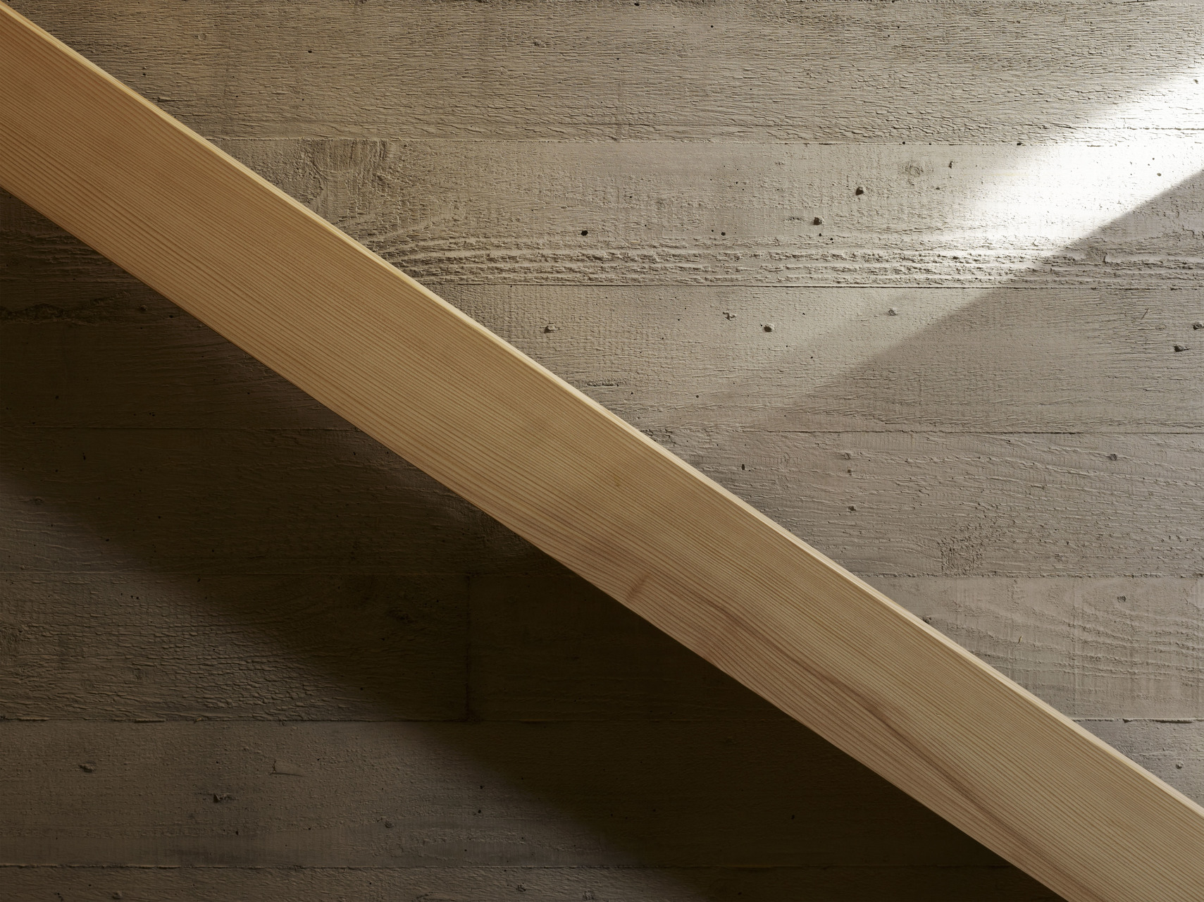 In bretterverschaltem Sichtbeton ausgeführt, nimmt der mittig gelegene massive Kern die einläufige Treppe auf und integriert an seinen Seiten Zusatzfunktionen wie Sitzbänke oder Kamin. An Wänden, Decken und Böden kommen helles Weißtannen- und Eschenholz zum Einsatz, in den Nassbereichen gebürsteter Granitstein als Boden- und teilweise auch Wandmaterial. Der Kaminofen aus Stampflehm integriert sich farblich und haptisch auf selbstverständliche Weise. (Text: Julia Ess)