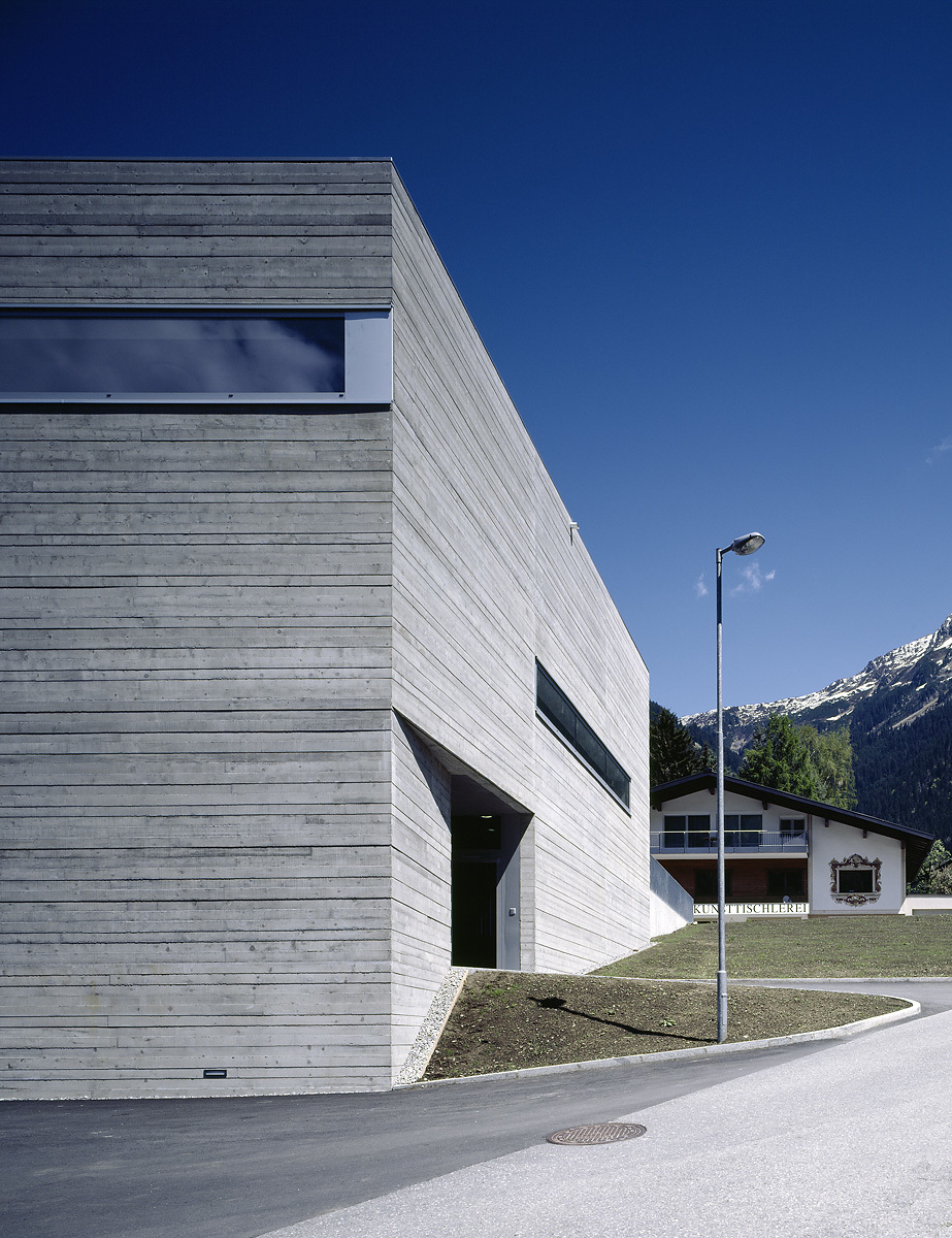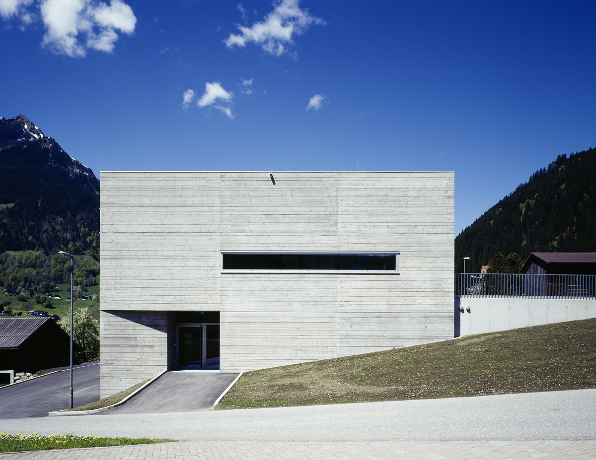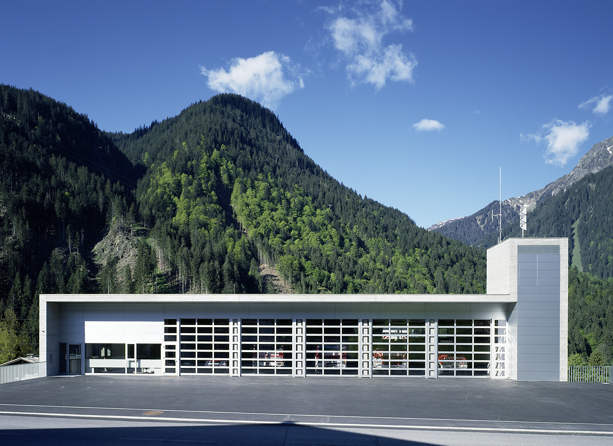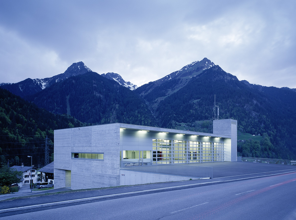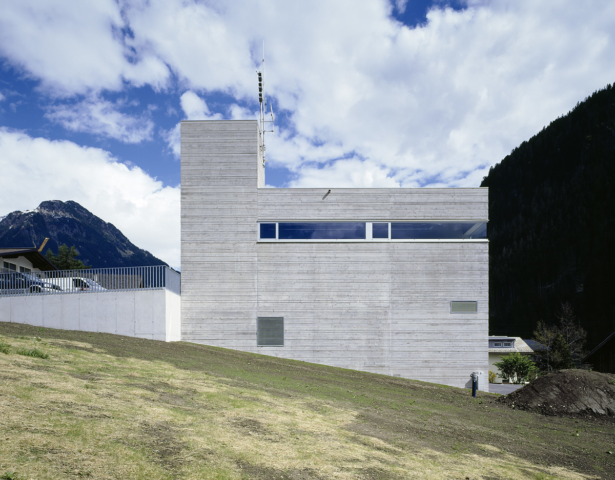 Der Neubau ist in Massivbauweise mit Sichtbetonfassade - die raue Oberflächentextur mit deutlich horizontaler Bretterschalung ergibt einen lebendigen Schattenwurf -, der Ausbau von Schulungs-, Bereitschafts- und Kommandoraum in Trockenbau ausgeführt, Garagen, Lager und Werkstatt entsprechend robust.