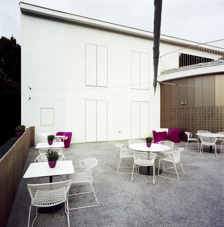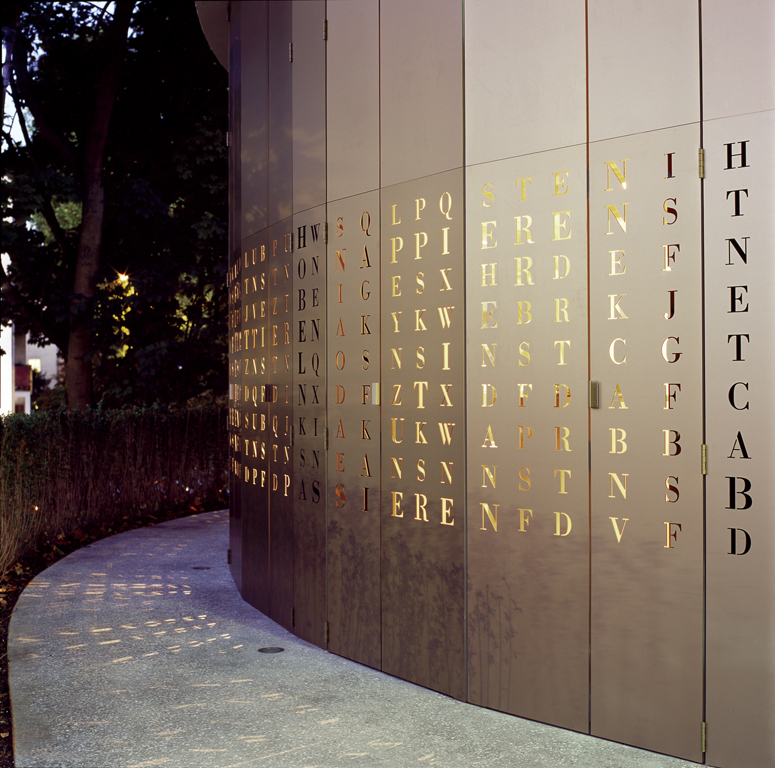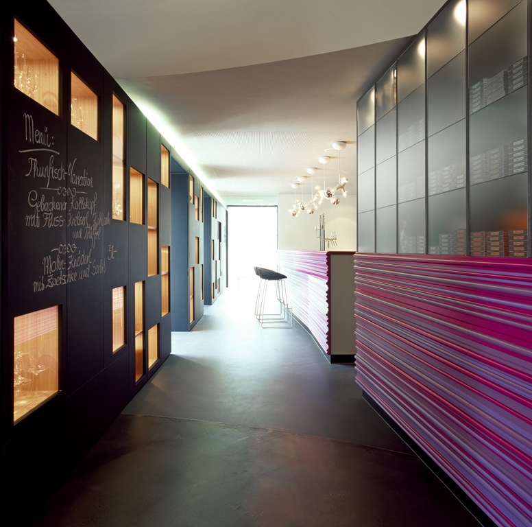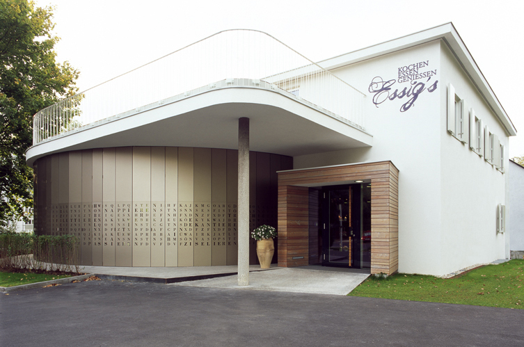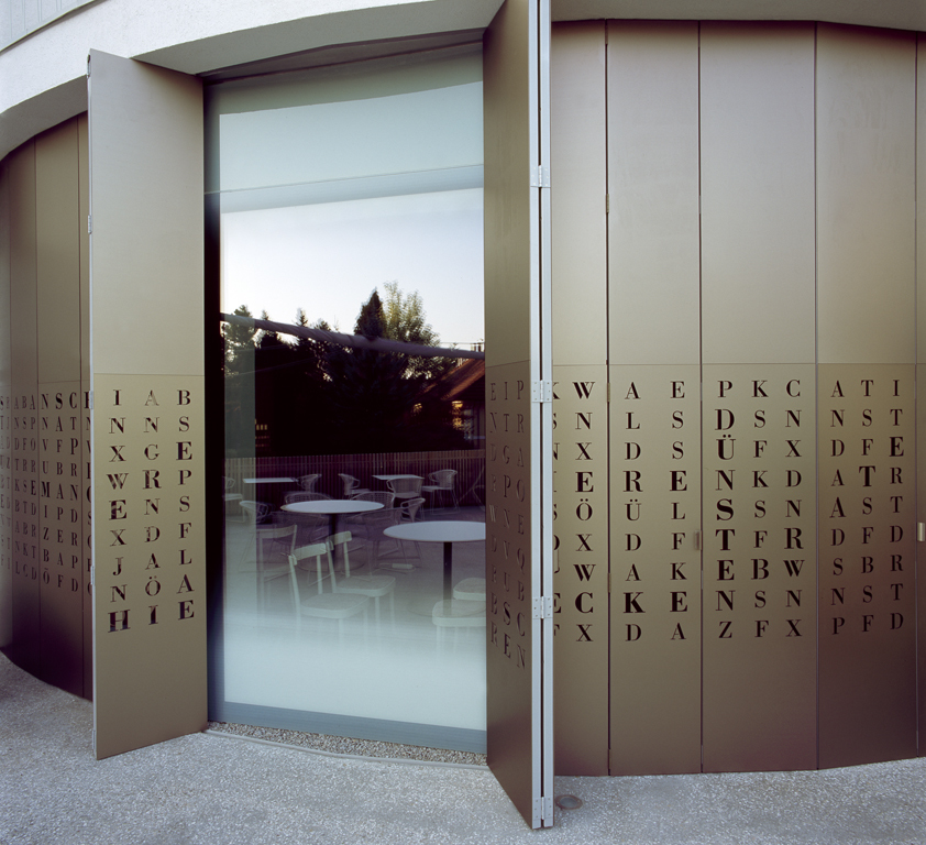 Durch Öffnen und Schließen der neu interpretierten Fensterläden wird die Präsenz der Archetypen weiter verstärkt. Die mit Buchstaben perforierten Fensterläden erzeugen spannende Lichtstimmungen–innen wie außen. Gleich einem Kreutzworträtsel haben sich Inmitten der Buchstabensuppe geordnete Begriffe aus der Kochwelt geformt, welche in geschlossenem Zustand der Läden lesbar werden. Das Schließen und öffnen der Läden verändert die Ausstrahlung des Gebäudes und signalisiert dem Gast die Öffnungszeiten.
