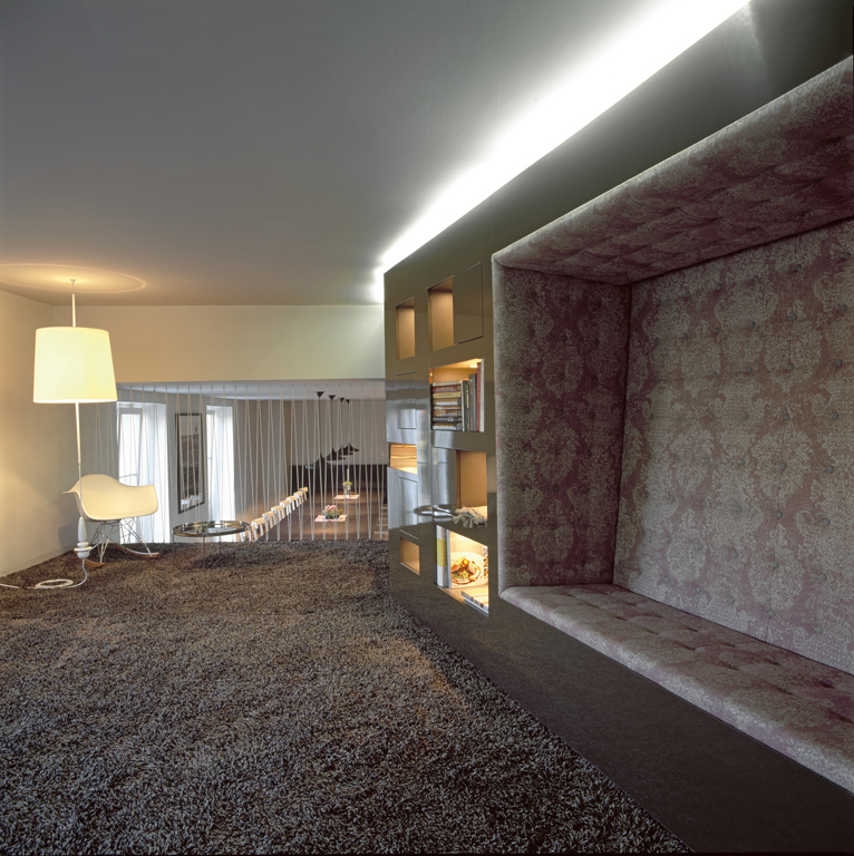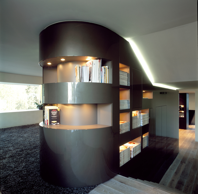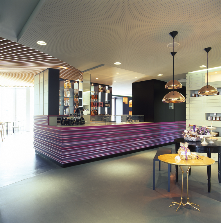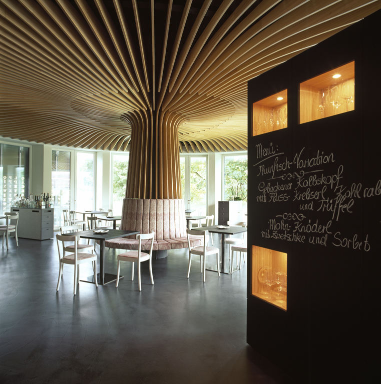 Der Innenraum des Restaurants ist wird zu einem vollständigen Kreis geöffnet. Die bestehende Stütze in der Mitte des Restaurants wird zu einer besitzbaren Raumskulptur die einen Fächer aus 140 radialen Holzlamellen aufspannt - der Kreis schließt sich. (Text: Architekten)