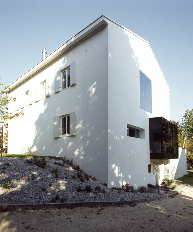 Im Wesentlichen generiert sich das bestehende Volumen aus zwei sich überlagernden archetypischen Formen – Quadrat und Kreis. Neue Bauteile werden in ähnlichen Formen –Dreieck und Rechteck hinzugefügt. Es entsteht ein additives System archetypischer Elemente welches durch ein subtiles Spiel unterschiedlicher Oberflächen sichtbar wird. Der schmale rechteckige Zubau glänzt in weißem Glasmosaik. Der bestehende Kubus glitzert durch seinen Glasperlenputz. Die Aluplatten des runden Restaurants schimmern in mattem Champagne.