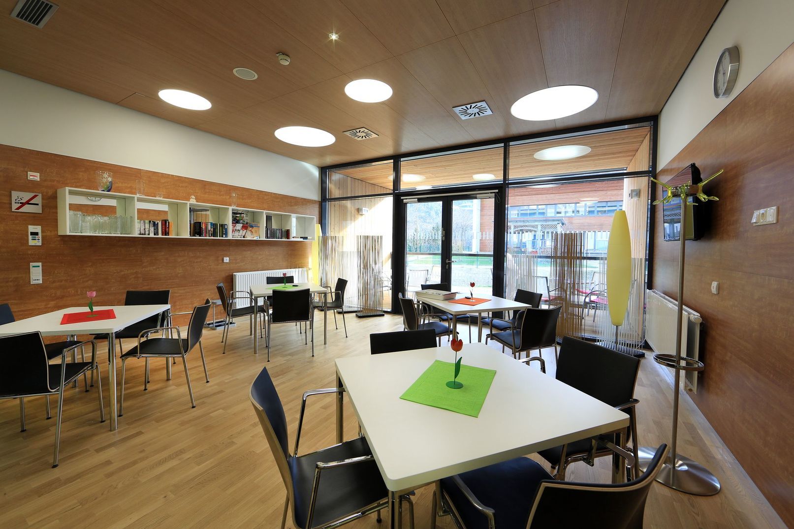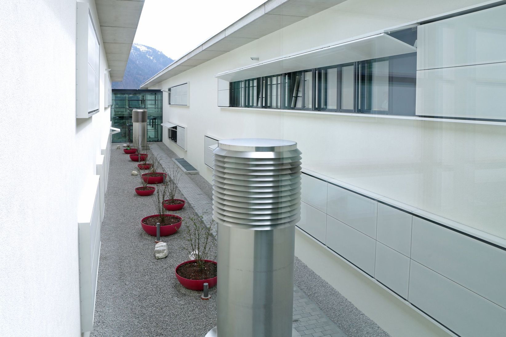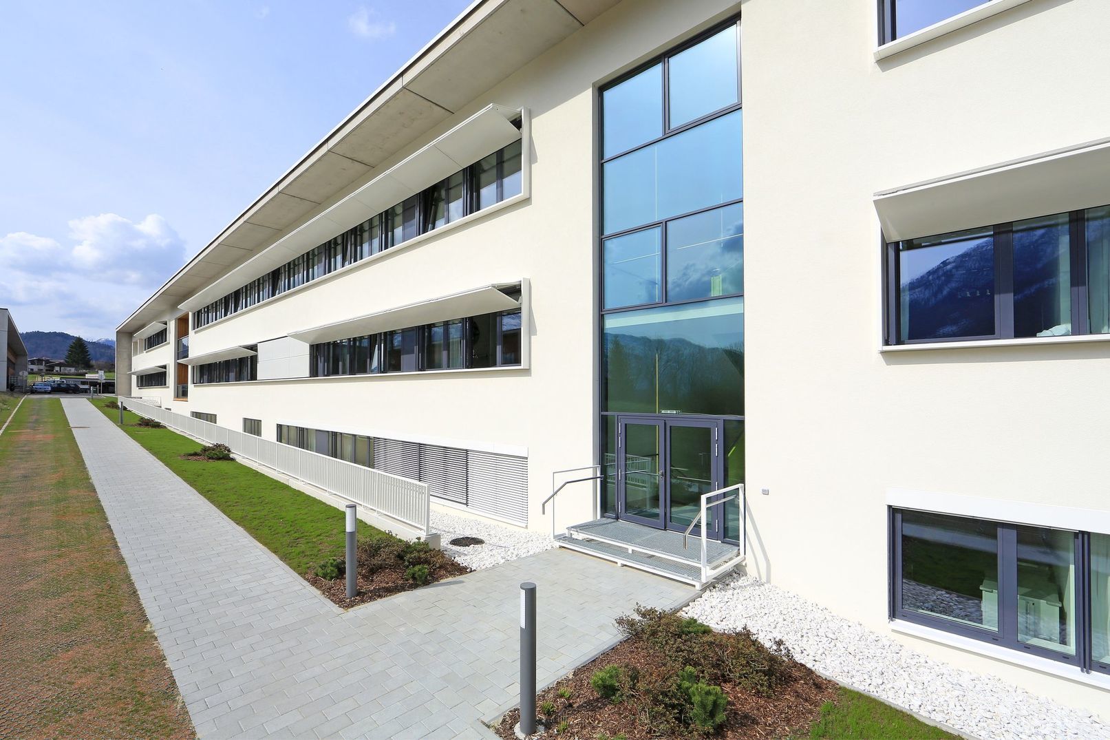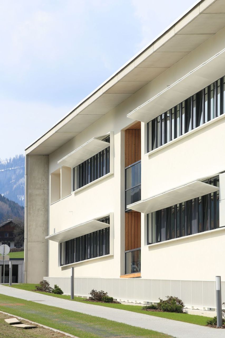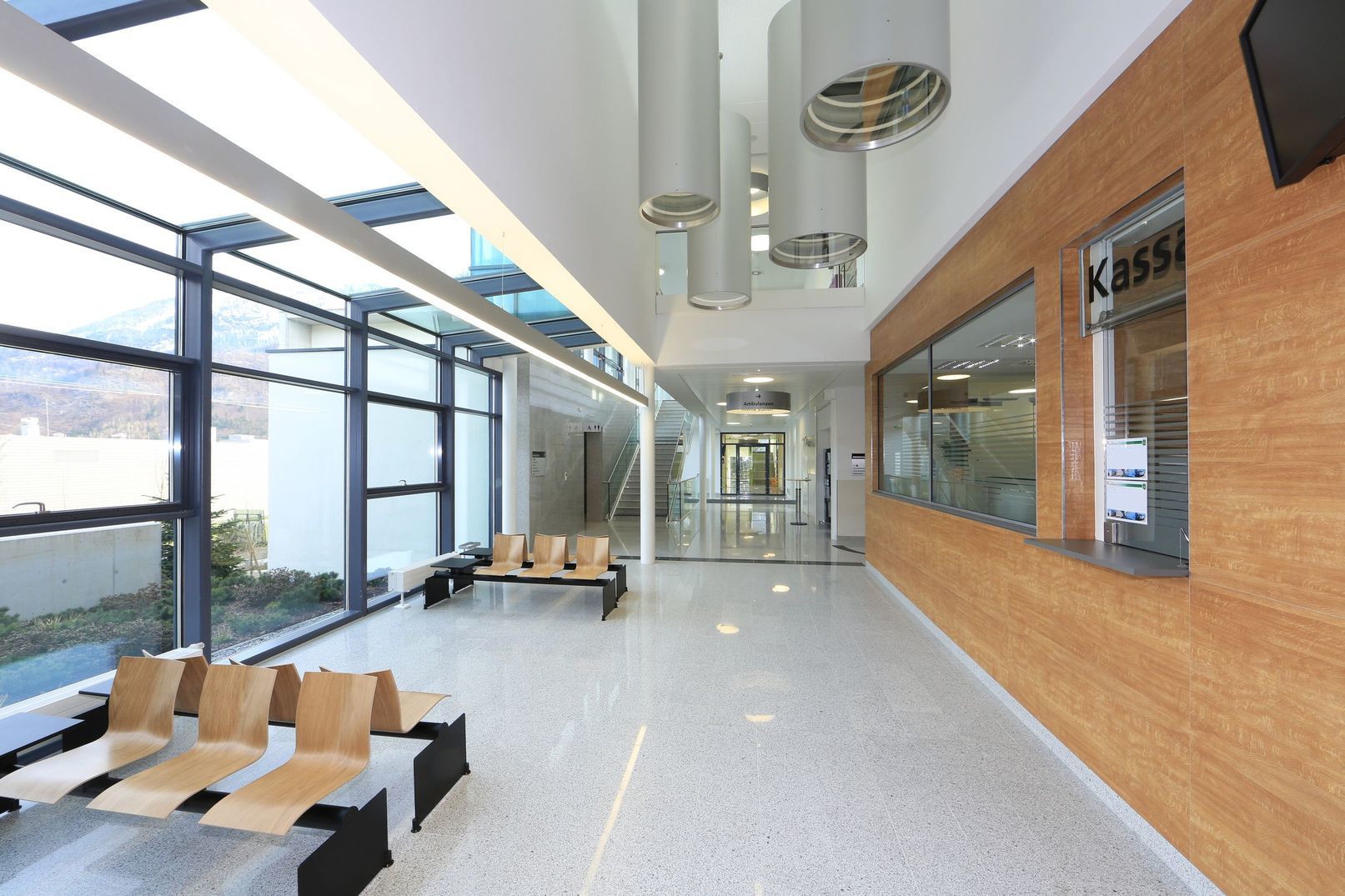 Der Gebäudekomplex besteht aus zwei längsorientierten Baukörpern – dem zur Bundesstraße zugewandten Funktionstrakt und dem südseitig angeordneten, lärmgeschützten Patienten-Zimmertrakt. Verbunden sind die Trakte durch transparente Gänge, die den Blick auf den Innenhof mit attraktiver Bepflanzung in magentafarbigen Rundtrögen freigeben. Die Gestaltung der Anlage ermöglicht Patienten, Besuchern und dem Personal gleichermaßen den bestechend schönen Ausblick auf die umgebende Berglandschaft.