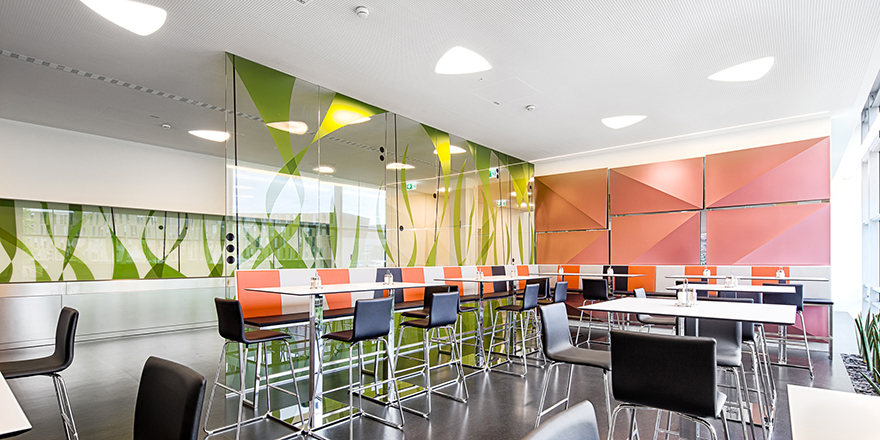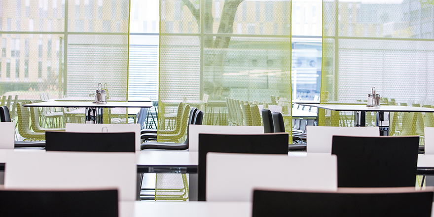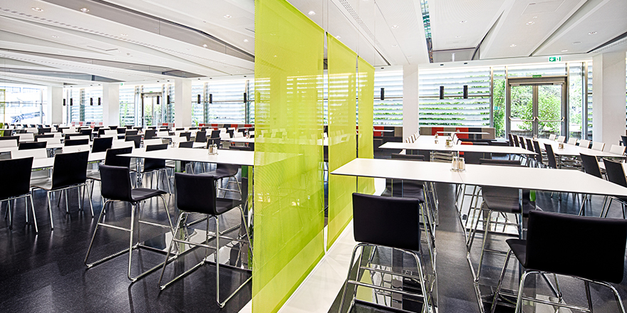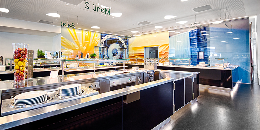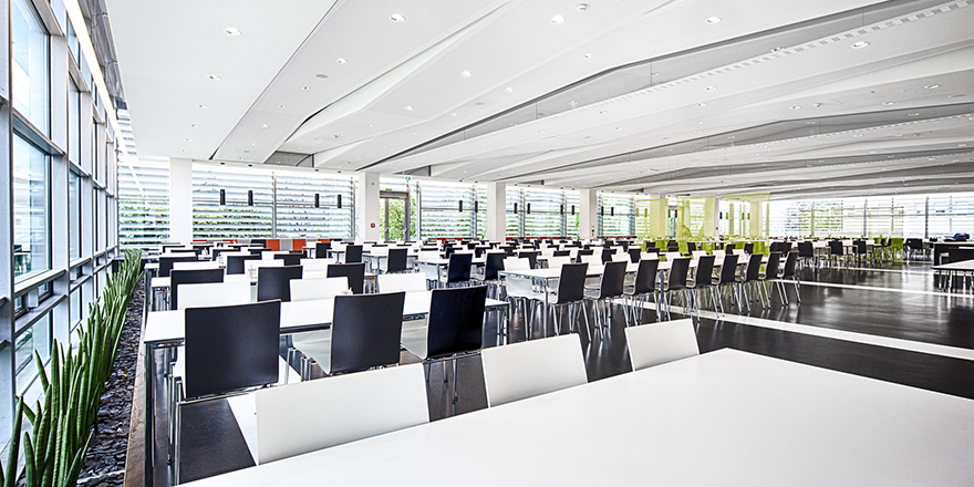 Nach der Errichtung der Klimahülle wird in einer zweiten Bauetappe der bestehende Speisesaal komplett neu adaptiert. Die bestehende Stahlbetonkonstruktion aus dem 70er Jahren bleibt sichtbar bzw wird bewusst betont. Die wellenförmige Deckengestaltung wird formal angelehnt an „Blechbänder“ der voestalpine bzw akustische Anforderungen entwickelt. Ein freeflow-Restaurant von Caseli mit neuester Technik (inkl. Sichtbaren Grillbereich) für 2000 Essen pro Tag entsteht. Dieser kann auch für Veranstaltungen aller Art genutzt werden. Unterschiedliche Möblierungen schaffen innerhalb des grossen Saales kleinere atmosphärische Bereiche. Verschiedene Beleuchtungskonzepte verstärken dies. (Text: Architekten)
