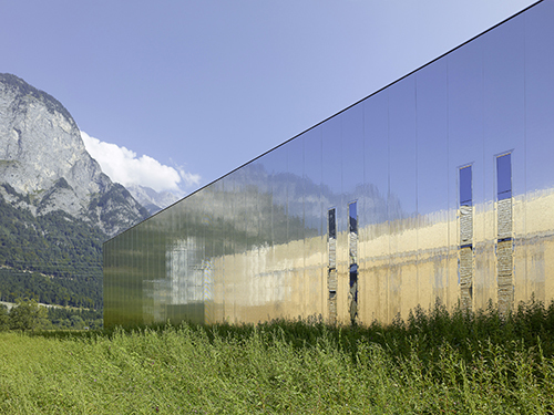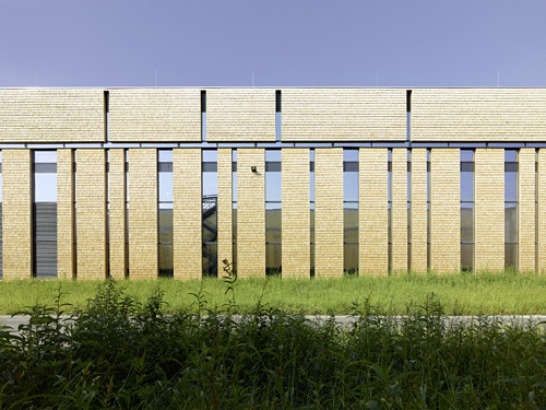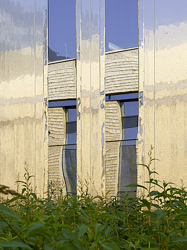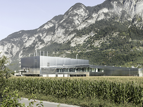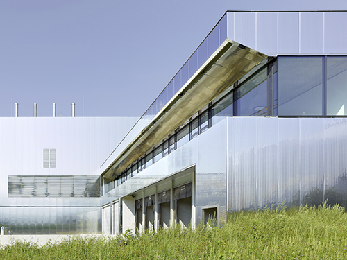 Das Technikgebäude verbindet als ebenfalls verspiegelter Monolith die beiden Bereiche mittig. Von hier können die Gebäude auch im Erweiterungsfall angedient werden. Es beinhaltet neben den technischen Einbauten auch Empfang, Schulung und Verkauf und wird über eine Brücke vom Parkplatz aus erschlossen. Dieser Vorbereich steigt naturnah gestaltet aus der Landschaft an und führt die Angestellten und Besucher ins Gebäude, ohne die Anlieferebene zu tangieren.