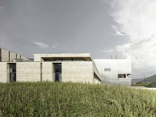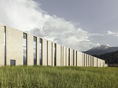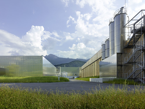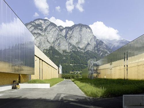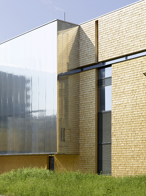 Notwendig wurde der Neubau, weil das bestehende Werk 2011 nach einem Vollbrand unbrauchbar war. Auf einem neu erschlossenen Betriebsgelände in unmittelbarer Nähe zur Zentrale wurden zwei Produktionsgebäude errichtet, die über einen Technikkörper verbunden sind, der die jeweiligen Verwaltungsbereiche integriert und miteinander verschneidet. Funktional und gestalterisch sprechen die beiden Gebäude eine sehr unterschiedliche Sprache. Die Großbäckerei erhielt – analog einer Brotkruste – eine Fassade aus Fichtenschindeln, vertikale Fensterbänder strukturieren das Volumen und nehmen ihm die sonst bei Industriefassaden übliche Härte und Monotonie. Die Bereiche für Büro und Konditorei wurden nach additivem Prinzip als Erweiterungsflächen auf den Bauköper aufgesetzt. Im Gegensatz dazu entschied man sich beim Fleischereigebäude für ein integratives System. Eine gemeinsame Hülle aus vollverspiegelten Metallpaneelen umschließt als „messerscharfer“ Metallblock mit harten Kanten sämtliche Bereiche der Fleisch-Produktion einschließlich der Büros.
