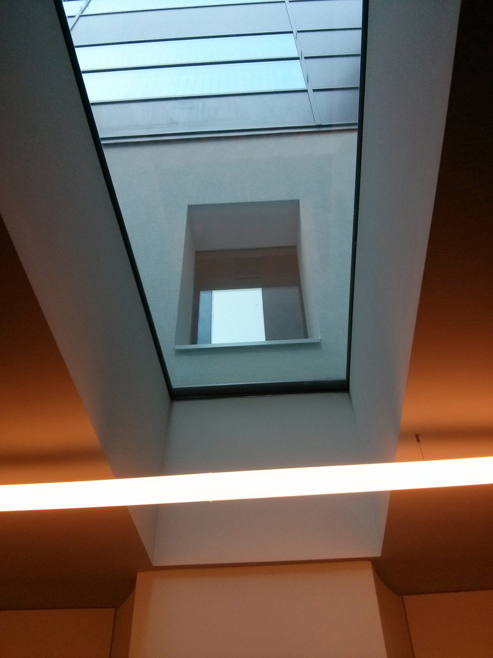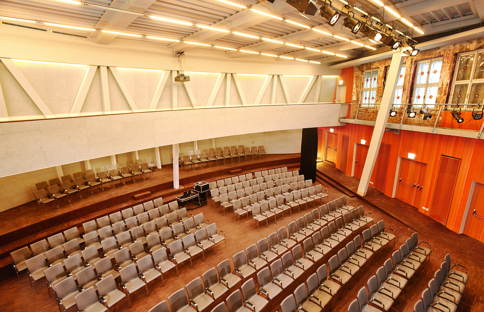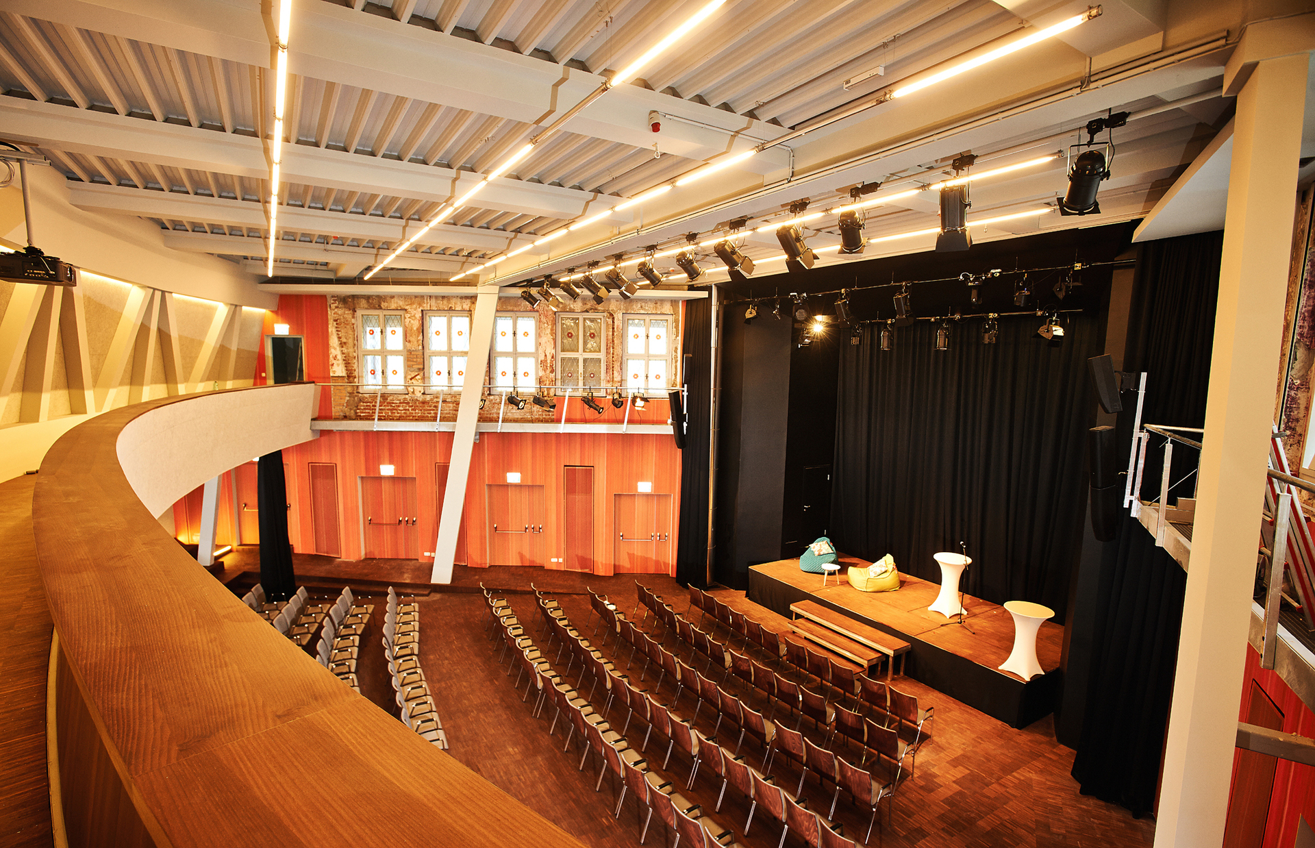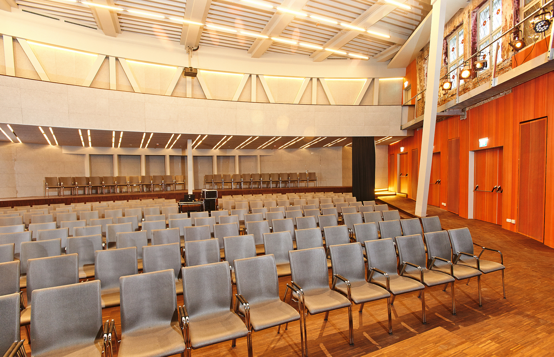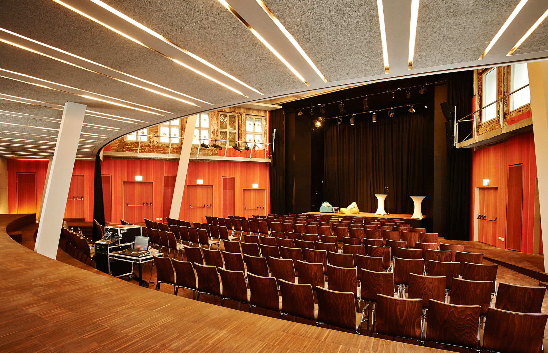 Der Saal der ursprünglich mit einer Holzkonstruktion überbaut war, wurde mit einer massiven Deckenkonstruktion überspannt. Die darüberliegenden zwei Bürogeschosse wurden stützenlos nur mit einer Wandschcheibe konzipiert. Diese Aufbauten sind in Leichtbauweise gebaut und auf die vorhandene Struktur gesetzt. (Text: Architekten)
