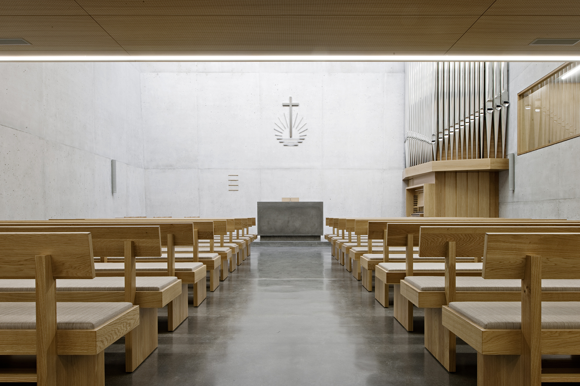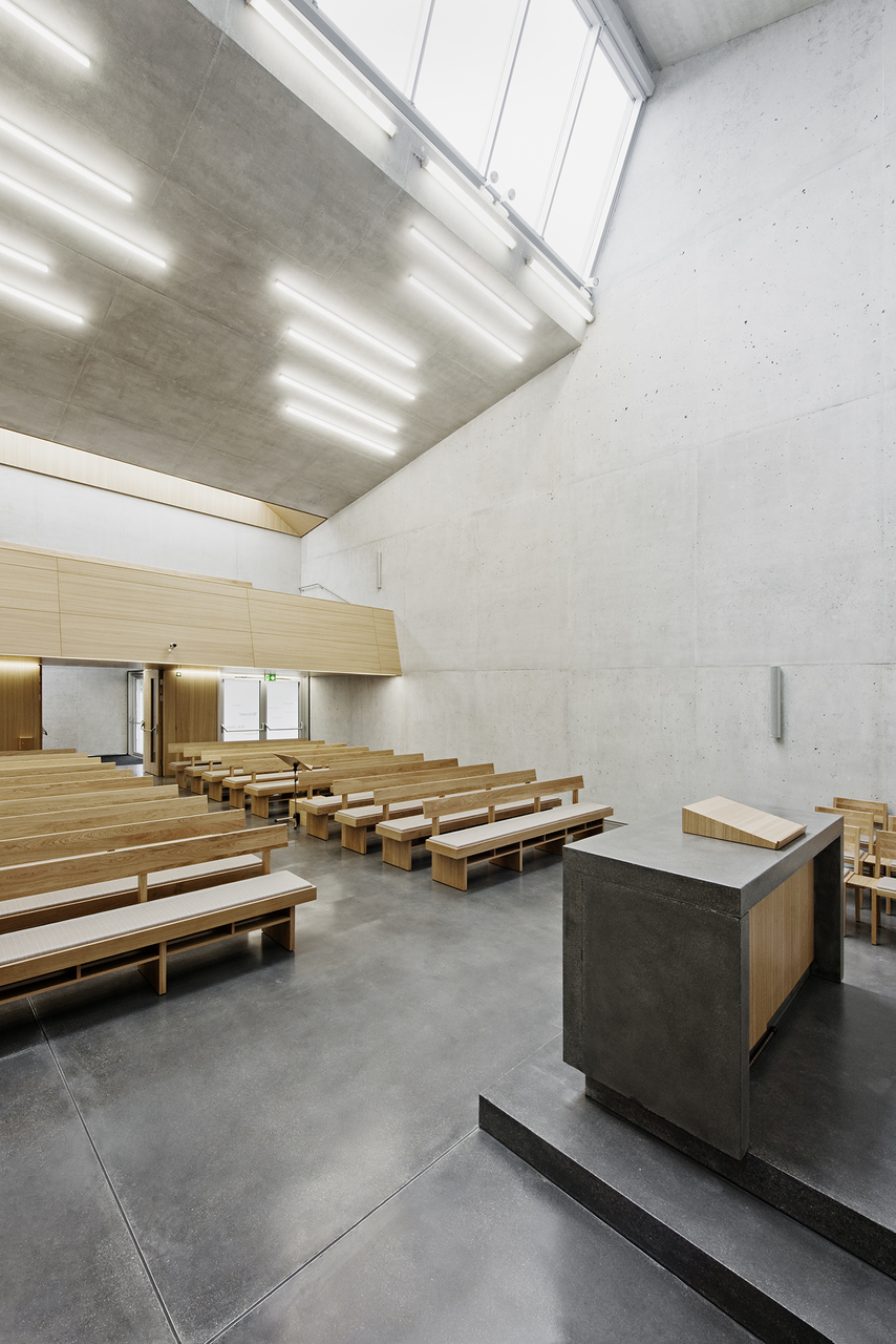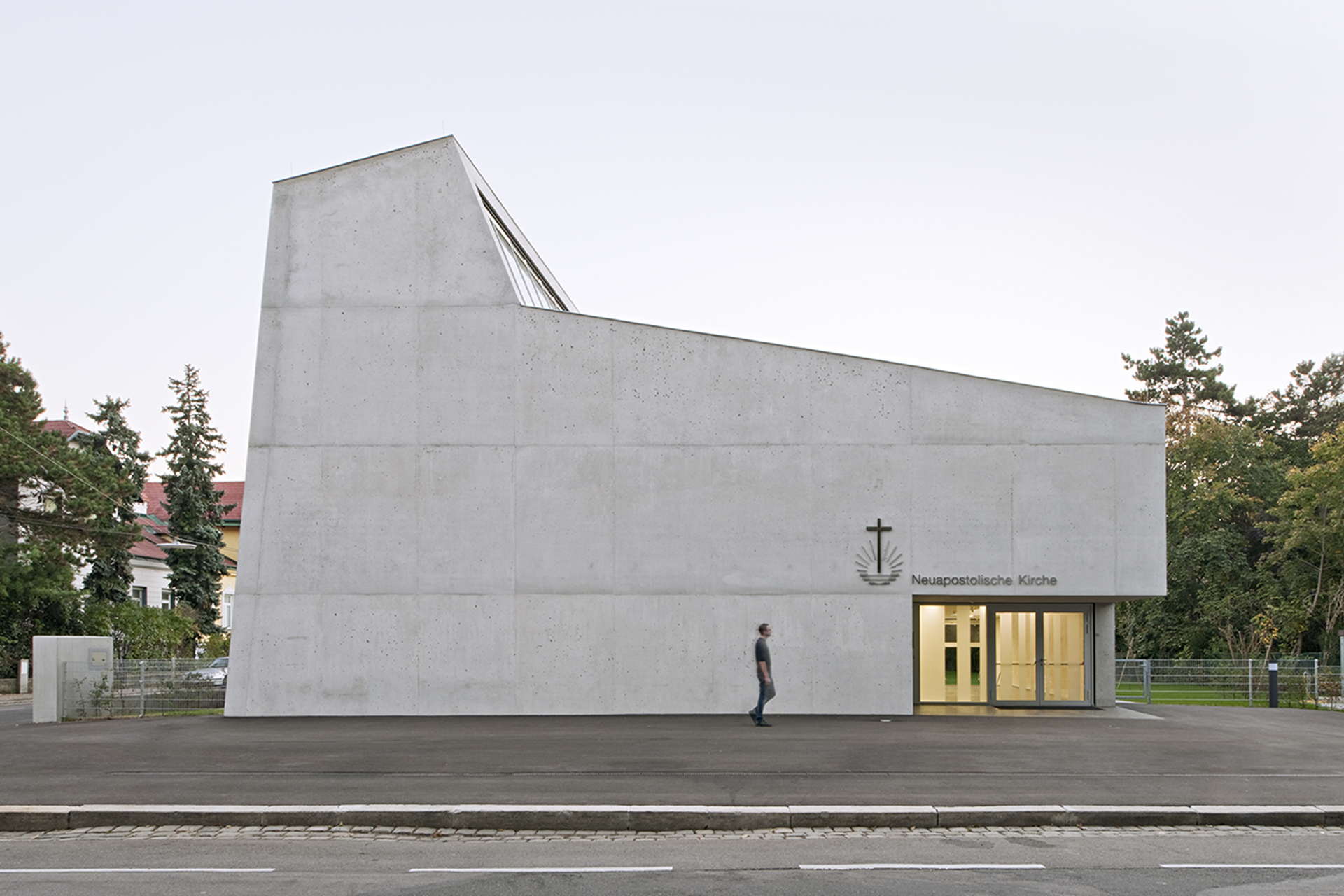 Das Bauwerk aus Leichtbeton steht in exponierter Lage an einer Kreuzung in einem Villenviertel im Westen Wiens und zeigt sich zum Straßenraum hin reserviert. Ein Einschnitt in der Straßenfassade formt den Eingang, der in ein helles Foyer mit seitlichen Oberlichten führt. Auffällig am gesamten Entwurf sind die wohldosierten, äußerst präzise platzierten Tageslichtakzente. Im Kirchenraum öffnet eine nach Nordwesten orientierte schräge Oberlichte die Decke und stattet den Kirchenraum mit einer kontemplativen Atmosphäre aus. Die 10 Meter hohe helle Betonwand hinter dem Alter wird vom indirekten Lichteinfall erhellt, wobei der mineralische Beton das einfallende Licht diffus reflektiert. Im Zusammenspiel von Licht und Material entsteht eine ruhige, konzentrierte Stimmung – ideal für einen Sakralraum.