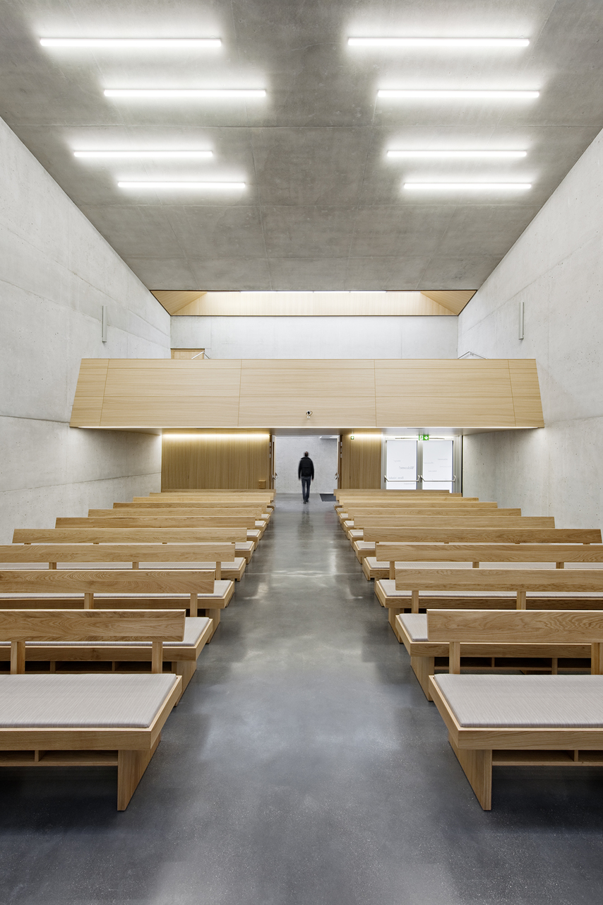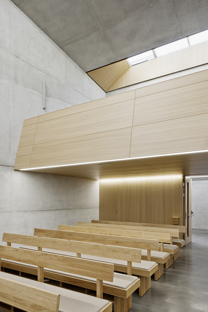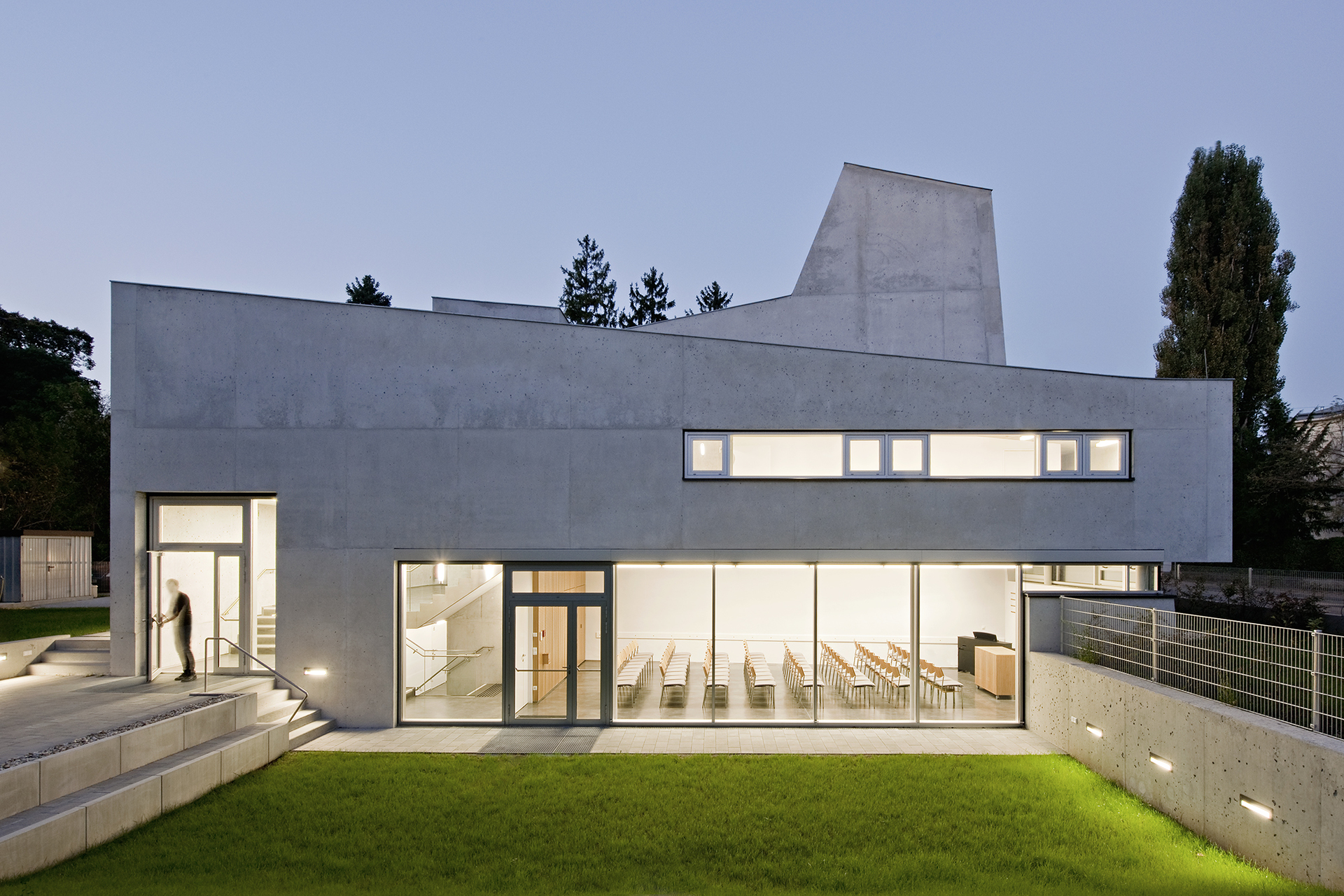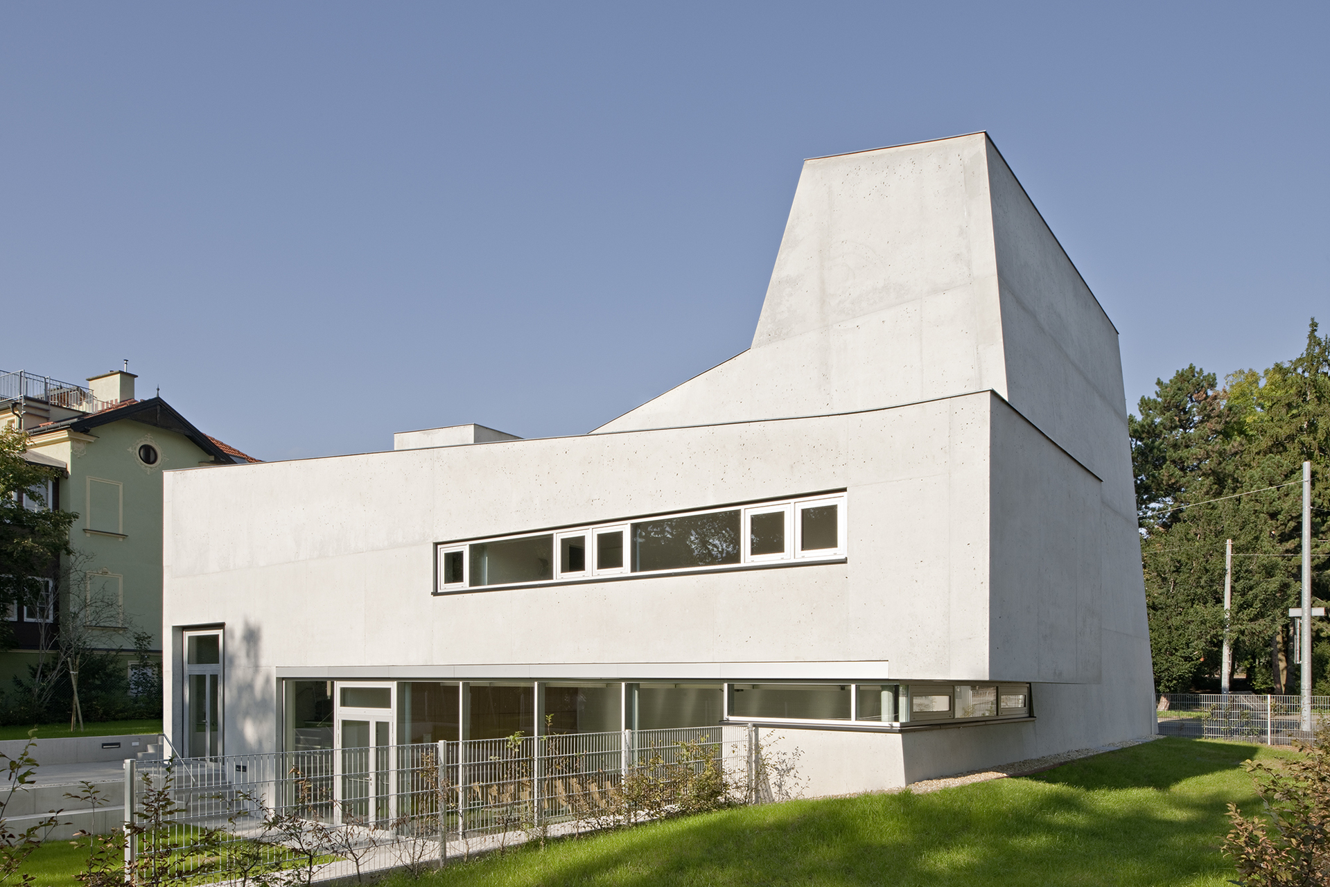 Das Bauwerk aus Leichtbeton steht in exponierter Lage an einer Kreuzung in einem Villenviertel im Westen Wiens und zeigt sich zum Straßenraum hin reserviert. Ein Einschnitt in der Straßenfassade formt den Eingang, der in ein helles Foyer mit seitlichen Oberlichten führt. Auffällig am gesamten Entwurf sind die wohldosierten, äußerst präzise platzierten Tageslichtakzente. Im Kirchenraum öffnet eine nach Nordwesten orientierte schräge Oberlichte die Decke und stattet den Kirchenraum mit einer kontemplativen Atmosphäre aus. Die 10 Meter hohe helle Betonwand hinter dem Alter wird vom indirekten Lichteinfall erhellt, wobei der mineralische Beton das einfallende Licht diffus reflektiert. Im Zusammenspiel von Licht und Material entsteht eine ruhige, konzentrierte Stimmung – ideal für einen Sakralraum.
