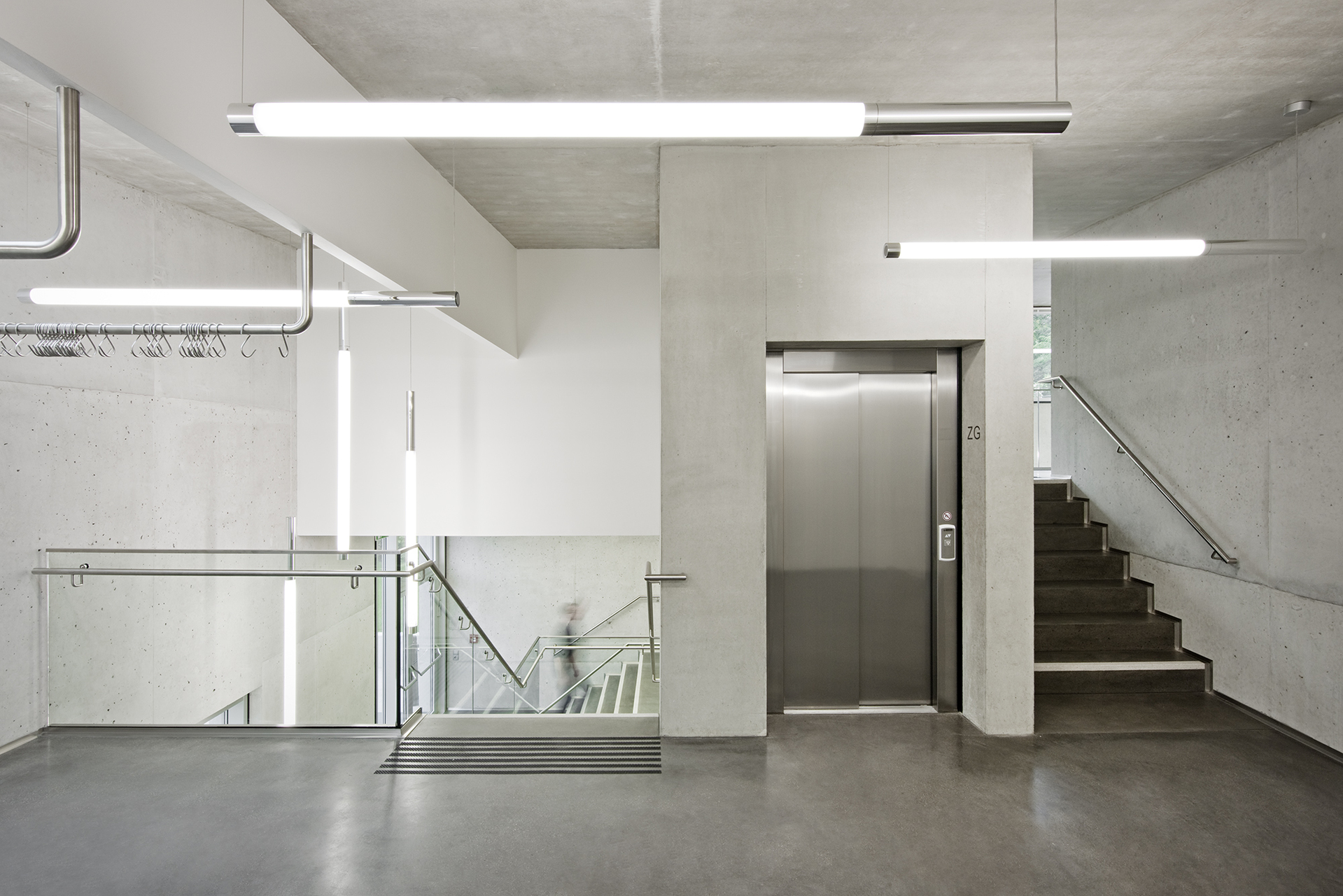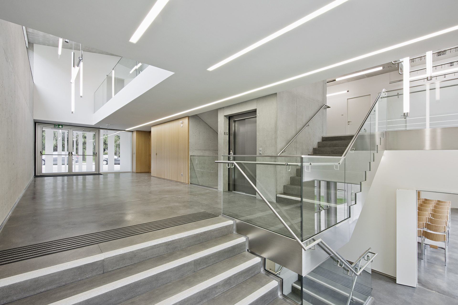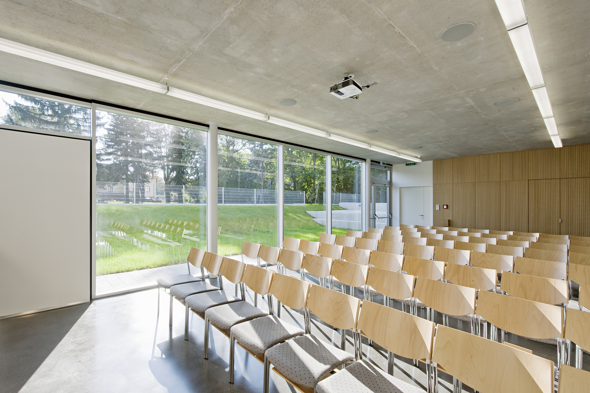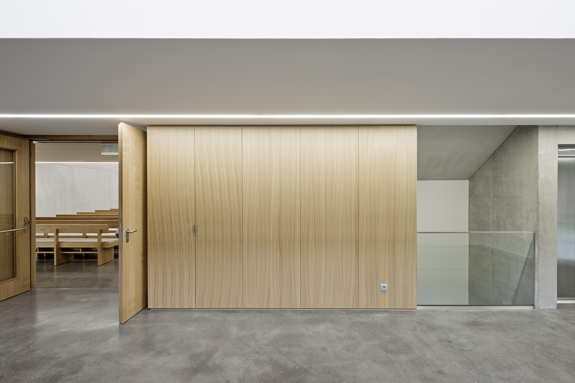 Neben dem Kirchenraum mit 145 Plätzen und Empore mit zusätzlichen 30 Sitzplätzen befinden sich halbgeschossig – nach oben und unten versetzt – diverse Veranstaltungs- und Verwaltungsräume. Die Erschließungszonen im Gebäude sind allesamt als großzügige Kommunikationszonen angelegt und ermögichen Ausblicke in den angrenzenden Pfarrgarten. In den oberen Geschossen befinden sich neben dem eingangs erwähnten „Logenraum“ für Kinder die Verwaltungsräume und Räume für Kindergruppen und Religionsunterricht. Im Untergeschoss befindet sich ein Mehrzwecksaal mit Platz für 75 Personen. Die tiefergelegte vorgelagerte Freifläche ermöglicht eine niveaugleiche Erweiterung in den Freibereich, die bei Pfarrfesten immer willkommen ist. Das i-Tüpfelchen ist der im Zuge des Neubaus verbreitete Gehsteig vor der Kirche, der jetzt als Kirchenvorplatz wahrgenommen und genutzt wird. (Text: Martina Frühwirth, nach einem Text der Architekten)