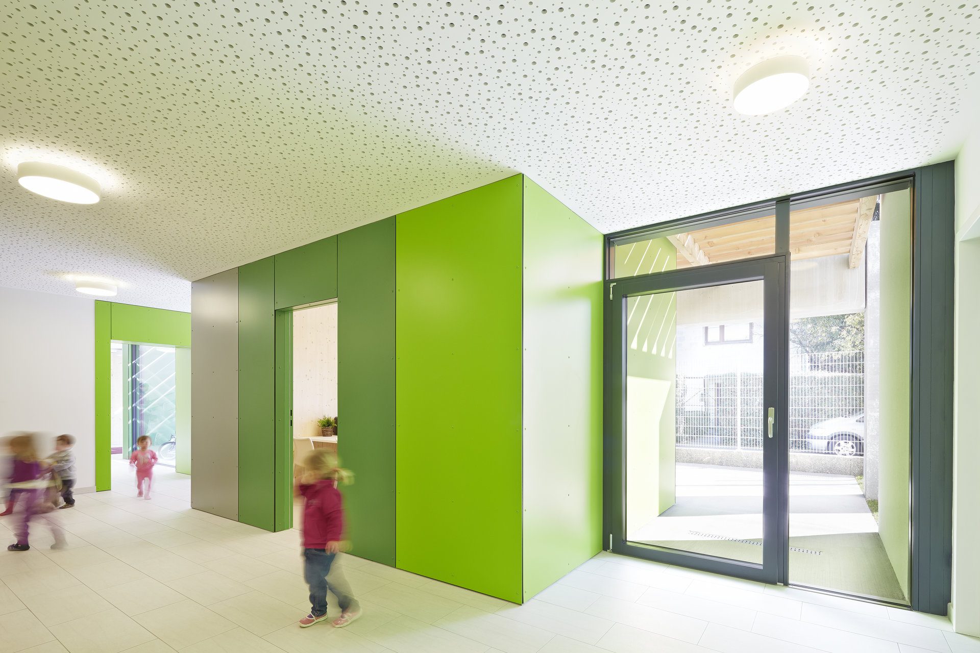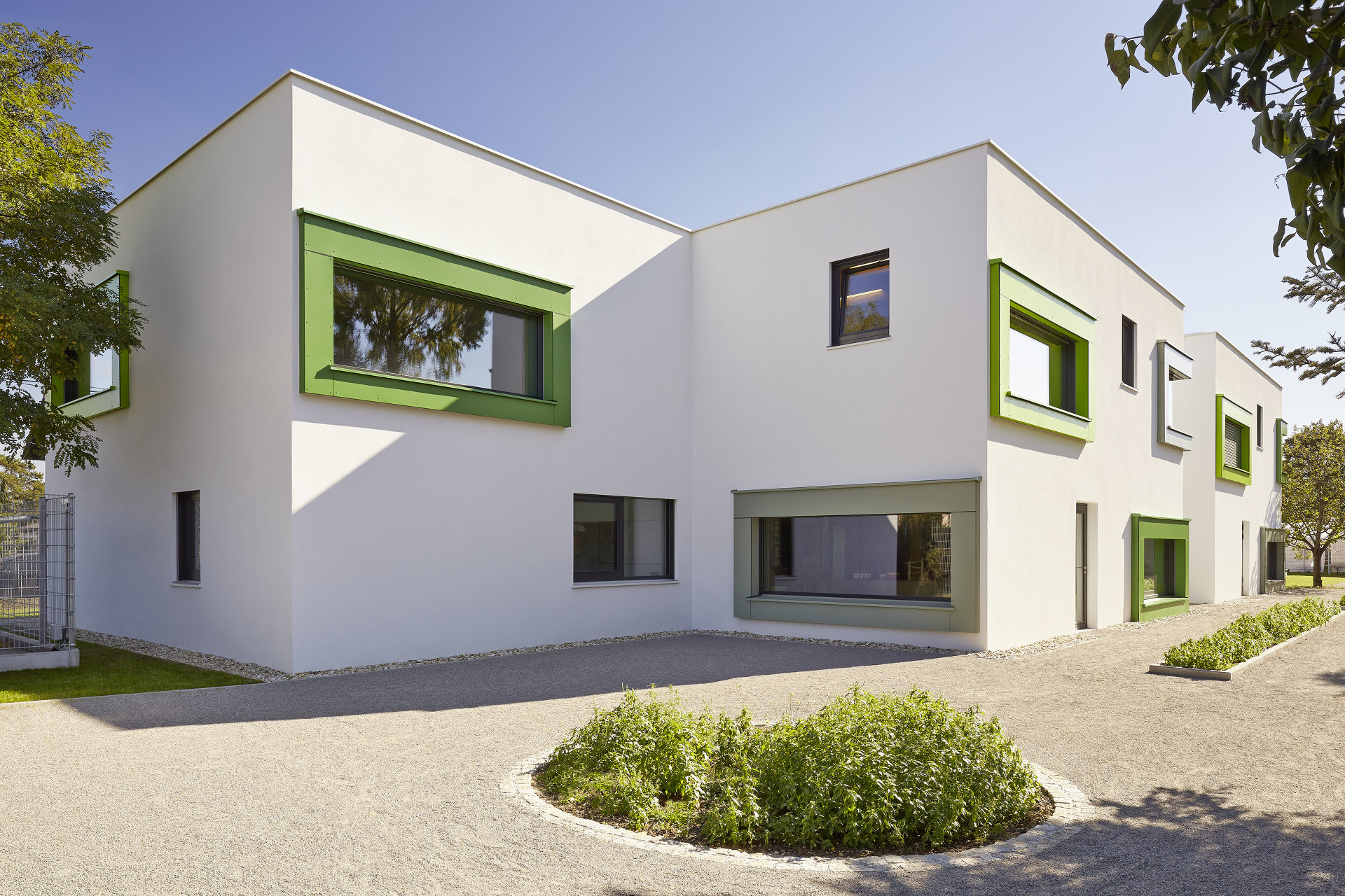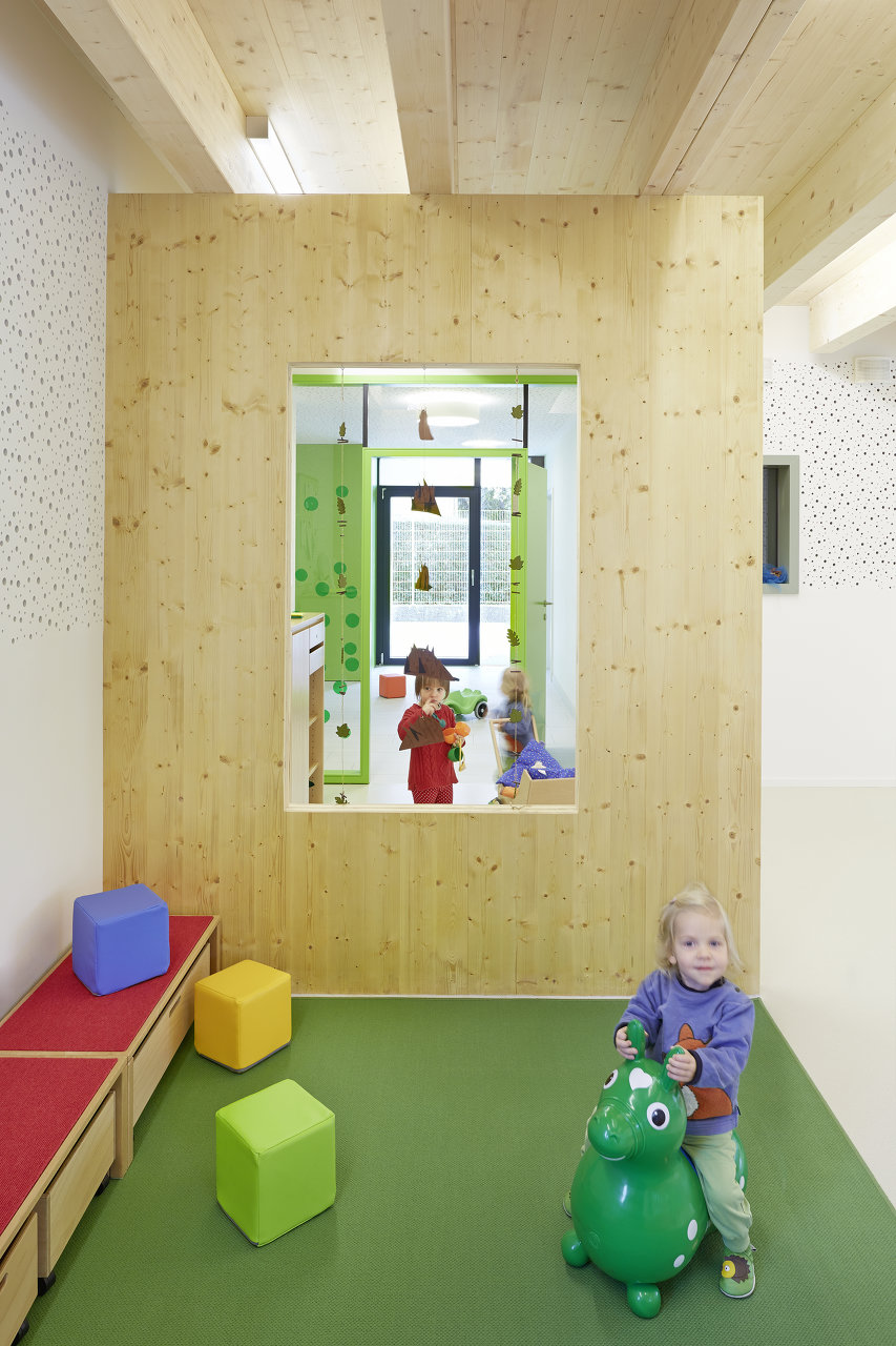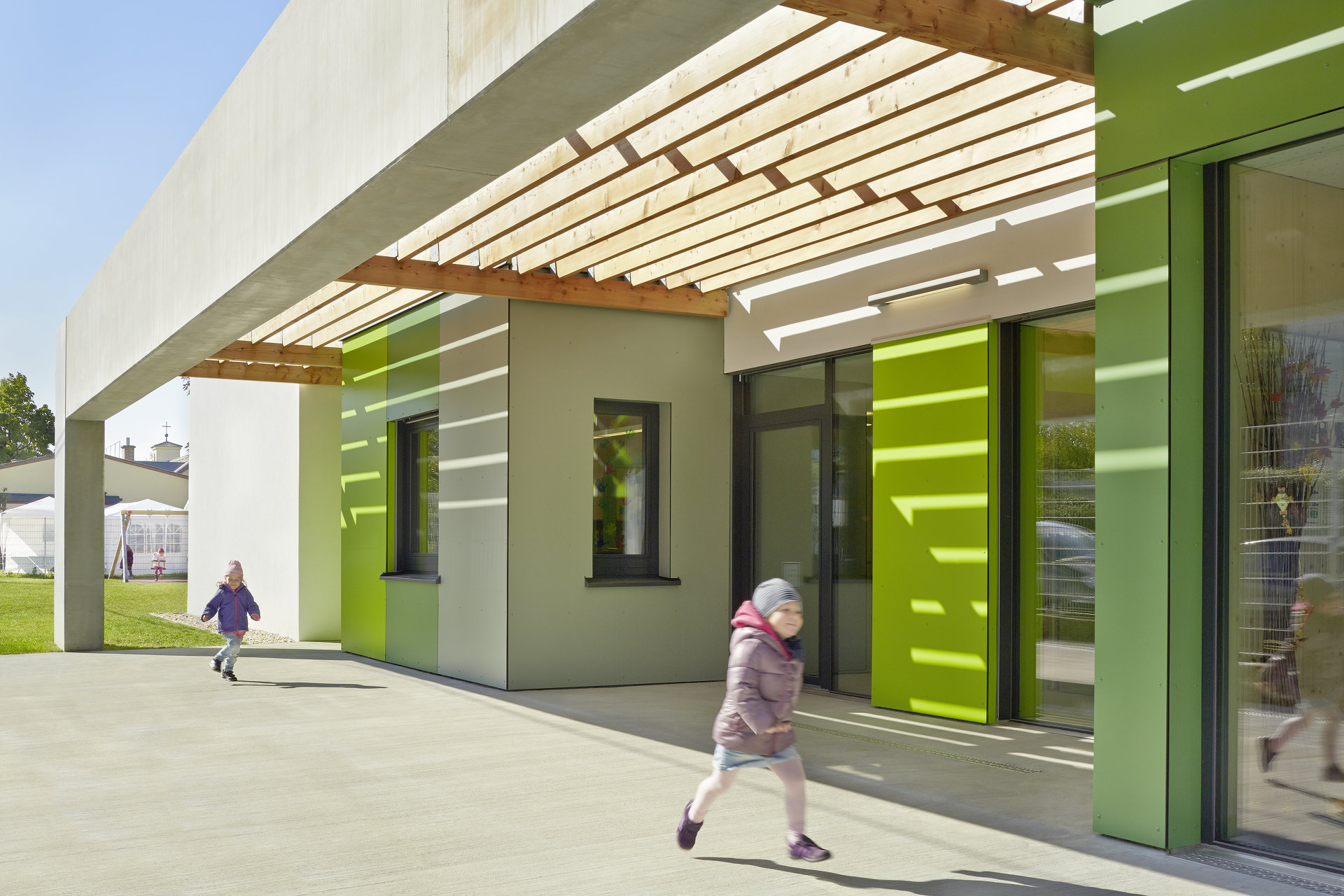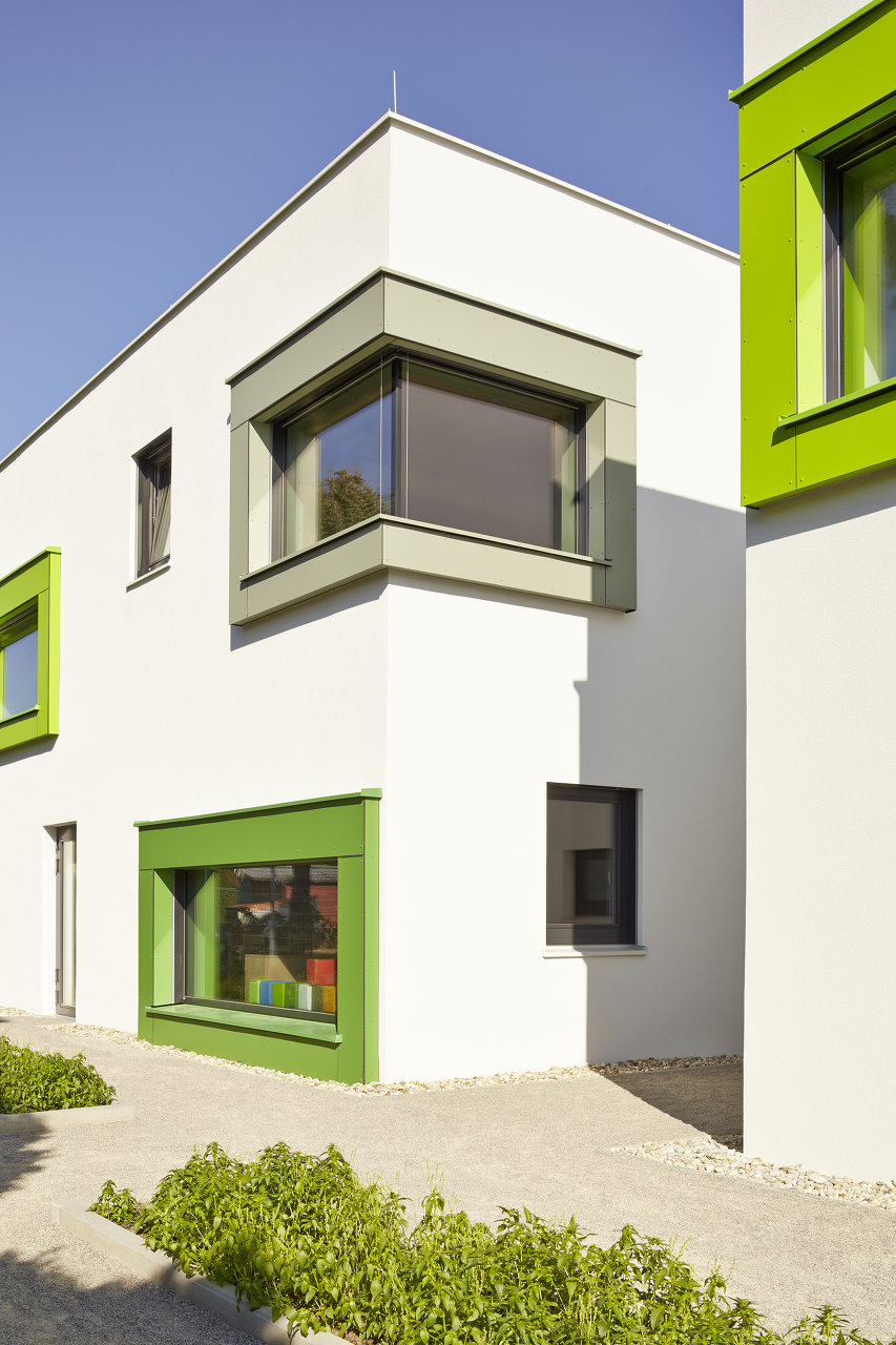 Die Gliederung des Baukörpers spiegelt die Funktionen im Gebäude wider: Gruppen, Verwaltung und der als Erschließung fungierende Spielflur. Dem Gebäude vorgesetzt ist als einladendes Tor ein großer Stahlbetonrahmen, der gleichzeitig die Pergola trägt. Die großen Verglasungen in den Gruppenräumen mit niedriger Brüstungshöhe bieten auch den kleinsten Kindern Aussicht ins Freie. Die Umrahmungen sind mit Fassadenplatten in verschiedenen Farbtönen der Leitfarbe Grün verkleidet und geben sowohl dem Blick nach außen als auch dem Blick vom Garten in die Gruppen hinein die Qualität eines gerahmten Bildes. Elemente wie diese Fensterumrahmungen, die zurückgesetzten Verglasungen des Spielflurs und der in zentraler Stelle verortete Kubus mit dem Büro der Leiterin machen die Funktionen des Gebäudes außen ablesbar. (gekürzter Text der Architekten)