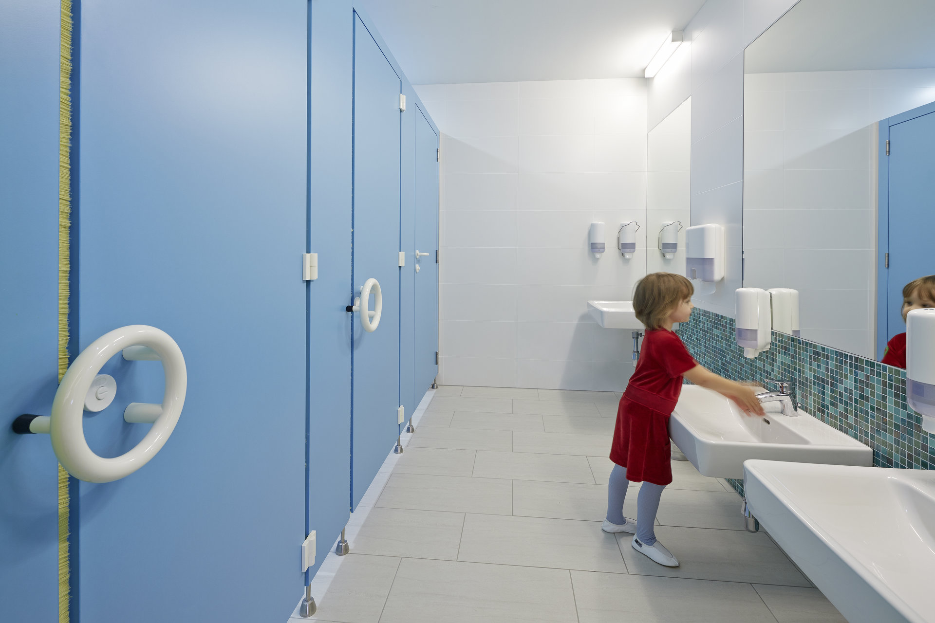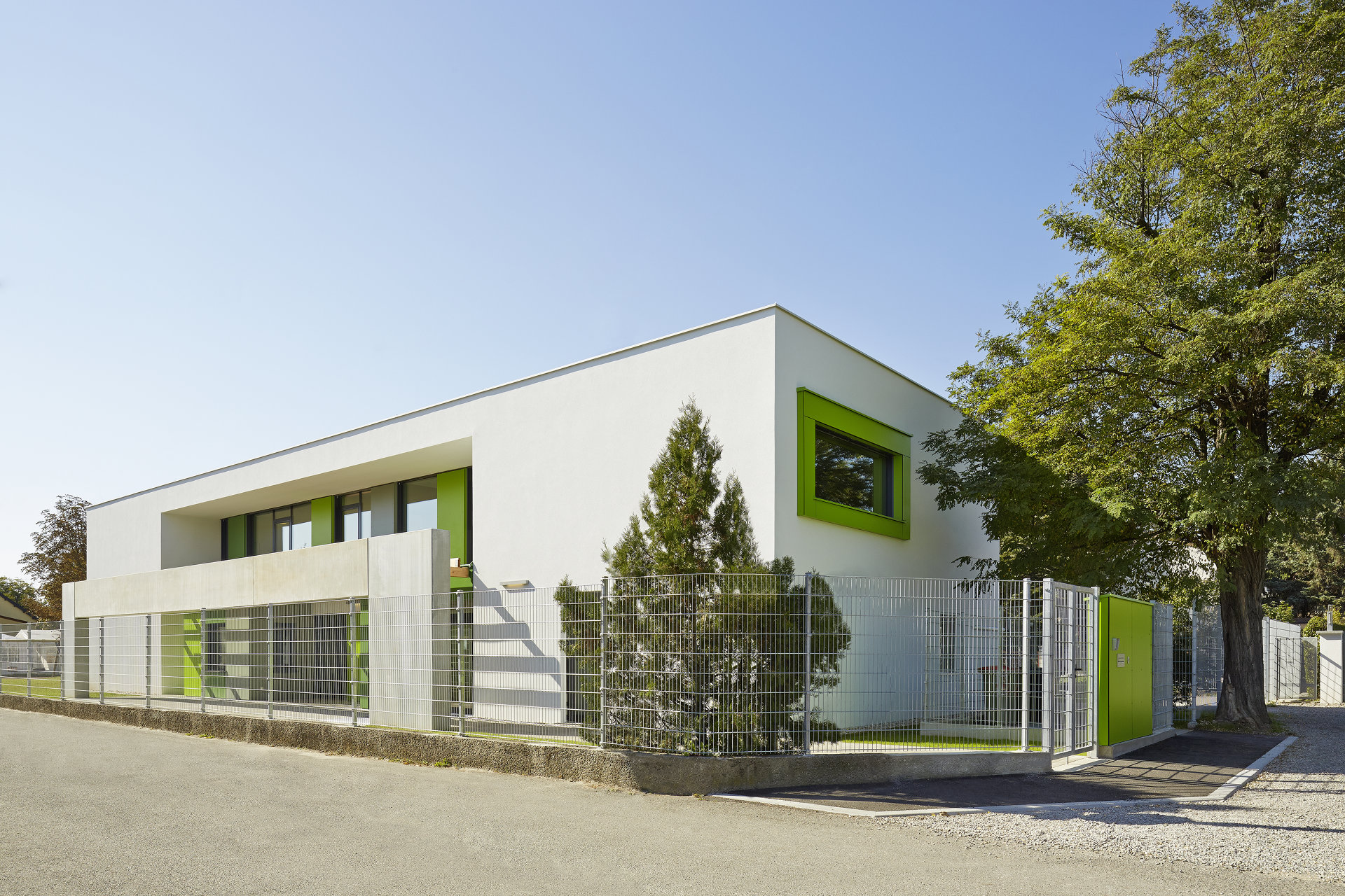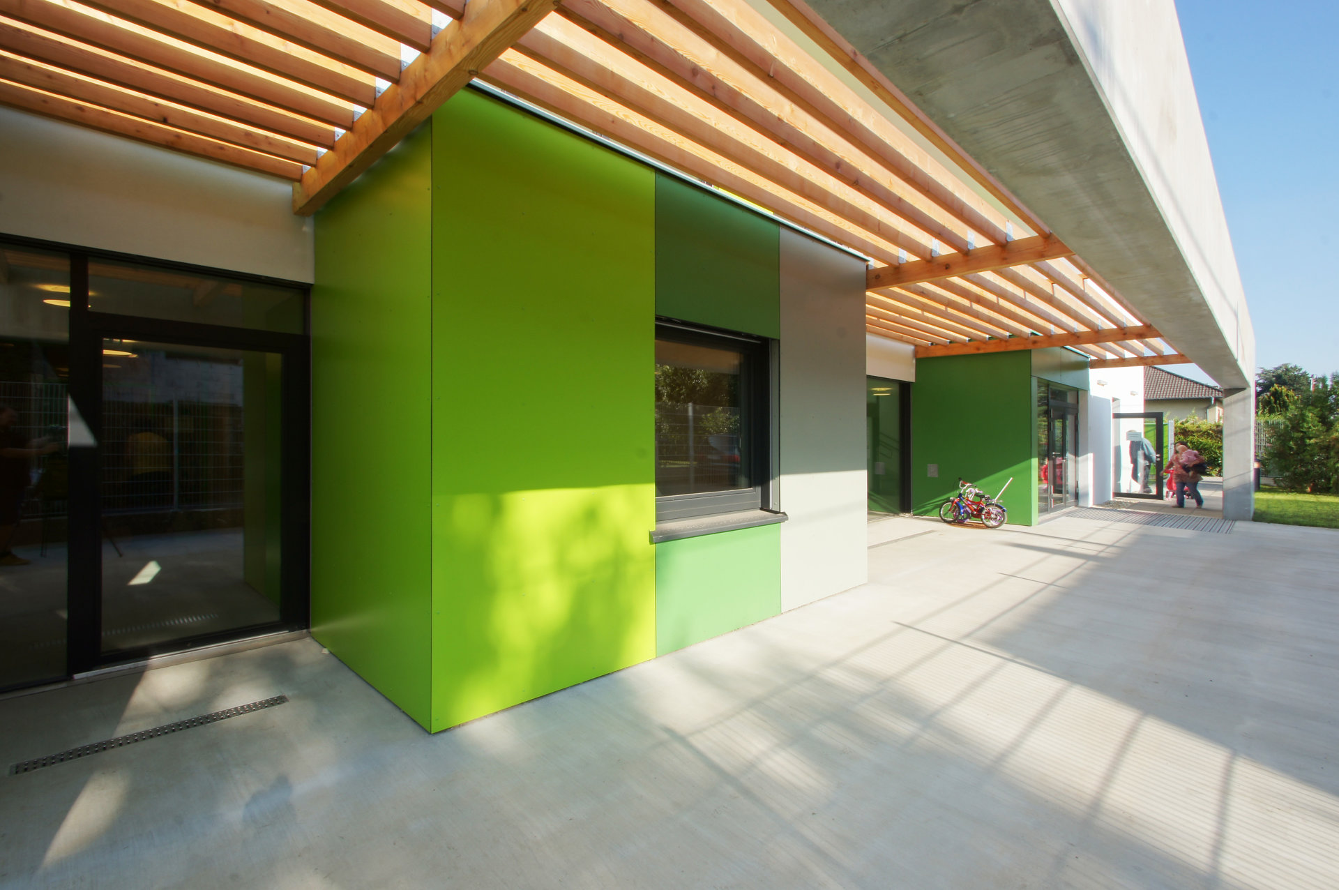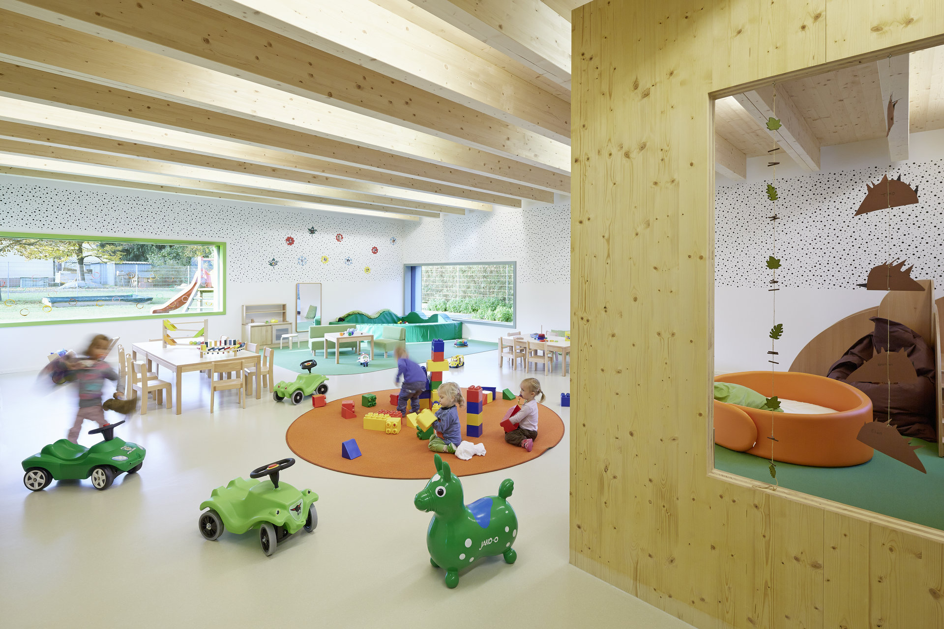 Die Gliederung des Baukörpers spiegelt die Funktionen im Gebäude wider: Gruppen, Verwaltung und der als Erschließung fungierende Spielflur. Dem Gebäude vorgesetzt ist als einladendes Tor ein großer Stahlbetonrahmen, der gleichzeitig die Pergola trägt. Die großen Verglasungen in den Gruppenräumen mit niedriger Brüstungshöhe bieten auch den kleinsten Kindern Aussicht ins Freie. Die Umrahmungen sind mit Fassadenplatten in verschiedenen Farbtönen der Leitfarbe Grün verkleidet und geben sowohl dem Blick nach außen als auch dem Blick vom Garten in die Gruppen hinein die Qualität eines gerahmten Bildes. Elemente wie diese Fensterumrahmungen, die zurückgesetzten Verglasungen des Spielflurs und der in zentraler Stelle verortete Kubus mit dem Büro der Leiterin machen die Funktionen des Gebäudes außen ablesbar. (gekürzter Text der Architekten)