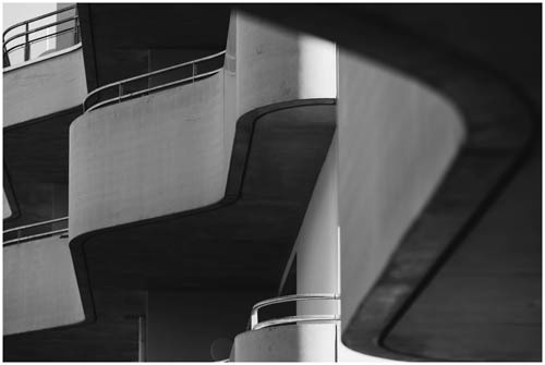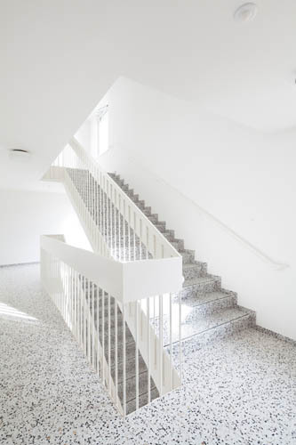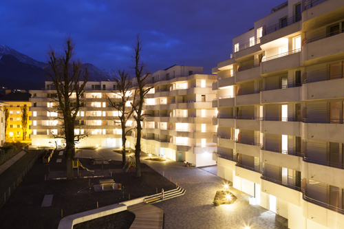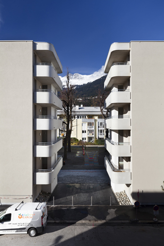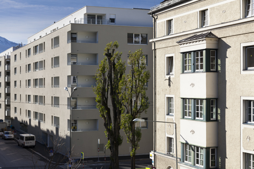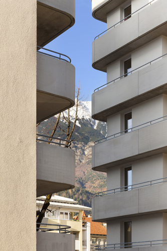 Ausgehend von den Wohnungen baut sich das Gebäude in Schichten auf, wobei die letzte Schicht zum Innenhof aus einer wellenförmigen Balkonzone besteht. Die Wellenform ergibt sich aus der Einteilung der Balkone in tiefere, gut nutzbare Außenräume und sehr schmale Bereiche im Übergang zu den Nachbarwohnungen, womit ohne zusätzliche Trennelemente eine entsprechende Privatheit gewährleistet wird. Herz der Wohnanlage ist der große grüne Innenhof, der rund um vier hohe, alte Linden neu gestaltet wurde. (Text: Claudia Wedekind)