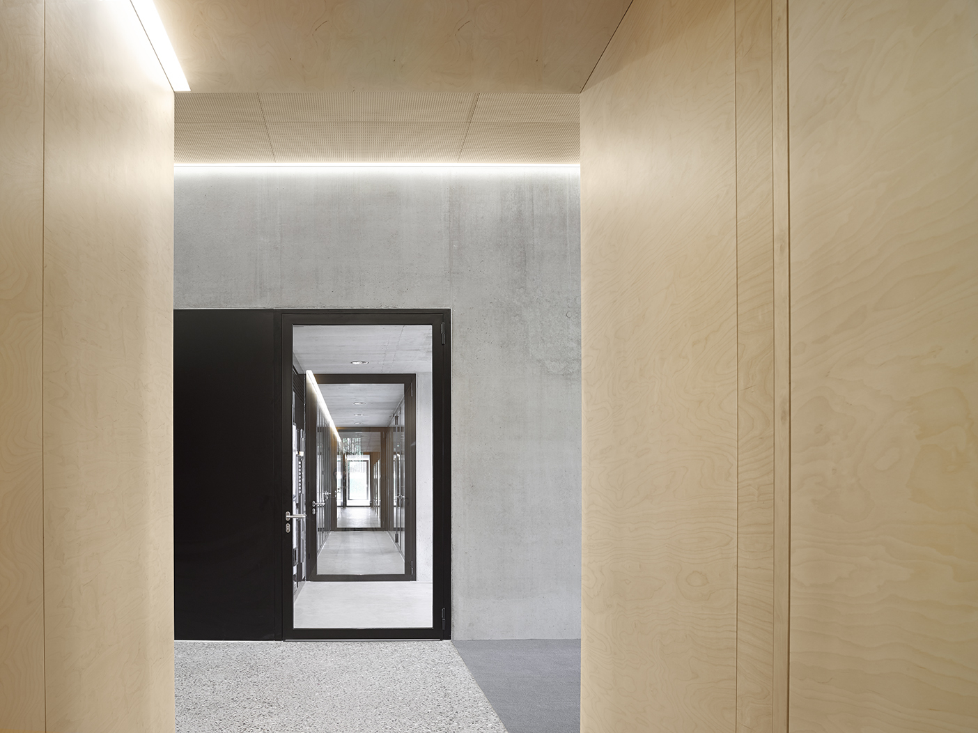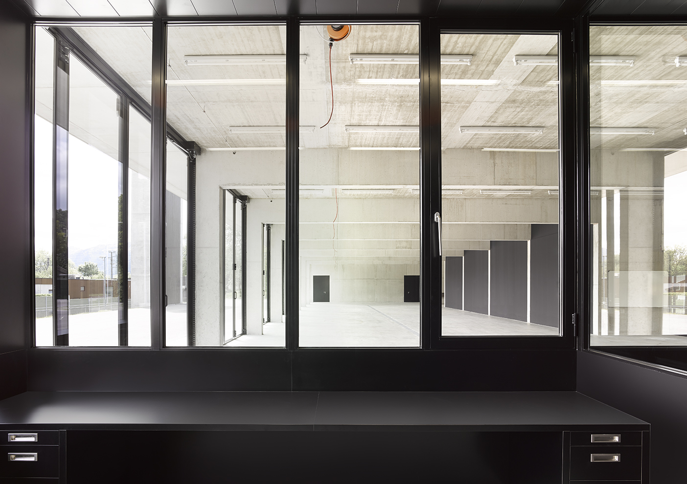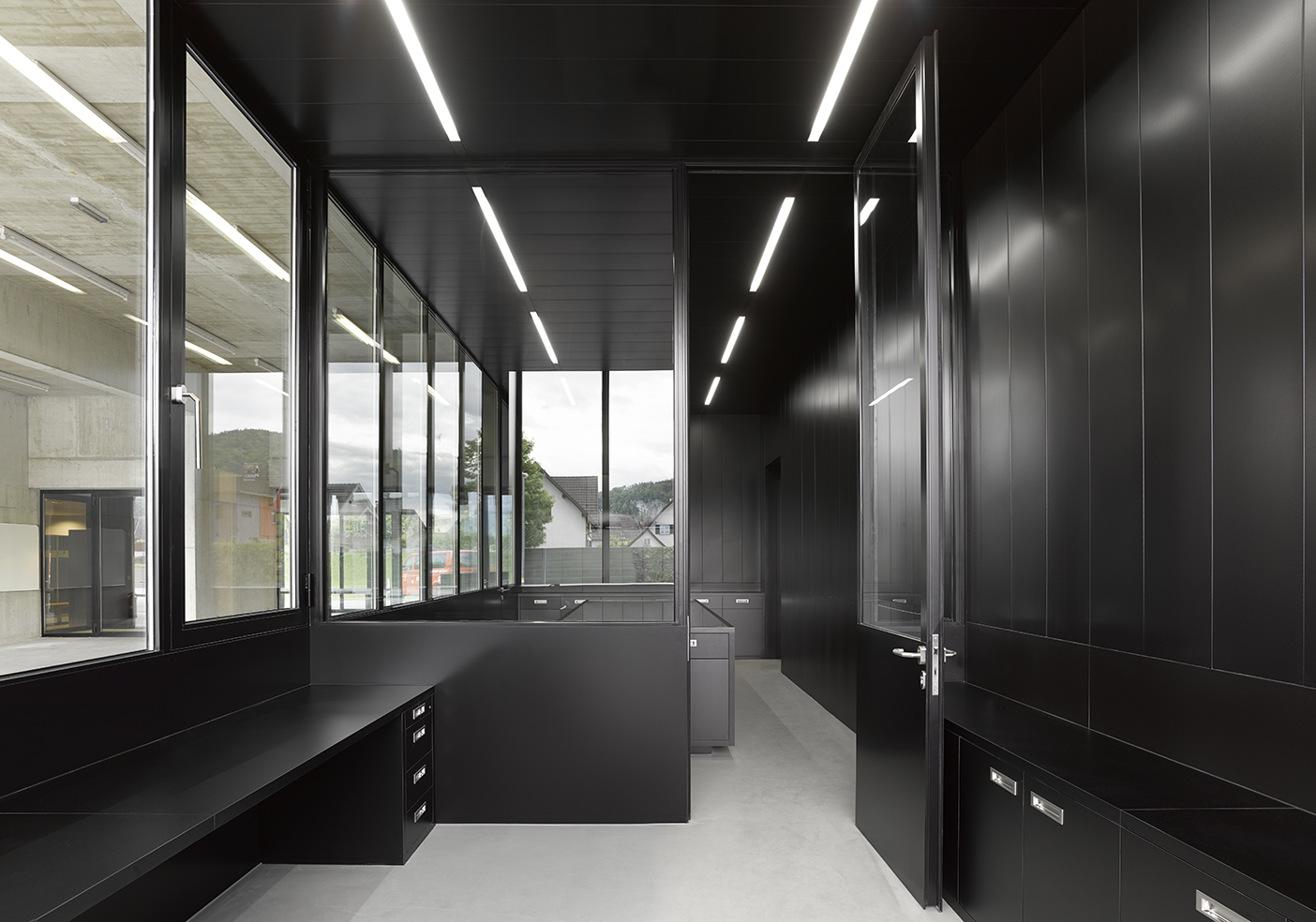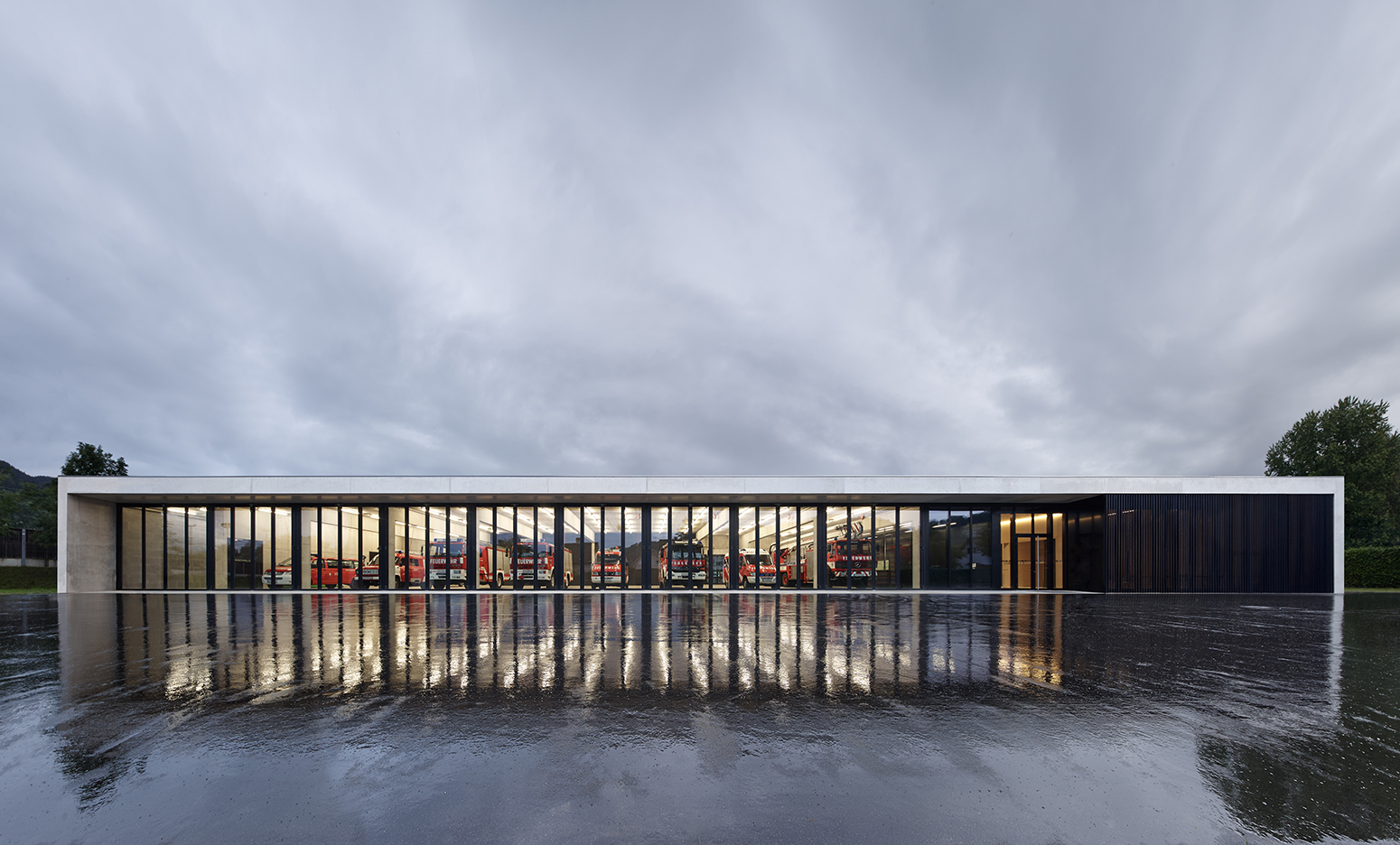Cukrowicz Nachbaur Architekten fahren eine gestalterische Linie zwischen der kaum hoch genug zu lobenden Handwerkskunst Vorarlbergs und Schweizerischer Präzision, ohne dabei jedoch in die protestantische Freudlosigkeit der westlichen Nachbarn abzugleiten " deren Reduktionismus mittlerweile gerne einmal zum Selbstzweck verkommt. Zur Klarheit der Gestalt gehört auch die Klarheit der Konzeption; und so verwundert es nicht, dass sich der ursprünglich für ein Grundstück mitten im Ort gedachte Entwurf mit geringen Anpassungen leicht für eine viel verkehrsgünstiger gelegene Stelle direkt an der Autobahnauffahrt adaptieren ließ: durch simple Spiegelung der Grundrisse. Eine durchgehende Foyerzone trennt den »sauberen« Verwaltungs- und Schulungsbereich vom »Notfallbereich« mit Fahrzeughalle, Umkleide, Werkstätten und Lagern ab. Obwohl stark überlängt entfaltet dieser helle, mit seinem zum Verwaltungstrakt hin mit finnischem Birkensperrholz bekleidete und angenehm proportionierte Flurraum eine enorme Aufenthaltsqualität. Man hat an Schallschluckflächen gedacht und sich viel Mühe gegeben, alle Materialstöße bündig auszuführen. So wird der Raum, wie auch einige andere im Haus, über deckenbündige Leisten beleuchtet, deren Licht die Materialität der Wände hervortreten lässt und keine dunklen Ecken duldet. Die Präzision, mit der hier vorgegangen wurde, lässt weniger an Ordnungszwang als vielmehr an den enormen Tüftlerspaß denken, den Planer und Ausführende sichtlich hatten. Mit einigem Stolz weist der Projektleiter Michael Abt auf die selbst entworfenen, trickreich durchdachten Stauraummöbel im Büro hin. Und er freut sich, dass er einen Betrieb auftun konnte, der sich den Einbau raumhoher Fenstertüren im Sitzungssaal zutraute. Denn so ließen sich störende Kämpfer vermeiden und der noble Charakter der hohen Formate erhalten. Die edle Anmutung und hochwertige Ausstattung von Saal und angrenzender Notfallküche wecken Begehrlichkeiten im Ort, und so sprach die Feuerwehr ein generelles Nutzungsverbot aus, um die Räume zweimal wöchentlich für Schulungen, für Versammlungen und v. a. für unplanbare Notfälle und Katastropheneinsätze zur Verfügung zu haben. Allein dem Gemeinderat wurde zugestanden, seine Sitzungen hier quartalsweise abzuhalten.
