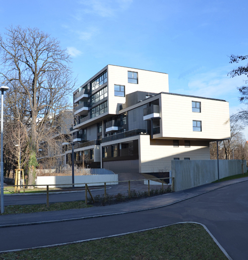 Grundgedanke des aus diesem Wettbewerb hervorgegangenen Projekts von Johann Obermoser ist die Idee der gestapelten Stadtvilla, die eine zentrumsnahe Alternative zum Einfamilienhaus bieten soll. Relativ mittig am Grundstück und parallel zum Sillkanal wurde ein mit Vor- und Rücksprüngen und unterschiedlichen Höhen differenziert aufgelösten Riegel platziert. Verteilt auf sechs individuell erschlossene Baukörper sind jeweils zwei- bis dreistöckige Einheiten übereinandergeschichtet, deren Einzelhauscharakter durch die Fassadengestaltung, die sich auch über die Untersichten zieht, unterstrichen wird.