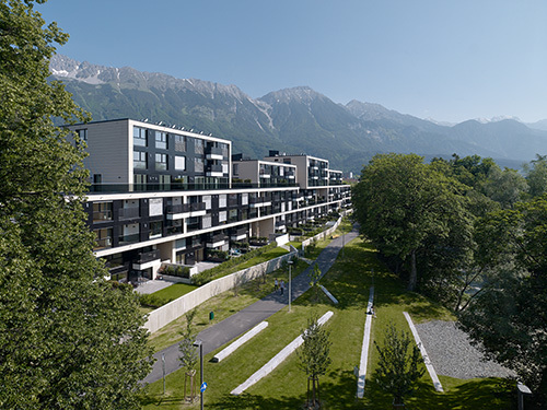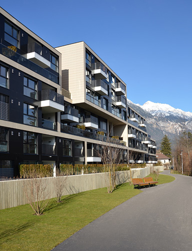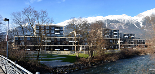 Erschlossen werden die Einzelhäuser an der Westseite entlang des Damms des Sillkanals über sechs zentrale Stiegenhäuser. Ursprünglich waren rund 80 Wohnungen in einer Vielzahl von Grundrissvarianten geplant, in der Umsetzung mussten auf Wunsch des Bauherren wesentlich mehr und dafür kleinere Wohnungen vorgesehen werden. Die nunmehr rund 100 Einheiten sind zum Großteil nach Süd-Ost bzw. Westen ausgerichtet und mit zum Teil großen uneinsichtigen Privatbereichen ausgestattet – insbesondere die ganz oben liegenden Loft-Wohnungen mit 360° Rundum-Blick. (Text: Claudia Wedekind)