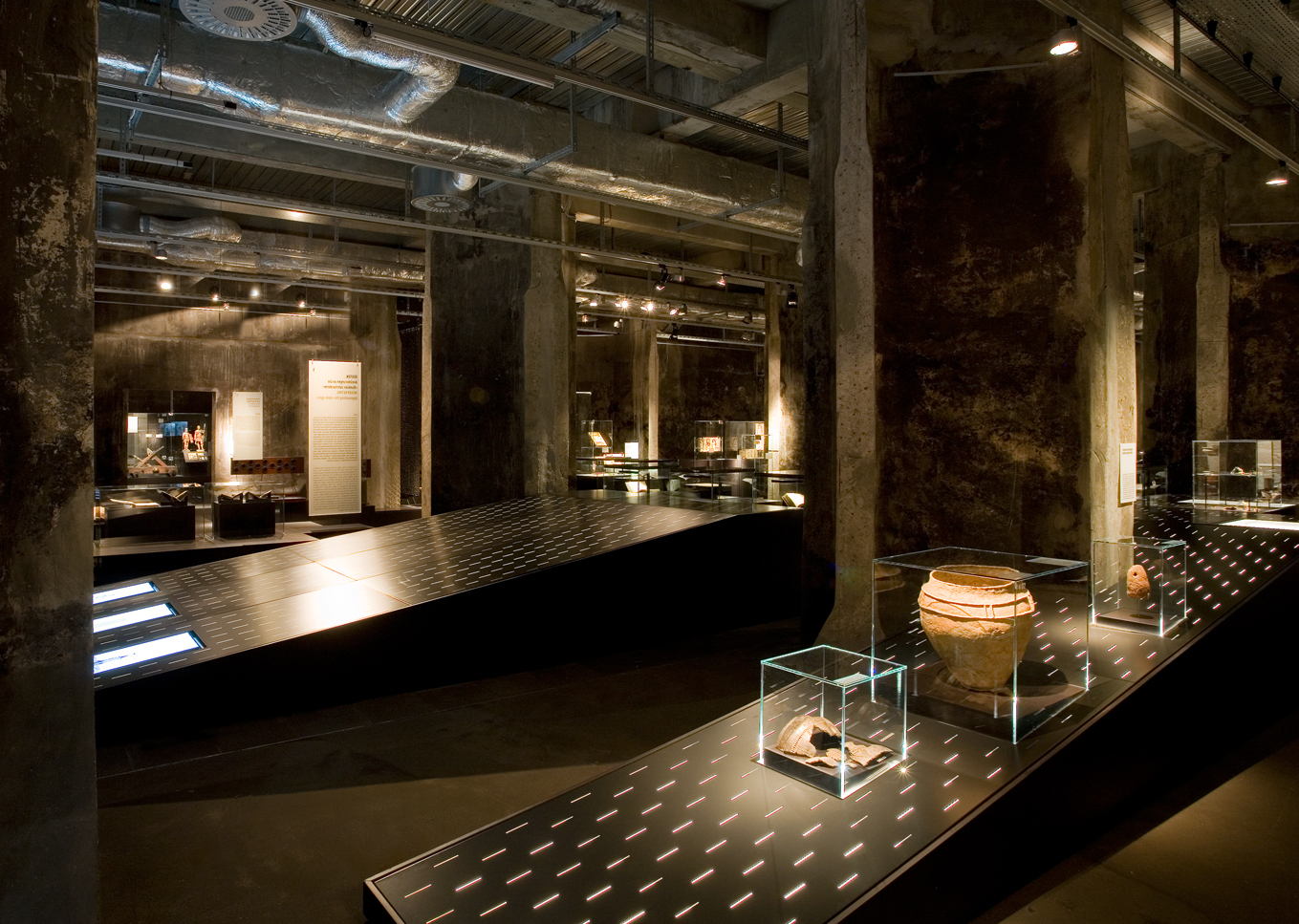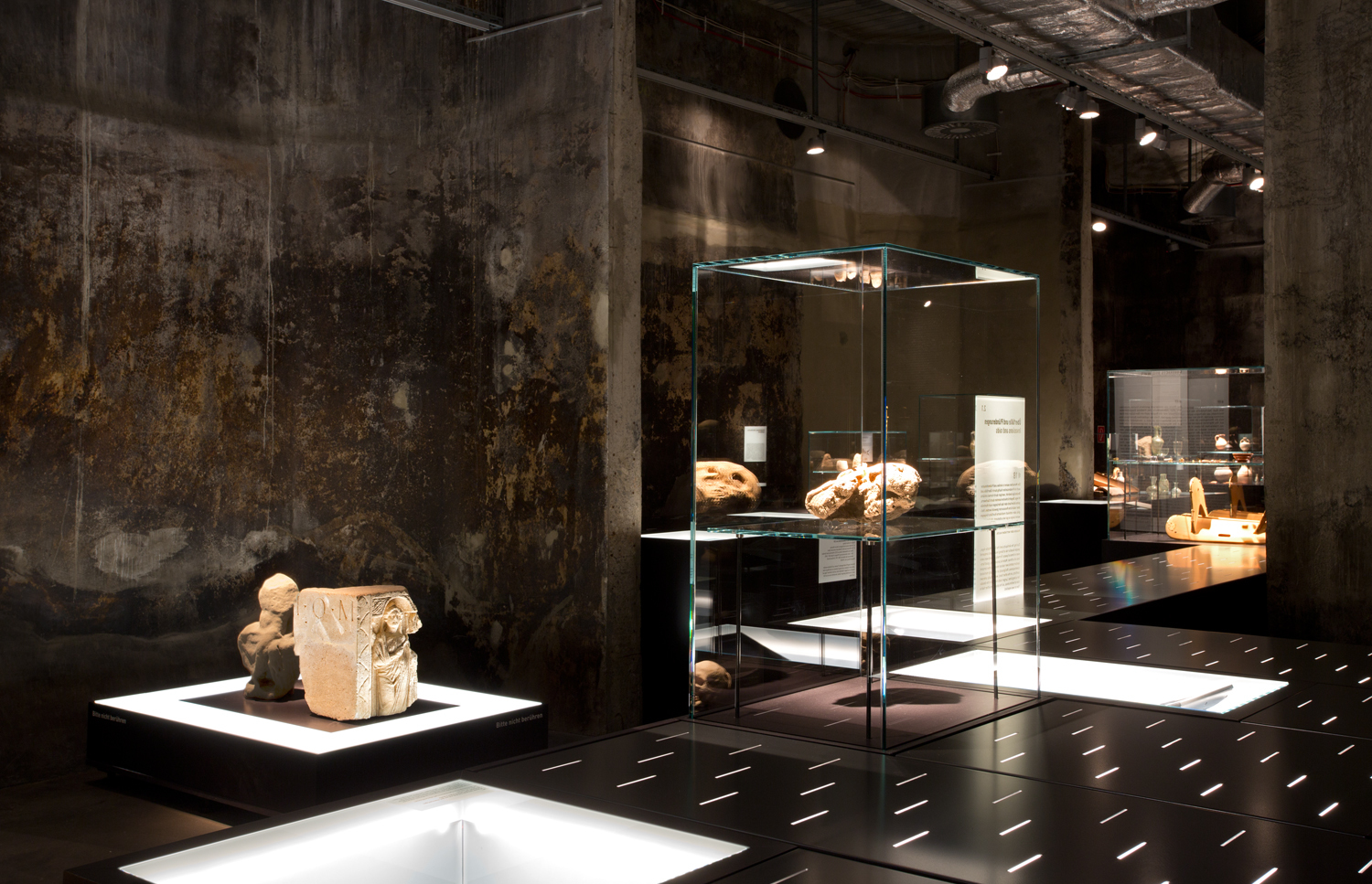 Die beiden Raumhälften sind unterschiedlich strukturiert. Auf der rechten Seite, wo Objekte aus der Archäologie gezeigt werden, ist der Parcours als gewundener Weg ausgebildet. Für die häufig kleinen, fragmentarischen, jedoch lichttechnisch unempfindlicheren Exponate aus archäologischen Grabungsfunden wurden „introvertierte“, zur Umgebung abgegrenzte Betrachtungsbereiche geschaffen. Die Exponate sind in die Podestelemente eingesenkt oder ragen als hell ausgeleuchtete Objektgruppen in turmartigen Vitrinen aus den Podestflächen.