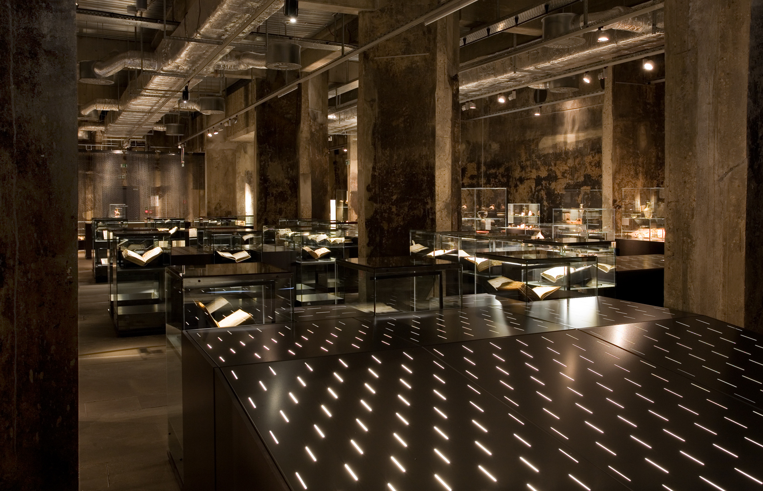 Ein Raster aus Lichtpunkten zieht sich durch die gesamte Ausstellung. Das aus lasergeschnittenen, länglichen Schlitzen hinterleuchteter Stahlpaneele austretende Licht schafft ausgedehnte helle Zonen in dem aus konservatorischen Gründen abgedunkelten Raum.