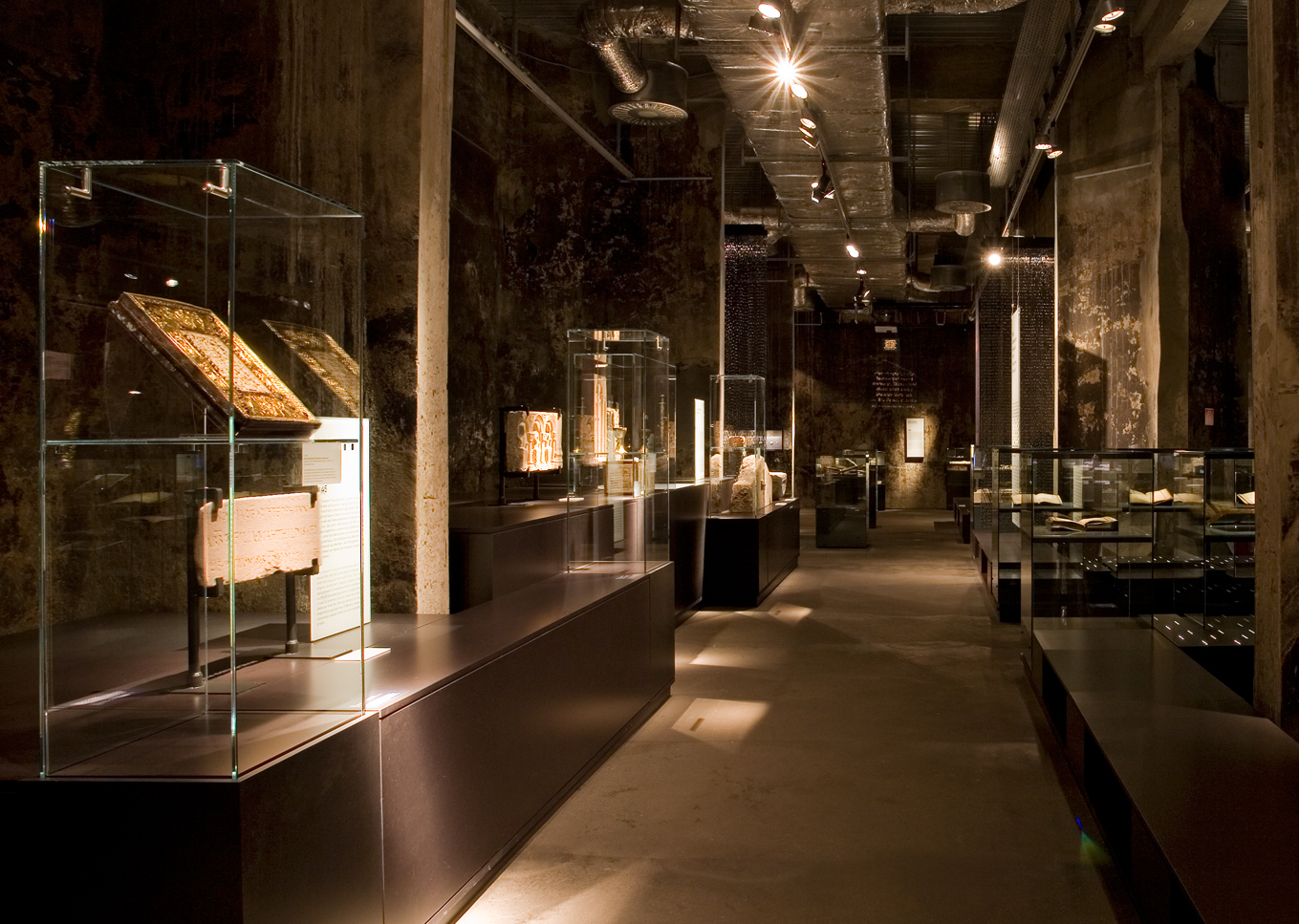 Auf der linken Raumseite werden frühmittelalterliche Objekte in einer streng geometrischen Struktur, auf langgestreckten, parallel geführten Podesten als Einzelstücke präsentiert. Winkelförmige Abzweigungen führen in die Raummitte, wo die ersten Handschriften aus der Region - in Einzelvitrinen aus Beständen des Ruhr Museums, auf gemeinsamen Plattformen gruppiert - gezeigt werden.