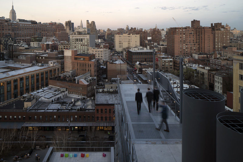 Auf der anderen Seite geht er über Dächer voller Klimaanlagekästen, über gelbe Taxis und das pulsierende Straßengewirr im Westen Manhattans aufs Empire State Building. Links ein Hotel namens Standard, das über den Hochbeeten der High Line aufragt wie das aufgeschlagene Buch eines Riesen. Davor die Laderampe von Weichsel Beef, ein einsamer Beweis dafür, dass hier einmal in großem Stil Vieh zerlegt wurde. Überall Baukräne. Und Reklameposter, die für millionenteure Eigentumswohnungen werben. Direkt am Whitney endet die High Line, eine Bahnlinie, auf der von 1934 bis 1980 Güterzüge verkehrten. Rudy Giuliani, ein Bürgermeister, der die rostige Ruine als Schandfleck empfand, wollte sie abreißen lassen.