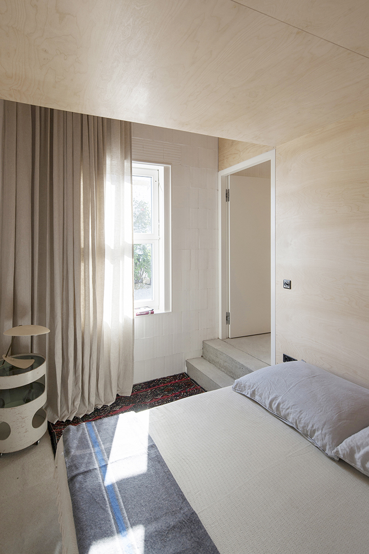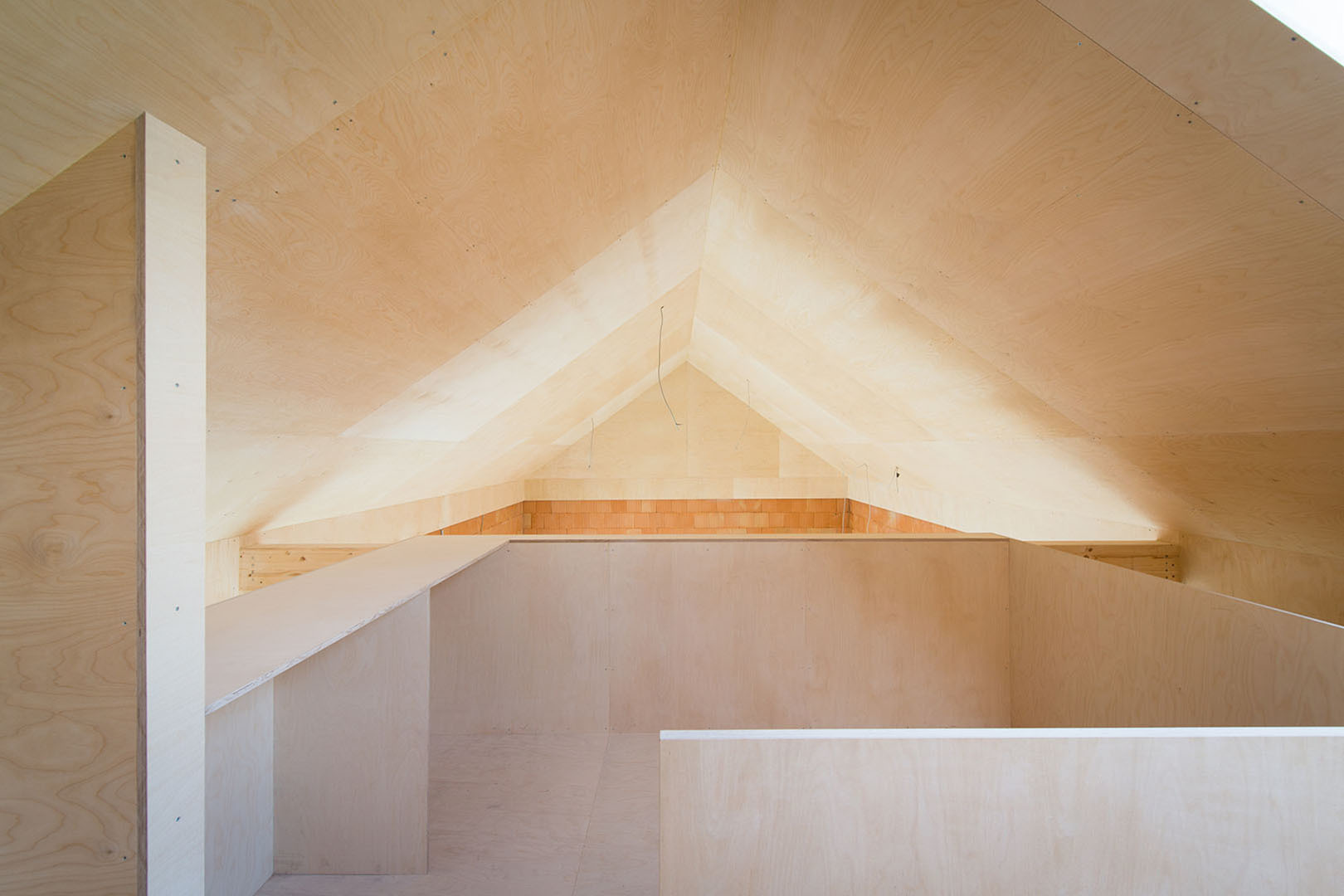 Dusche, WC und Schlafzimmer sind geschlossene Raume, bei denen man die Tür hinter sich zumachen kann; der vom Dachbalken abgehängte Balkon des Schlafdecks und die darunterliegende Sitznische sind artikulierte, privatere Bereiche des großen Raumes, der öffentlichste Raum ist die Küche mit dem großen Esstisch, von der man direkt in den Garten kommt. Durch die große Faltschiebetür und die unmittelbare Verbindung zum Garten wird der Küchenbereich zu einem Zwischenstück zwischen Innen und Außen, zu einer Loggia, mit dem Garten als einem daran anschliessenden Raum des Hauses.