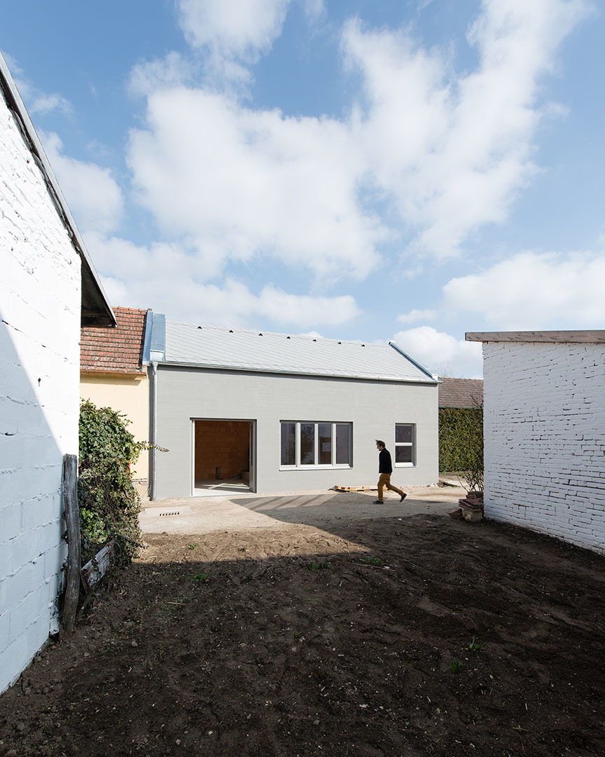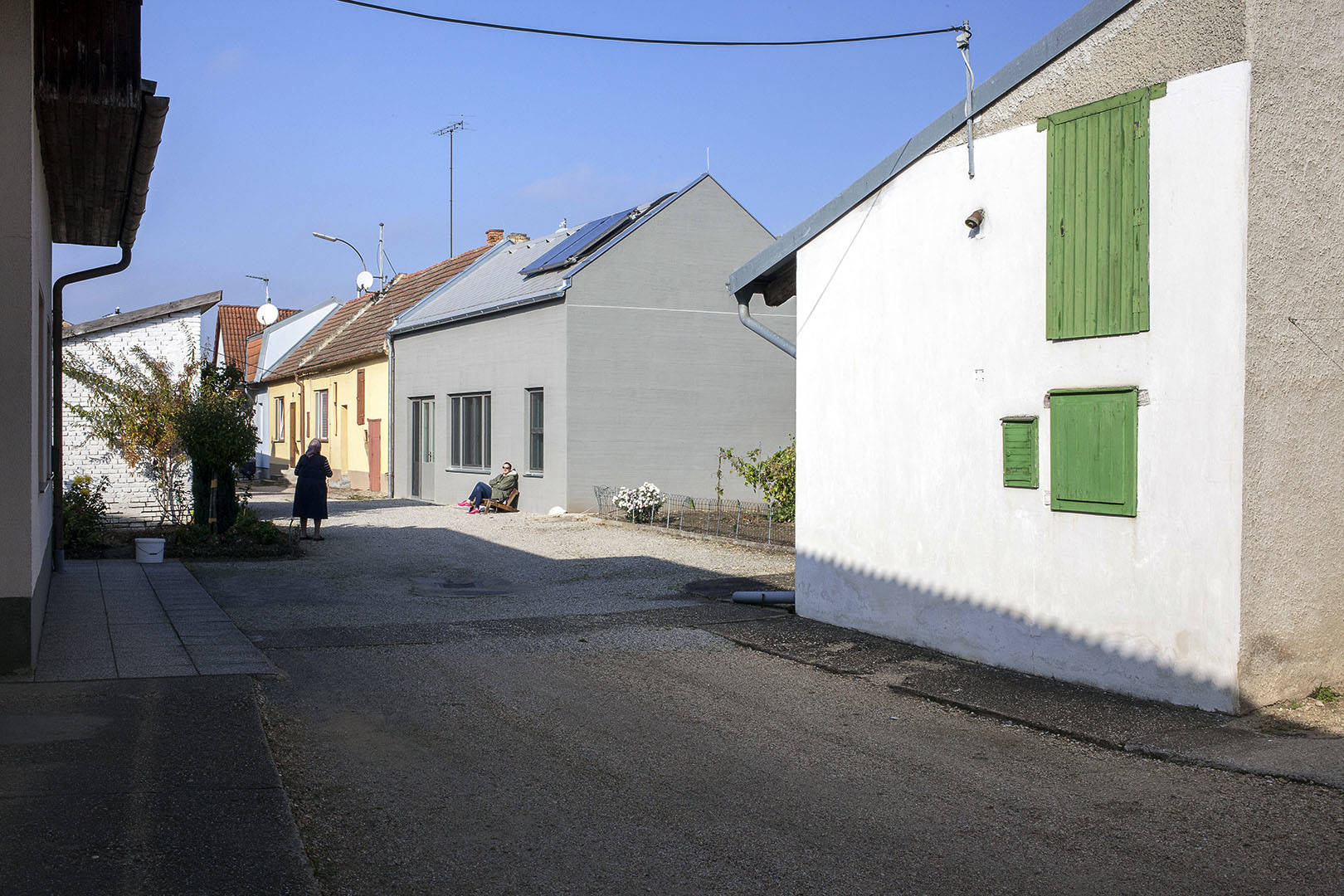 Trotz des Unspektakulären, sogar Banalen der einzelnen Gebäude, ist ihr Zusammenwirken ansprechend. Die Wahl der Bauherren ist, denke ich, weniger auf das Objekt selbst als auf das Ensemble gefallen, den Chor. Gemeinsam mit den Bauherren wurden daher zwei Entscheidungen getroffen: einerseits mit dem Neubau innerhalb des Volumens des alten Stadls zu bleiben und andererseits nach außen hin genauso unauffällig und anonym aufzutreten wie die Nachbarshäuser, dem Chor ein weiteres Mitglied hinzuzufügen.